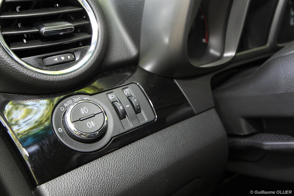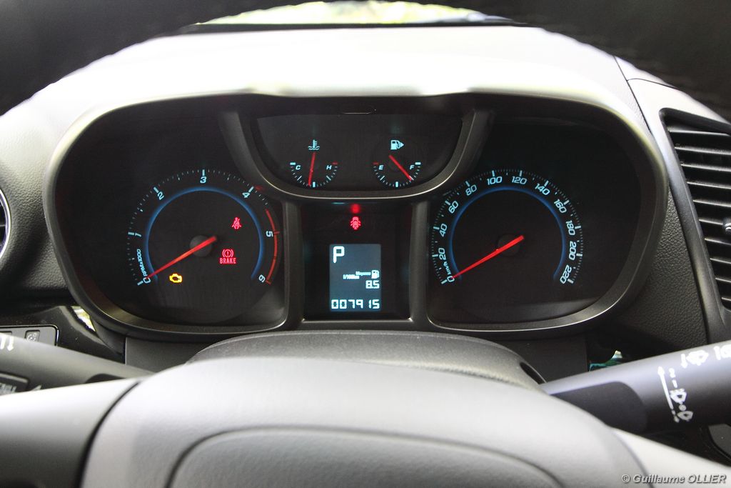 L’originalité est de mise à l’intérieur de cet Orlando. La planche de bord, fluide, est positionnée assez haute. Elle intègre des éléments brillants noir laqué et quelques touches de chrome sont incrustées dans le volant et le levier de vitesse. Contrairement à la Cruze les plastiques sont durs mais la qualité des matériaux est en net progrès, quelques assemblages semblent tout de même irréguliers. Le combiné d’instrumentation est très lisible, et de nuit un rétro-éclairage bleuté accompagne les compte-tours. Sur la console centrale, le combiné d’autoradio est réversible, il cache un rangement et les connexions USB et Jack. C’est astucieux, par exemple pour entreposer des objets de valeur, mais si vous souhaitez brancher votre téléphone le câble gênera la fermeture. Au passage précisons