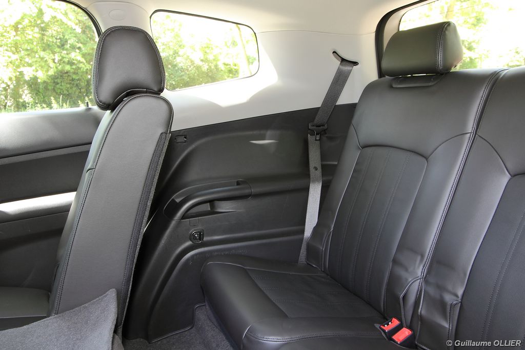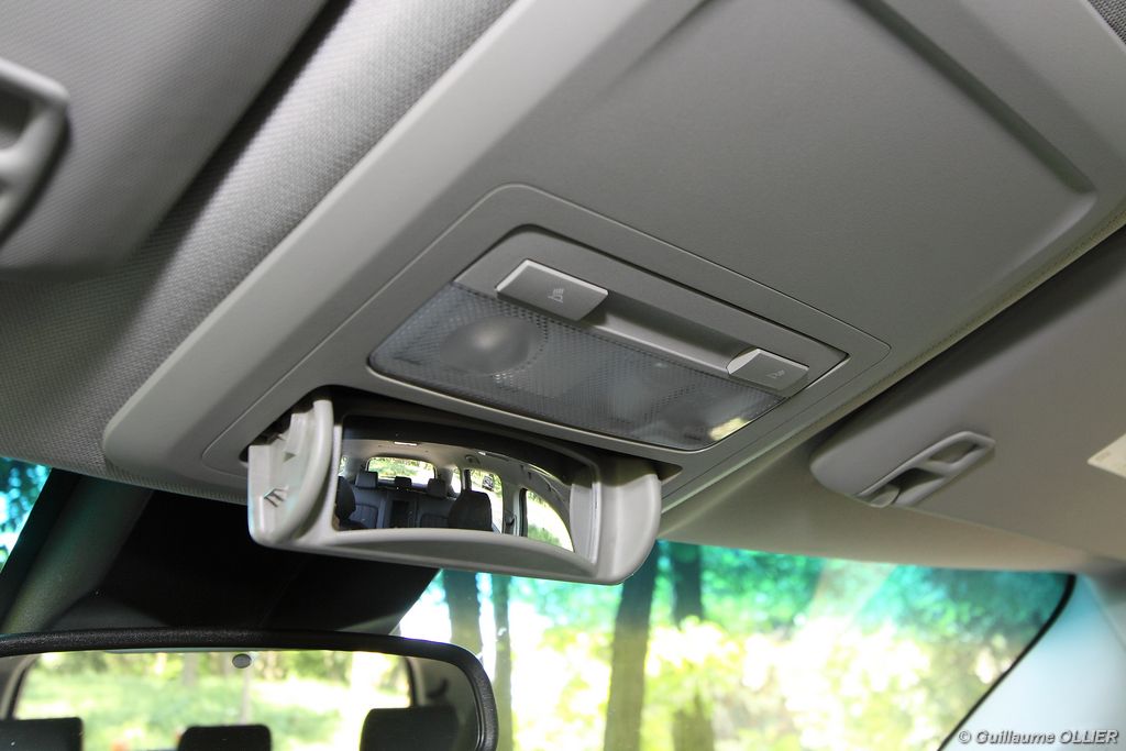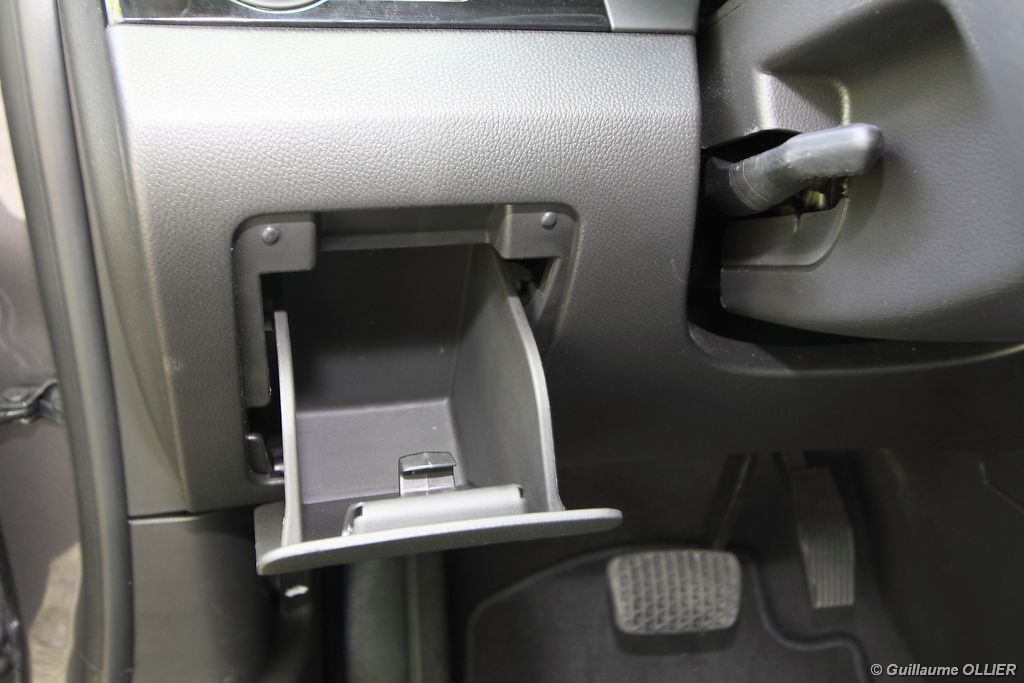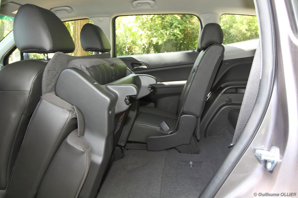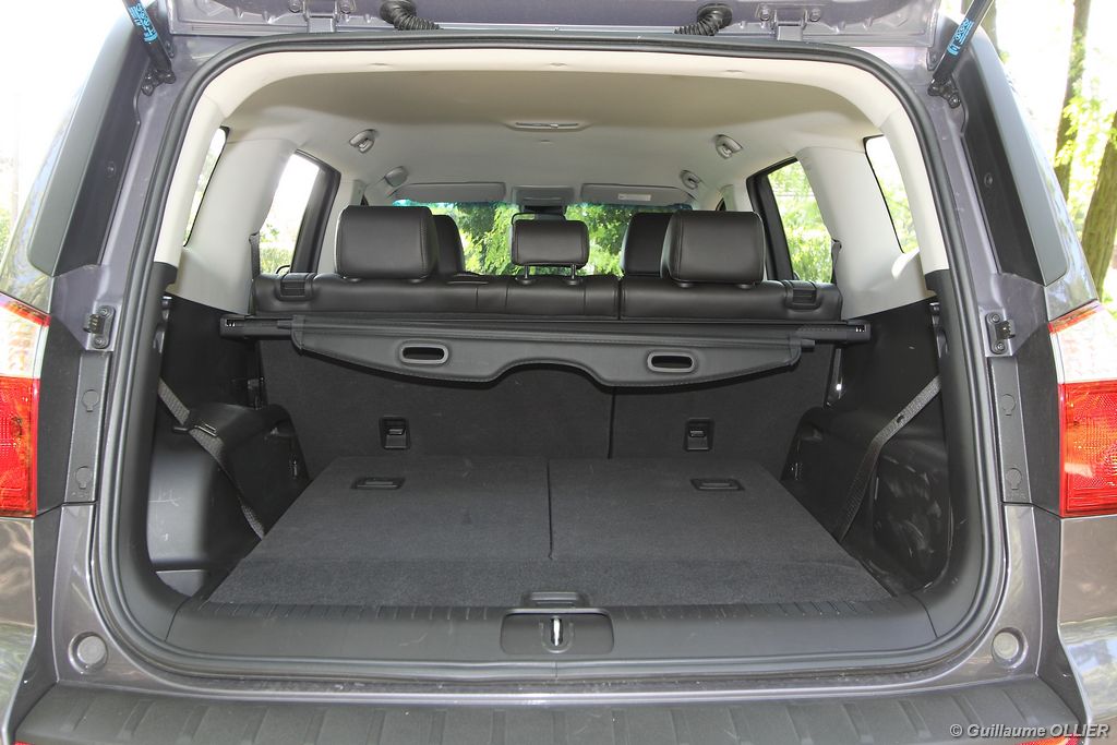 que le système audio permet de piloter directement la musique pour les iPod. Globalement l’ergonomie est bonne, même s’il faudra allonger le bras pour atteindre certaines commandes. Notons également que l’écran du GPS est bien placé, celui-ci est doté d’une cartographie bien présentée et précise. Sur autoroute, la partie gauche de l’écran présente même les aires d’autoroute à venir. Petite attention aux parents, un miroir permettant de surveiller les enfants à l’arrière se situe dans le plafonnier. Pour les utilisateurs de miroirs de courtoisie, ne vous attendez pas à voir s’éclairer une lumière, c’est absent au programme. Autre point négatif, les vitres électriques sont à impulsion uniquement pour la descente. Petit détail qui peut vite devenir agaçant. Au chapitre habitabilité l’espace offert est très agréable, aussi bien à l’avant qu’à l’arrière. Le deuxième rang ne dispose pas de siège individuel mais d’une banquette, dommage qu’elle ne puisse pas coulisser. Le dossier est toutefois réglable en inclinaison. Avec une assise 4 cm plus haute que les sièges avant, les enfant voient un peu mieux la route. L’habitabilité est donc généreuse à l’arrière, avec notamment une bonne garde au toit. Disponibles de série, deux sièges escamotables sont encastrés dans le coffre offrant ainsi un plancher plat. Ils se montrent simples à mettre en œuvre et l’accès est ingénieux, il suffit de tirer une poignée sur un des sièges de deuxième rang et celui-ci se replie sur lui-même facilitant ainsi la montée. L’espace est généreux et un adulte peut s’y loger sans problème ce qui n’est pas le cas chez la plupart des concurrents. Le volume du coffre est de seulement 454 litres en configuration 5 places et 852 litres sièges rabattus. Un Renault Grand Scenic moins long fait nettement mieux avec une contenance de 564 à 2 063 litres ! De plus l’espace entre le cache bagage et le plancher est réduit, quand au seuil de chargement, il est placé haut. Enfin, les rangements à bord sont pauvres avec seulement quelques emplacements, comme un vide poche côté conducteur et entre les sièges avant, les bacs de contreportes, et une trappe tout en longueur à l’arrière du coffre.