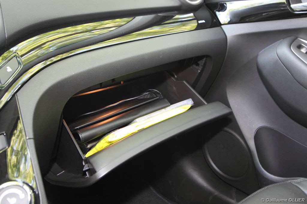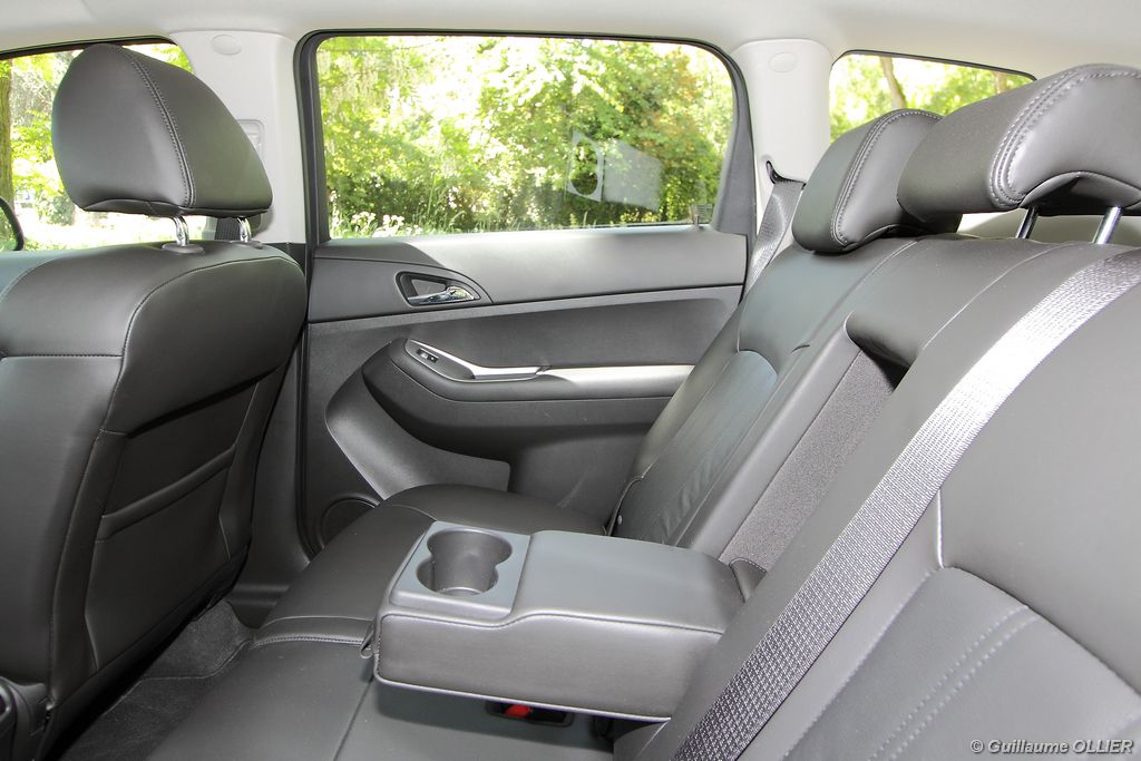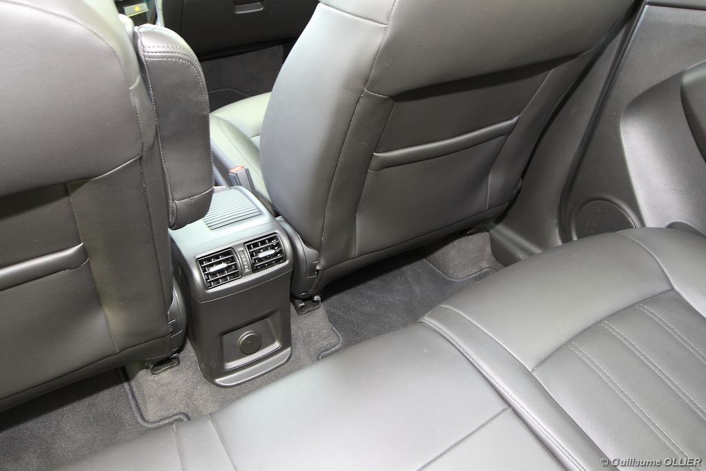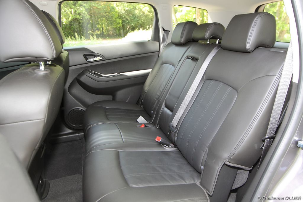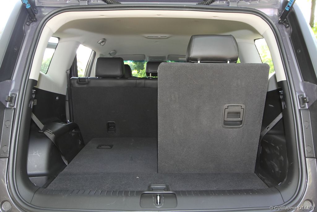 que le système audio permet de piloter directement la musique pour les iPod. Globalement l’ergonomie est bonne, même s’il faudra allonger le bras pour atteindre certaines commandes. Notons également que l’écran du GPS est bien placé, celui-ci est doté d’une cartographie bien présentée et précise. Sur autoroute, la partie gauche de l’écran présente même les aires d’autoroute à venir. Petite attention aux parents, un miroir permettant de surveiller les enfants à l’arrière se situe dans le plafonnier. Pour les utilisateurs de miroirs de courtoisie, ne vous attendez pas à voir s’éclairer une lumière, c’est absent au programme. Autre point négatif, les vitres électriques sont à impulsion uniquement pour la descente. Petit détail qui peut vite devenir agaçant. Au chapitre habitabilité l’espace offert est très agréable, aussi bien à l’avant qu’à l’arrière. Le deuxième rang ne dispose pas de siège individuel mais d’une banquette, dommage qu’elle ne puisse pas coulisser. Le dossier est toutefois réglable en inclinaison. Avec une assise 4 cm plus haute que les sièges avant, les enfant voient un peu mieux la route. L’habitabilité est donc généreuse à l’arrière, avec notamment une bonne garde au toit. Disponibles de série, deux sièges escamotables sont encastrés dans le coffre offrant ainsi un plancher plat. Ils se montrent simples à mettre en œuvre et l’accès est ingénieux, il suffit de tirer une poignée sur un des sièges de deuxième rang et celui-ci se replie sur lui-même facilitant ainsi la montée. L’espace est généreux et un adulte peut s’y loger sans problème ce qui n’est pas le cas chez la plupart des concurrents. Le volume du coffre est de seulement 454 litres en configuration 5 places et 852 litres sièges rabattus. Un Renault Grand Scenic moins long fait nettement mieux avec une contenance de 564 à 2 063 litres ! De plus l’espace entre le cache bagage et le plancher est réduit, quand au seuil de chargement, il est placé haut. Enfin, les rangements à bord sont pauvres avec seulement quelques emplacements, comme un vide poche côté conducteur et entre les sièges avant, les bacs de contreportes, et une trappe tout en longueur à l’arrière du coffre.