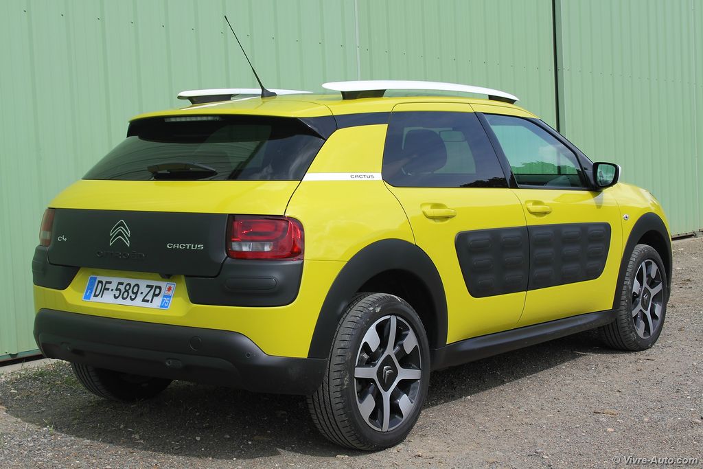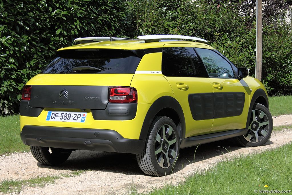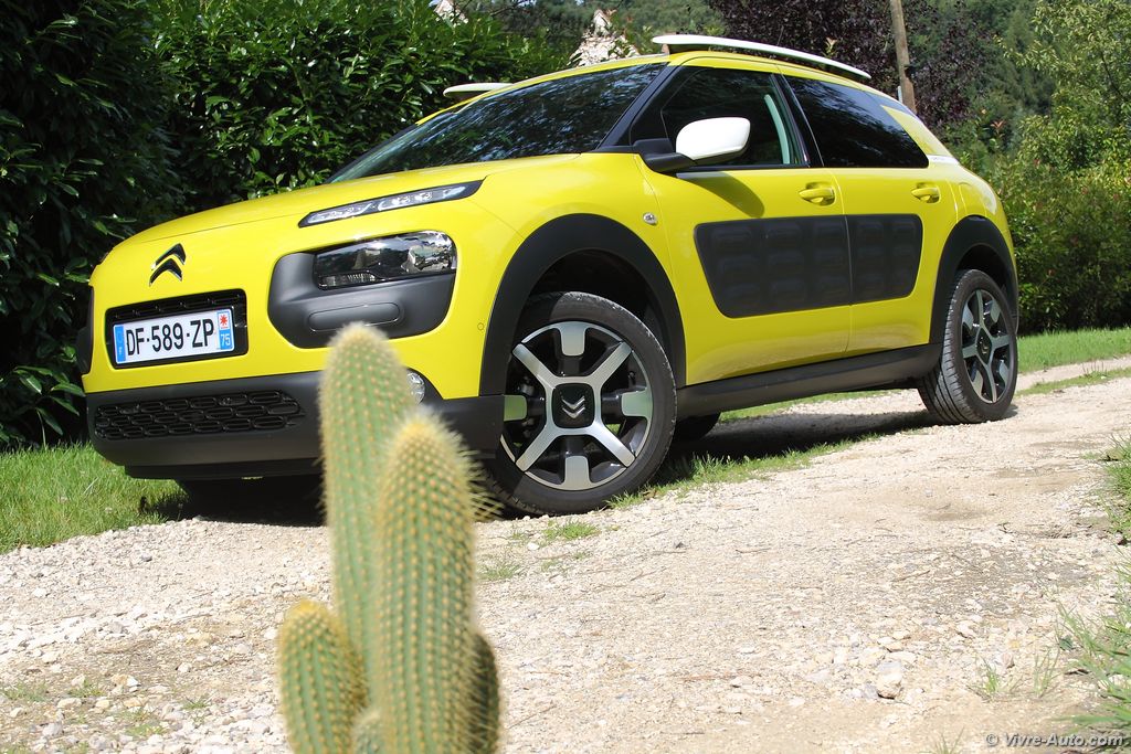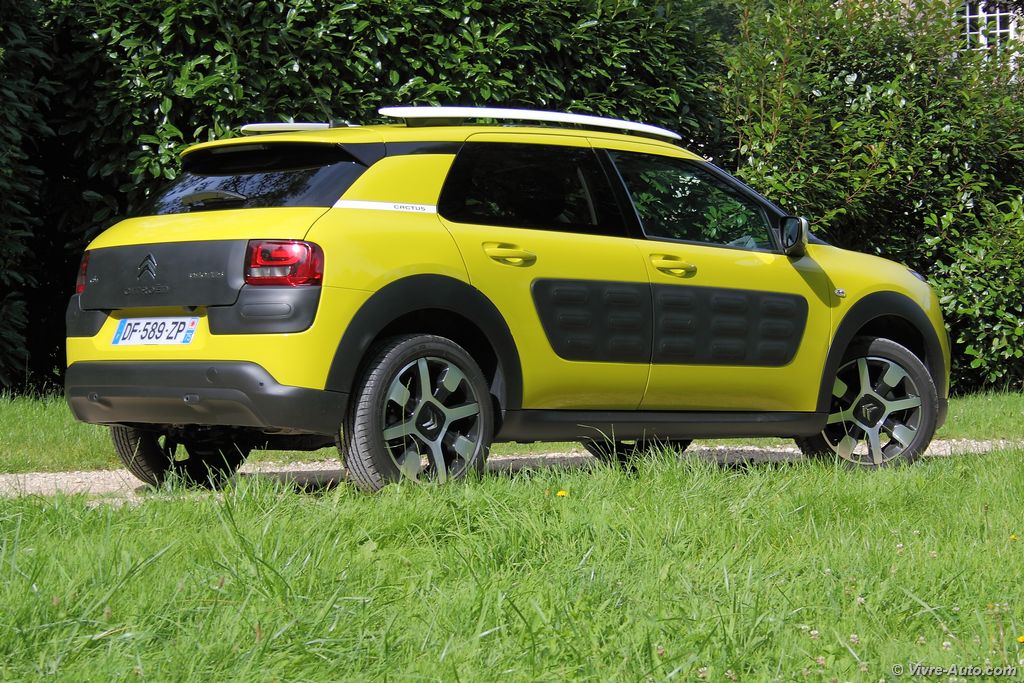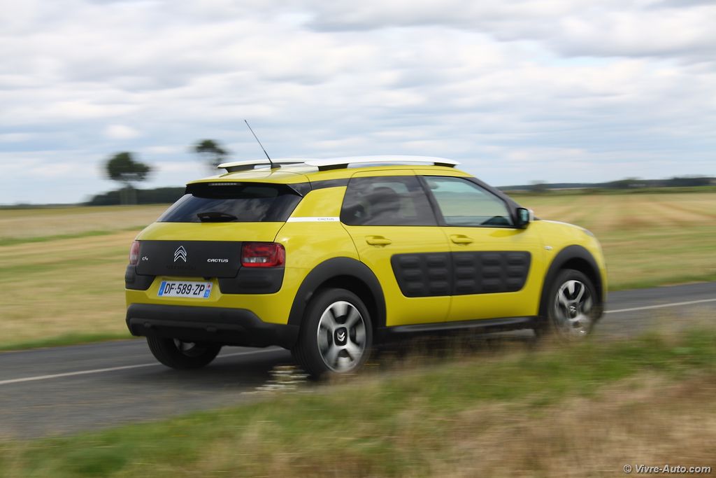 Le Citroën C4 Cactus est proposé avec trois moteurs essence, les PureTech de 75 ch, 82 ch, 110 ch et deux Diesel, HDi 92 ch et BlueHDi 100 ch. Notre essai s’est porté sur le PureTech 100 ch qui commence sa carrière chez PSA justement sur le Cactus. Ce bloc trois cylindres 1,2 l développe 110 ch à 5.500 tr/mn et un couple de 205 Nm à 1.500 tr/mn. Avec seulement 1.020 kilos sur la balance, notre modèle épineux est animé avec brio par cette motorisation. Le turbo délivre un couple suffisant dès le début de la courbe de régime et les reprises sont correctes malgré une boîte aux rapports longs. En ville comme sur route ce moteur nous a convaincus, et la surprise n’est pas finie. Annoncée à 4 l/100 km par le constructeur, la consommation moyenne de notre essai s’est révélée aux alentours de 6 l/100 km. C’est une excellente note au vu des performances. Seul bémol, le Stop&Start engendre quelques vibrations mais on s’y habitue vite. Qu’en est-il du comportement routier ? Encore une fois, grâce à sa modeste charge, notre Cactus s’est montré très agile avec très peu de roulis en virage. Bien sûr il ne s’agit pas d’un véhicule à connotation sportif et moins dynamique qu’un Peugeot 2008 mais pour autant sécurisant. Le freinage est bon et la direction très précise.