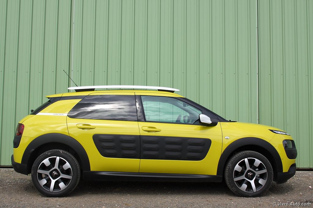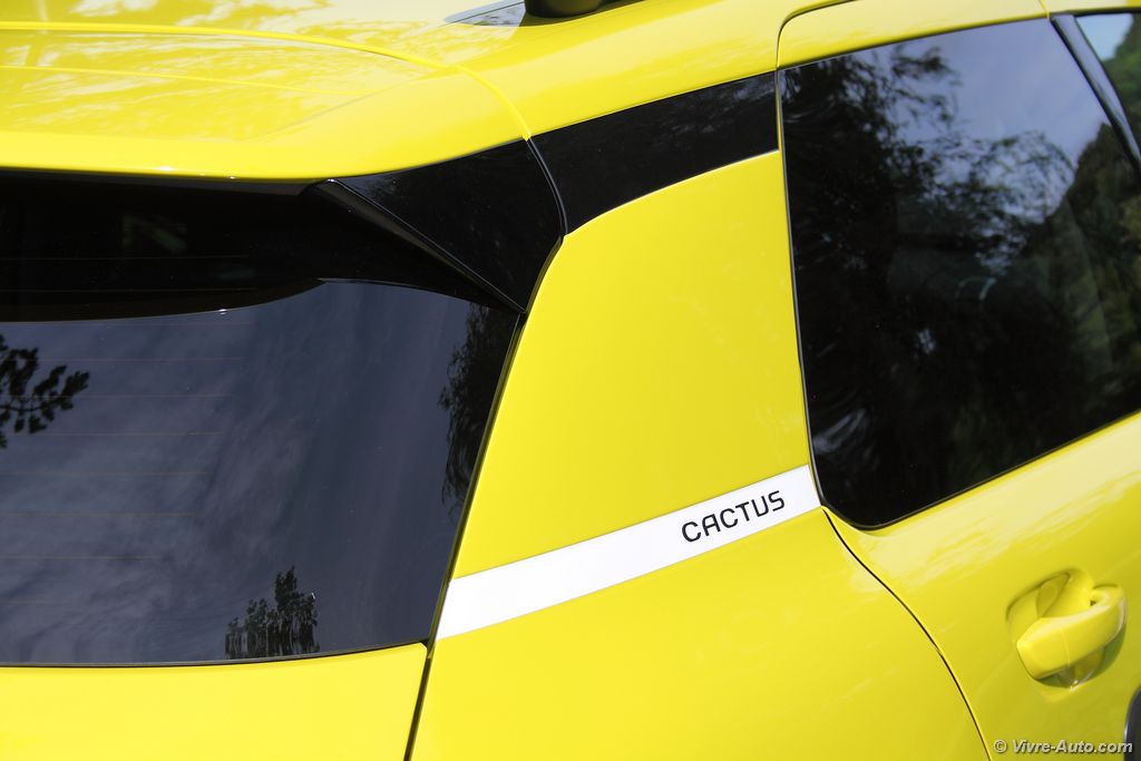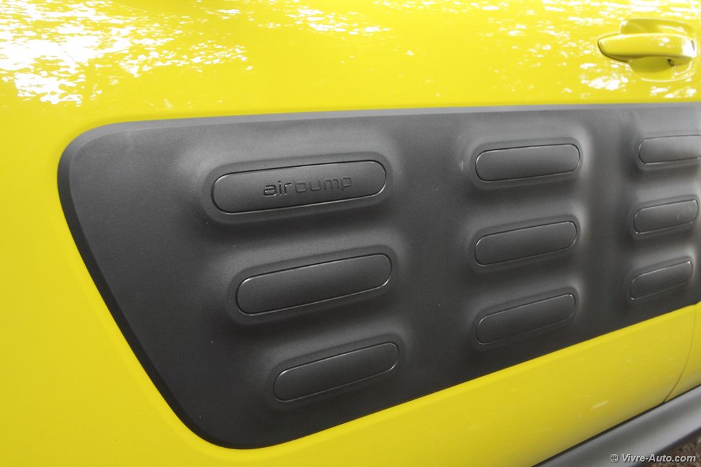 forte présence. Des feux de jour à LED placés haut comme sur le Picasso, des passages de roues marqués et surtout ce qui le caractérise le plus, de drôles de protections en plastiques disponibles en quatre teintes. Il aura fallu trois ans d’études et dix brevets pour concevoir ces AirBump qui devront résister tout au long des années. Et il faut dire que c’est réussi, ça ne surcharge en rien le style de la voiture et lui offre une teinte bi-tons. Fini les coups de porte désagréables des parkings… Basé sur la plateforme de la Peugeot 2008 et non de la C4, ce Cactus affiche un poids plume. La première version du catalogue ne dépasse même pas la tonne !