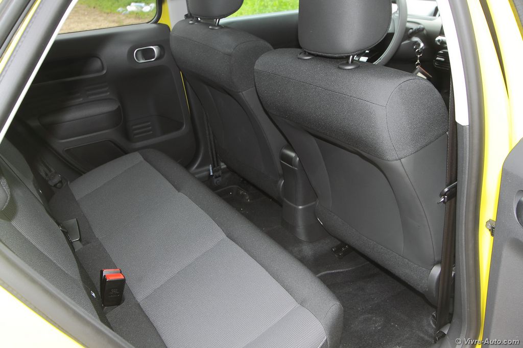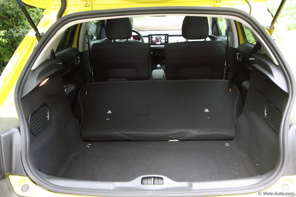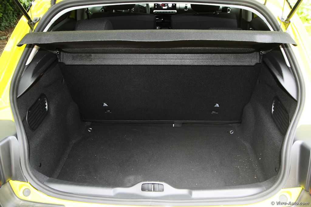 L’objectif d’obtenir un poids réduit sur la balance entraîne quelques concessions. Et c’est la modularité et la vie à bord qui en font les frais. Les passagers arrière ne peuvent malheureusement pas baisser leurs vitres mais seulement les entrebâiller de quelques centimètres comme sur une voiture trois portes. La banquette arrière est quant à elle en un seul bloc et les assises sont fixes. Elle se rabat quand même, mais n’offre pas plus de possibilité que ça. Pour les couples avec un enfant il faudra oublier le transport d’objets longs. Le coffre offre un volume de chargement généreux de 348 litres, son accès est difficile en raison d’un seuil de chargement placé haut, une double ouverture aurait été idéal. Mais si ces éléments ne sont pas essentiels pour vous, le C4 Cactus vous séduira car il répond aux exigences des clients avec un habitacle fonctionnel, une facilité d’accès aux commandes et une multitude de rangements.