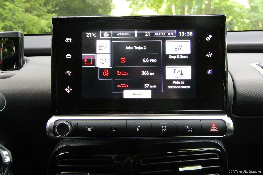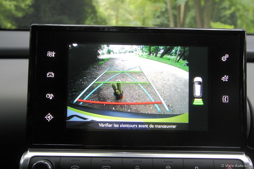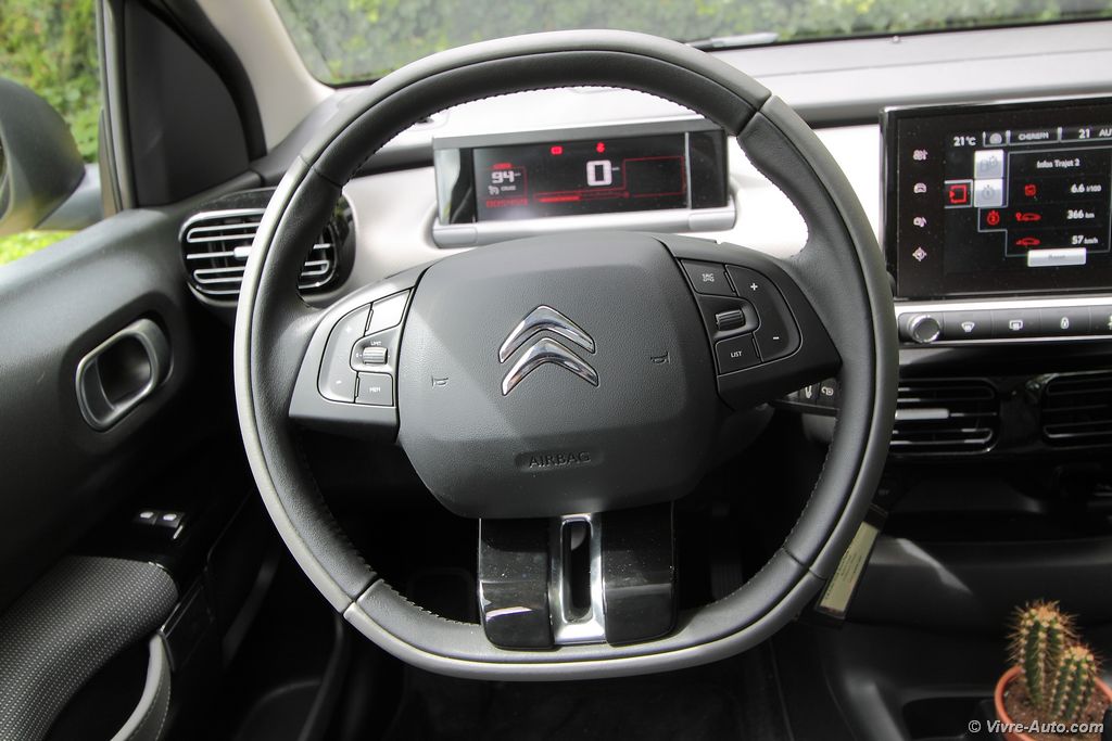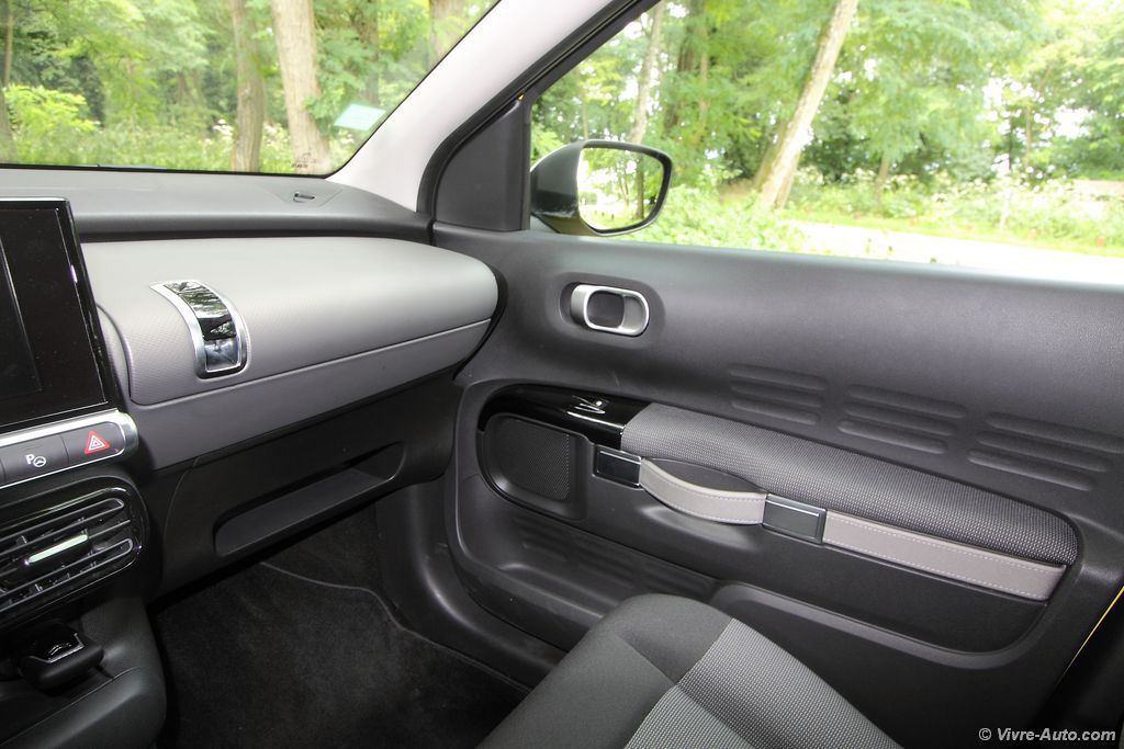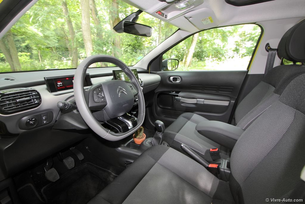 L’intérieur est tout aussi original. Les passagers sont accueillis par de larges sièges moelleux en velours très bien conçus. En version boîte automatique, ils se rejoignent façon banquette pour plus de convivialité. On ressent un sentiment d’espace à bord de ce Cactus. Très épurée et plutôt bien finie, la planche de bord accentue cette impression. Un grand écran tactile multimédia de 7 pouces livré de série sur tous les modèles regroupe l’ensemble des commandes audios, de navigation, des réglages véhicules et la climatisation. La planche de bord est ainsi épargnée d’une multitude de boutons et répond parfaitement à la question de la publicité « Pourquoi les tableaux de bord des voitures sont-ils si compliqués ? ». Mais lorsque vous devez régler l’air conditionné par exemple, il faudra quitter la route des yeux. Dépourvu de compte-tours, l’écran situé derrière le volant est très lisible. Plusieurs détails ne nous ont pas échappés, comme par exemple la