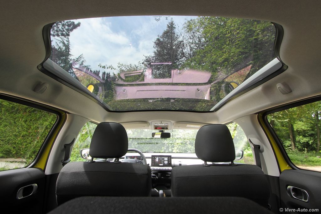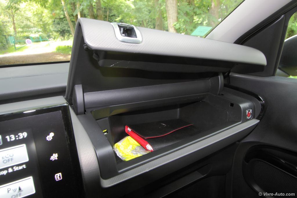 boîte à gants. Spacieuse, elle s’ouvre par le dessus ce qui rend son accès pratique, le conducteur peut même l’ouvrir facilement sans se pencher avec la poignée proche. Tout ceci est possible grâce à l’implantation de l’airbag passager dans la garniture du toit (première mondiale) et l’absence de buse de ventilation compensé par une grille plus large au centre. Les contre-portes et les poignées sont inspirées de la maroquinerie et le toit panoramique ne dispose pas de velum en raison d’un traitement spécifique du verre. Enfin, le volant qui n’est malheureusement pas réglable en profondeur, seulement en hauteur, est plat sur les parties supérieures et inférieures.
