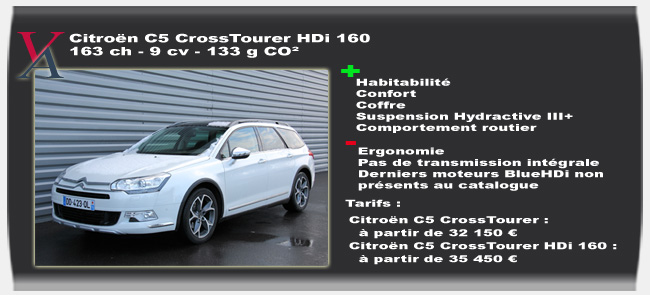 Les tarifs du CrossTourer débutent à 32.150€ avec le HDi 115 et deux finitions sont proposées Millenium et Exclusive. L’écart de prix par rapport à une C5 break s’élève à 1.300€ avec un rapport prix/équipement de 800€ (option jante 18 pouces).
