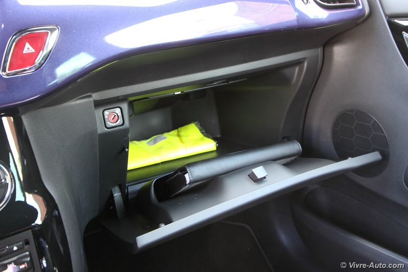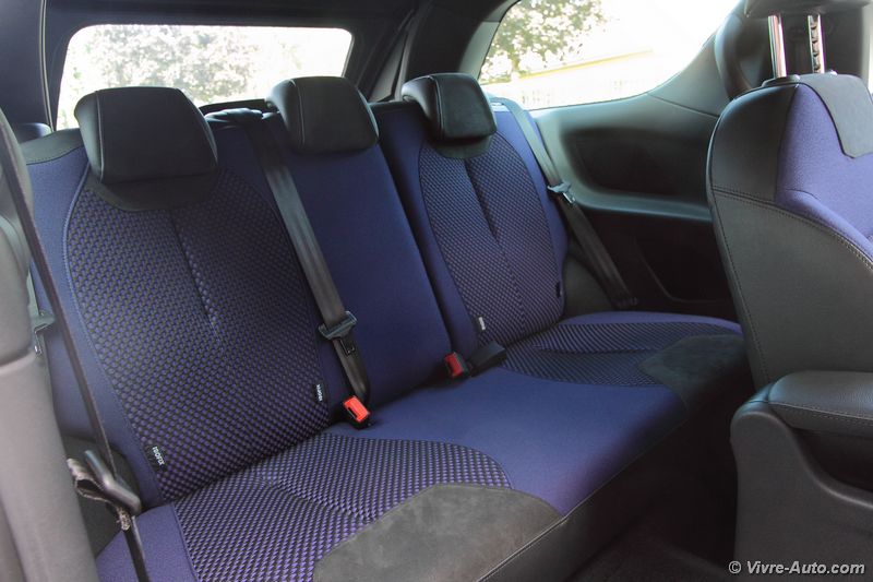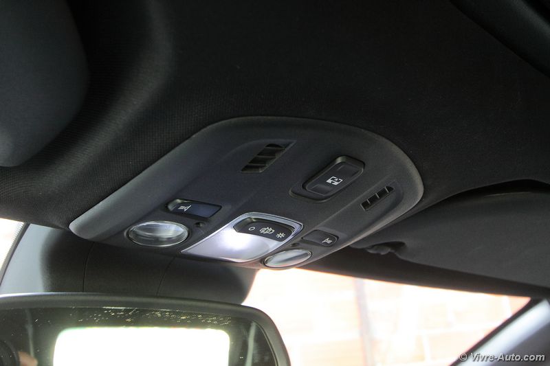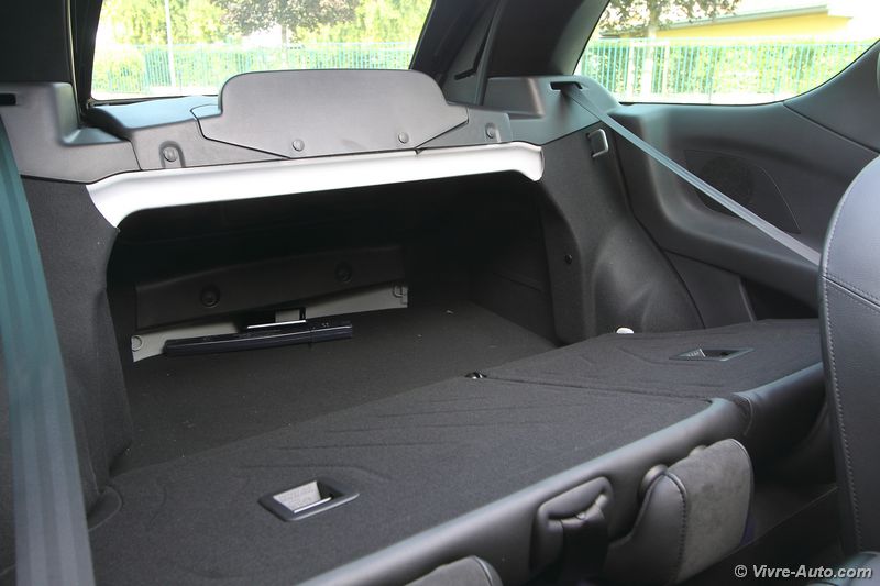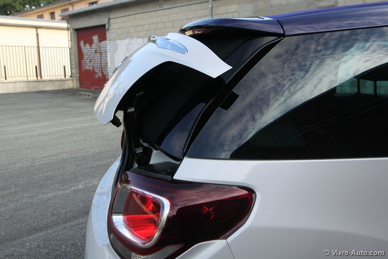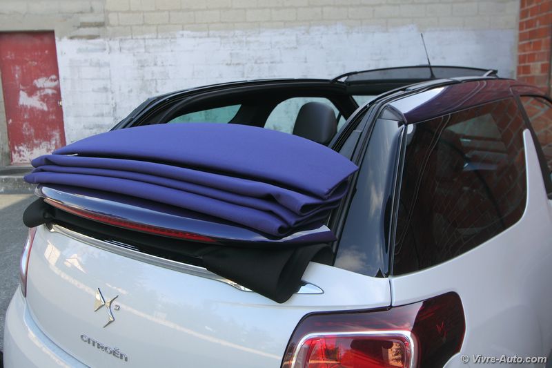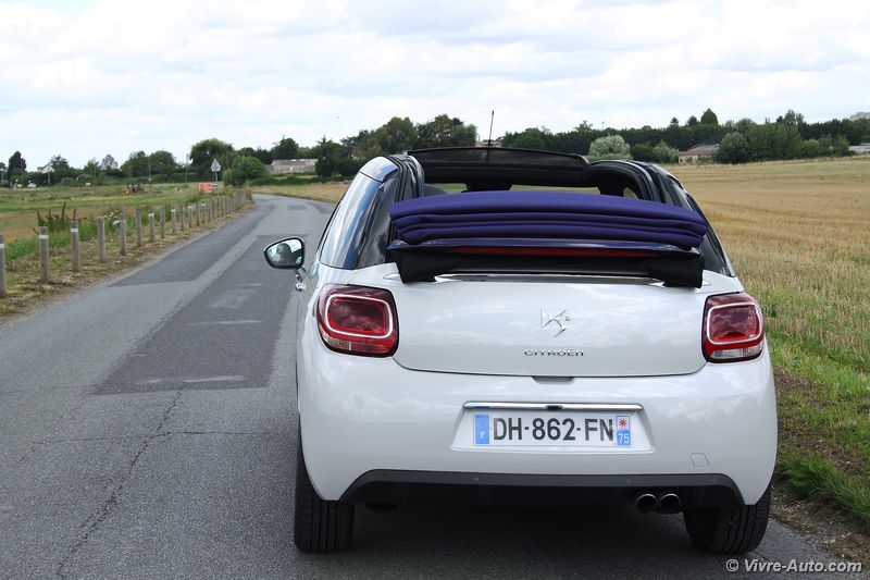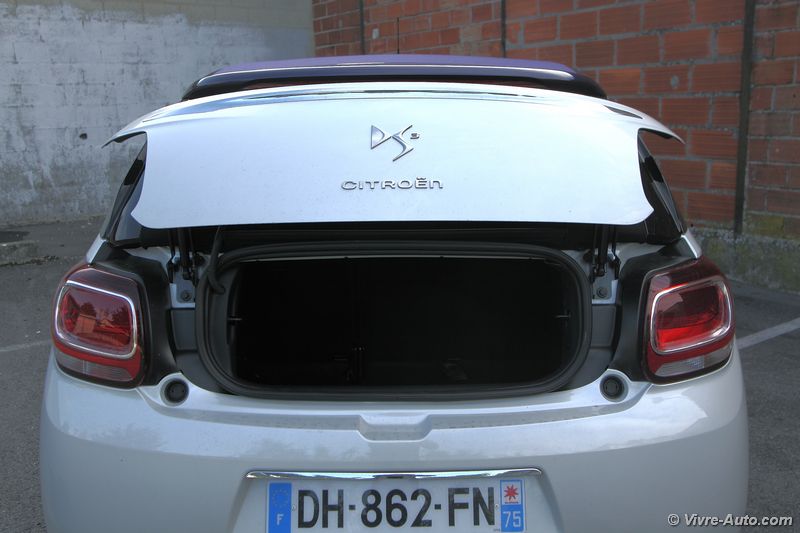 A bord, le charme opère toujours avec une bonne présentation. On se sent vraiment bien à son volant, avec des commandes qui tombent aisément sous la main et une position de conduite idéale. Comme pour l’extérieur, la DS 3 ne connait pas de modifications majeures, si ce n’est de nouvelles selleries. Le bandeau à droite de la planche de bord est désormais personnalisable d’une gravure à l’effigie des monuments de Paris. Deux nouveaux équipements font leur apparition, une caméra de recul, option à 1.000€ car accouplée au système de navigation et un nouveau système de sécurité. Baptisé « Active City Brake » et réservé à la finition haute, cette technologie, dotée d’un capteur laser, actionne le freinage automatiquement jusqu’à 30 km/h pour éviter les collisions. Même si l’intérieur ne vieillit pas et que l’ensemble des équipements semblent suffisants, par rapport aux dernières nouveautés du groupe et de la concurrence, la DS 3 restylée ne dispose toujours pas de la climatisation bi-zone, de lève-vitre passager impulsionnel, d’accès et de démarrage sans clé et son système écran multimédia, non tactile, embarque toujours l’ancien système GPS. Notre version Cabrio se dote d’un toit en toile qui se déplie en trois étapes, au dessus des occupants avant, arrière et complètement. La manœuvre s’effectue en 16 secondes et elle est possible en roulant, jusqu’à 120 km/h ! Mais si vous souhaitez avoir un œil sur l’arrière depuis le rétroviseur intérieur, il faudra s’arrêter à l’étape 2, car une fois pliée sur le haut du coffre, la toile cache la visibilité. En revanche, dans cette configuration, le coffre est toujours accessible puisque lorsque vous actionnez son ouverture, le toit remonte automatiquement d’un cran. Le volume ne perd que 40 litres de chargement (245l contre 285l sur la berline), un espace correcte pour la catégorie. Son accès est cependant difficile.