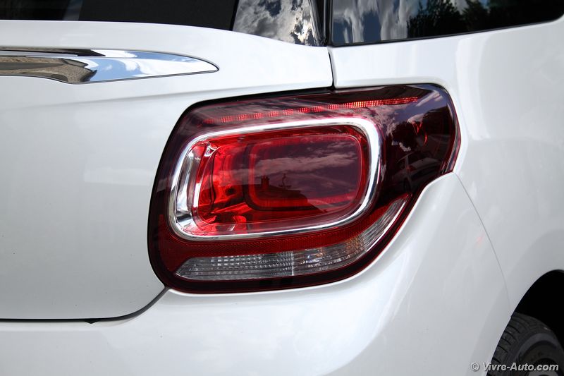 Il faut le dire, le succès de ce modèle est en partie grâce à sa ligne séduisante. Mais cinq ans plus tard, les designers n’ont pas souhaité modifier le style général de la citadine et l’on n’y voit pas d’inconvénient. Alors pour distinguer une version reliftée à la génération précédente, des éléments visuels ont été modifiés, on parle ici des optiques. A l’avant, les projecteurs emploient deux technologies pour l’éclairage, des LED et un module Xénon. Les deux sont combinés lorsque vous êtes en feux de croisement ou en feux de route pour un meilleur éclairage et une consommation moindre. La signature lumineuse est tout simplement superbe ! Autre détail sympathique, les clignotants sont à défilement. Les feux arrière quant à eux sont également à LED et au dessin 3D, du plus bel effet. Mais malheureusement ces optiques ne sont pas offerts de série, réservés exclusivement sur la finition haute Sport Chic ou sur les séries spéciales. Les autres finitions optent ainsi pour des feux classiques nous rappelant la Citroën C3. Il faut alors débourser 950€ pour les posséder. Les feux arrière 3D, eux, sont de série dès l’avant dernière finition So Chic ou facturés 310€. Cet équipement est donc obligatoire si vous souhaitez distinguer votre DS 3 de l’ancienne génération. Au catalogue, une nouvelle teinte de carrosserie Blanc Perle Nacré a fait son apparition, tout comme les nouvelles jantes alliage de 17 pouces « Aphrodité » présentes sur notre modèle d’essai.