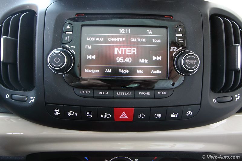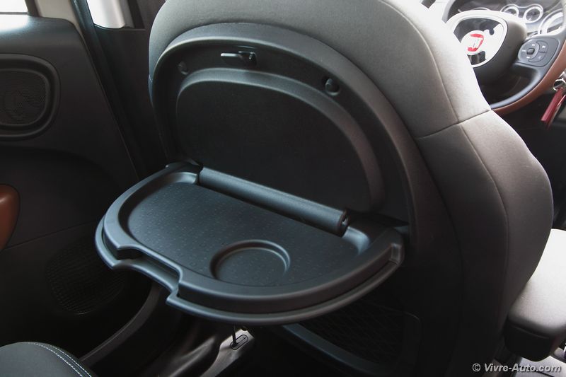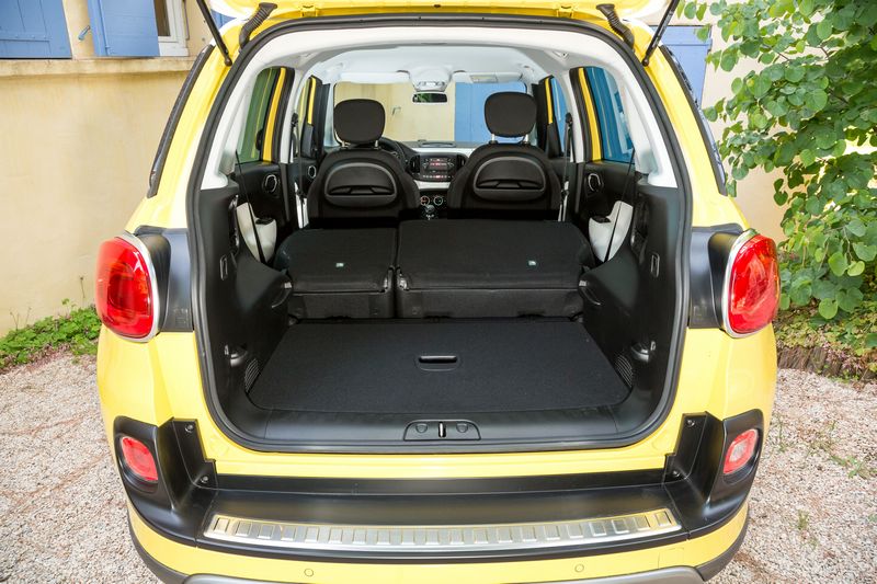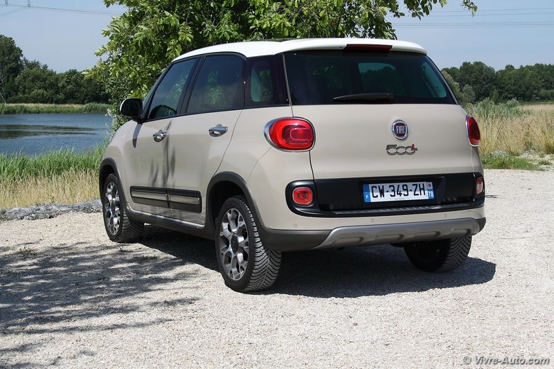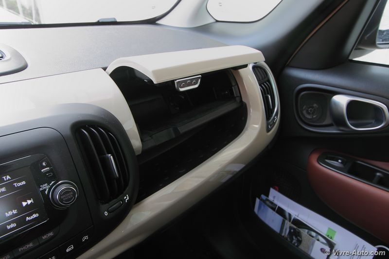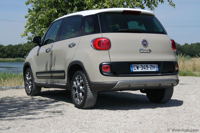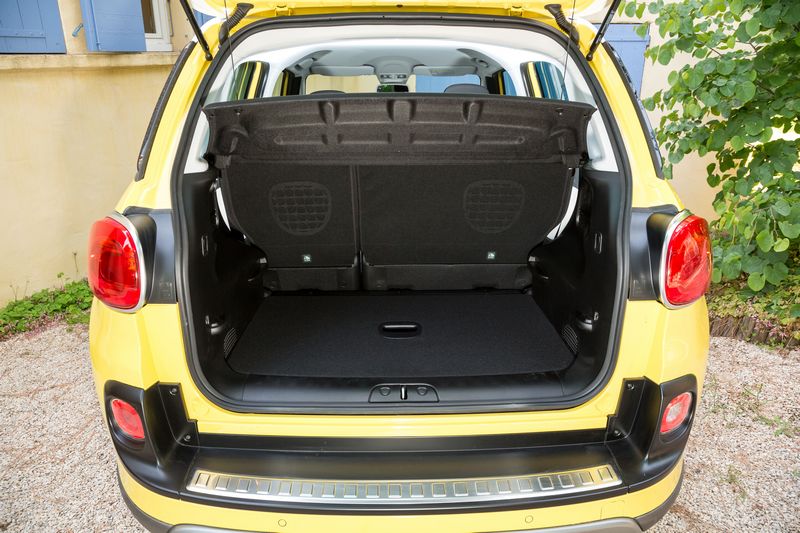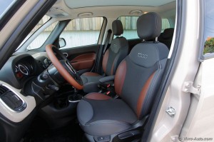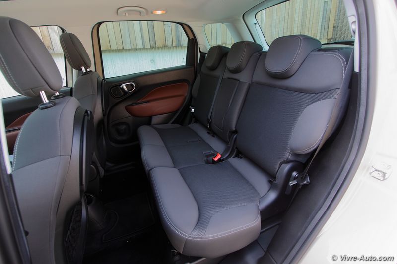une banquette coulissante sur 10 cm. Les passagers arrière disposent de tablettes de type aviation. La modularité est l’un des points forts de la 500L, le volume de chargement peut passer de 455 litres à 1.480 litres avec une multitudes de configurations possibles. La banquette arrière se replie en 1/3 2/3 et les sièges sont repliables en portefeuille. Le plancher de coffre offre trois positions permettant d’obtenir un plancher plat. Et cerise sur la gâteau, le siège avant passager se rabat, il est alors possible d’emporter des objets jusqu’à 2,40 mètres de long. La Trekking est au même prix que la 500L en finition Lounge mais avec moins d’équipements : climatisation manuel, régulateur de vitesse, autoradio avec écran tactile et fonction Bluetooth ou prises USB/Auxiliaire. Auquel s’ajoute les options suivantes : Climatisation automatique, allumage automatique des feux et détecteur de pluie, radars recul (pack 450€), GPS et téléphonie Bluetooth (500€), système audio Beats (650€), sièges avant chauffants (200€)…