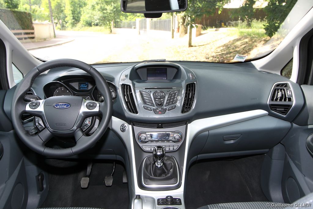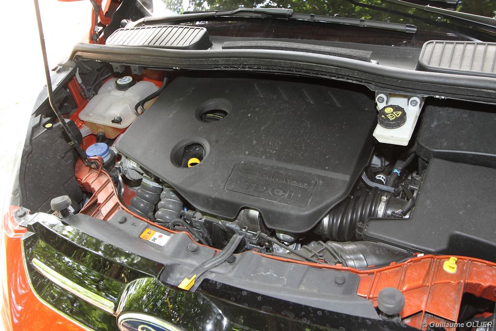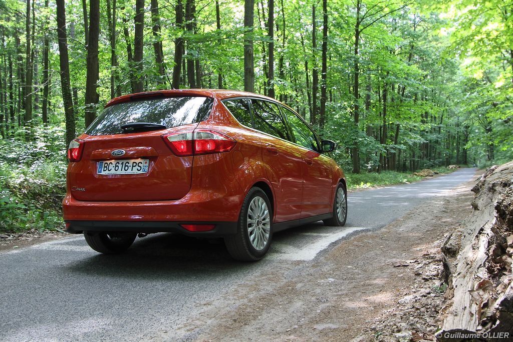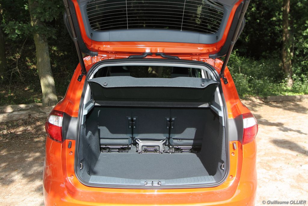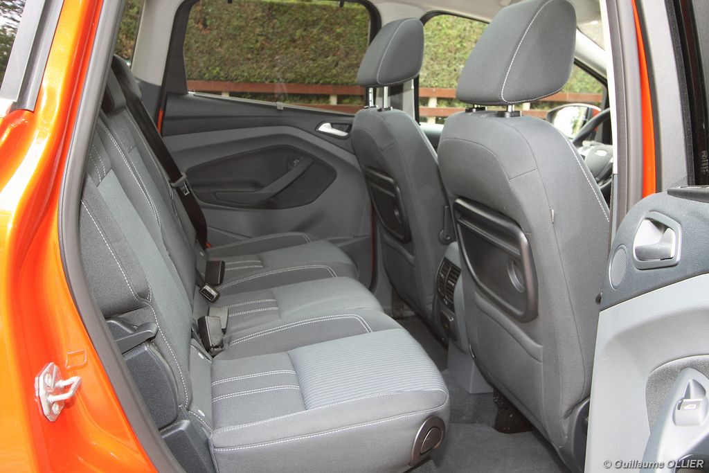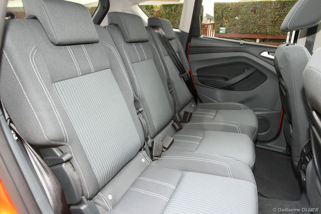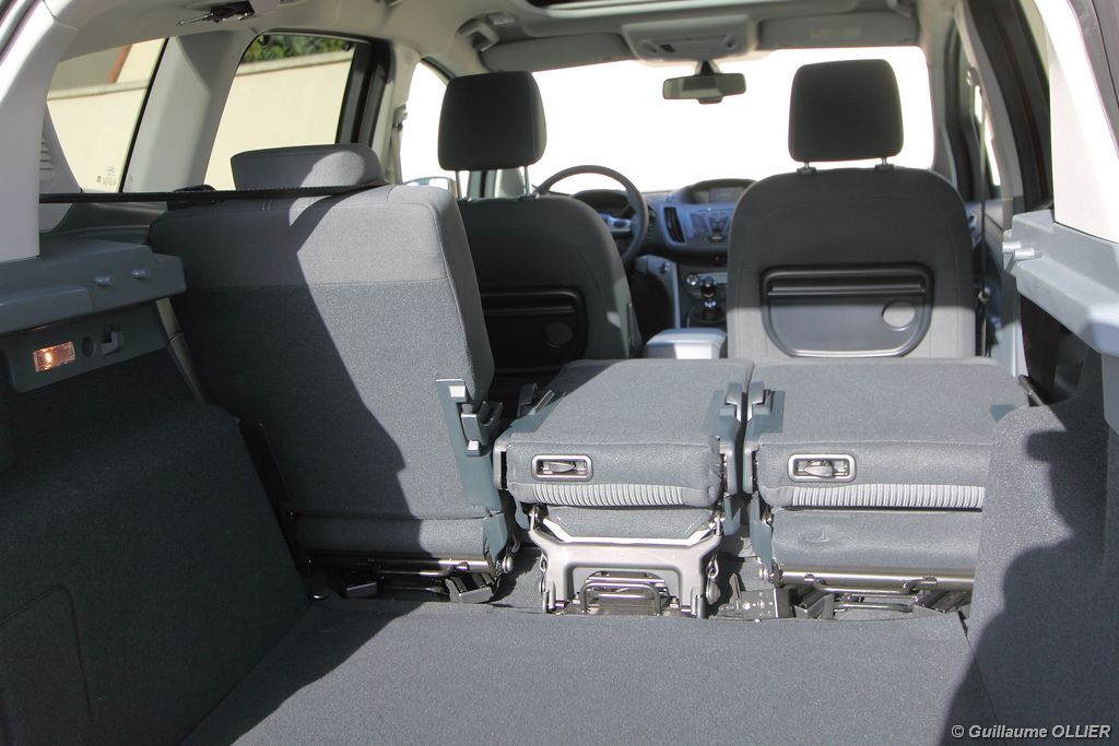 Le combiné de compteurs respire la modernité avec des aiguilles bleutées originales, et un bel écran couleur pour l’ordinateur de bord. L’éclairage bleuté est repris sur les petits écrans LCD du panneau de climatisation. Les passagers avant se sentent dans un cocon, à l’instar d’un Peugeot 5008. Le volant en cuir est très agréable pour sa prise en main. La position de conduite conviendra à tous les gabarits. L’ergonomie est moyenne pour la partie multimédia, il vous faudra du temps avant de vous habituer au fonctionnement, et ne pas vous perdre parmi les nombreux boutons… De même pour le volant multifonctions, assez chargé en commandes. L’ordinateur de bord est très complet, il regroupe les informations du véhicule, le kit main libre mais également les pistes de musique ou les stations de radio sous forme de dossiers. La façade du système radio-GPS a été étudiée avec Sony, et se révèle pratique d’utilisation et bien présentée, avec une grosse molette centrale. L’écran du GPS est un peu petit avec 5″ en diagonale. A l’instar du Kuga, l’équipement optionnel vaste propose notamment une très pratique caméra de recul, un système de démarrage sans clé, un système de détection des angles morts, l’aide au démarrage en côte et le hayon électrique. Côté habitabilité, l’espace dévolu aux passagers arrière est tout à fait honorable, mais aucun progrès n’a été réalisé depuis l’ancien modèle. Les côtes sont logiquement en retrait de celles du Grand C-Max. La longueur aux jambes pour la seconde rangée est de 916 mm contre 864 à 966 mm pour le Grand C-Max. La largeur aux épaules du second rang est de 1402 mm contre 1427 mm. Ford a opté pour des sièges escamotables avec le système Diagoflex. Lorsque le siège central est retiré, les deux autres peuvent coulisser vers le milieu de quelques centimètres afin de libérer de l’espace aux coudes. A noter que sur le grand C-Max l’assise centrale se camoufle dans le siège de droite. Quant au coffre, il est d’un volume suffisant de 471 litres avec kit anti-crevaison. Cela reste tout de même en retrait du volume de 500 litres proposé par un C4 Picasso. En configuration deux places, le volume utile peut grimper jusqu’à 1723 litres avec un chargement jusqu’au toit. Point négatif : le seuil du coffre est supérieur à celui du C4 Picasso ou du Scenic et présente un rebord qui ne sera pas pratique pour charger des objets lourds. Le hayon est quand à lui motorisé.
