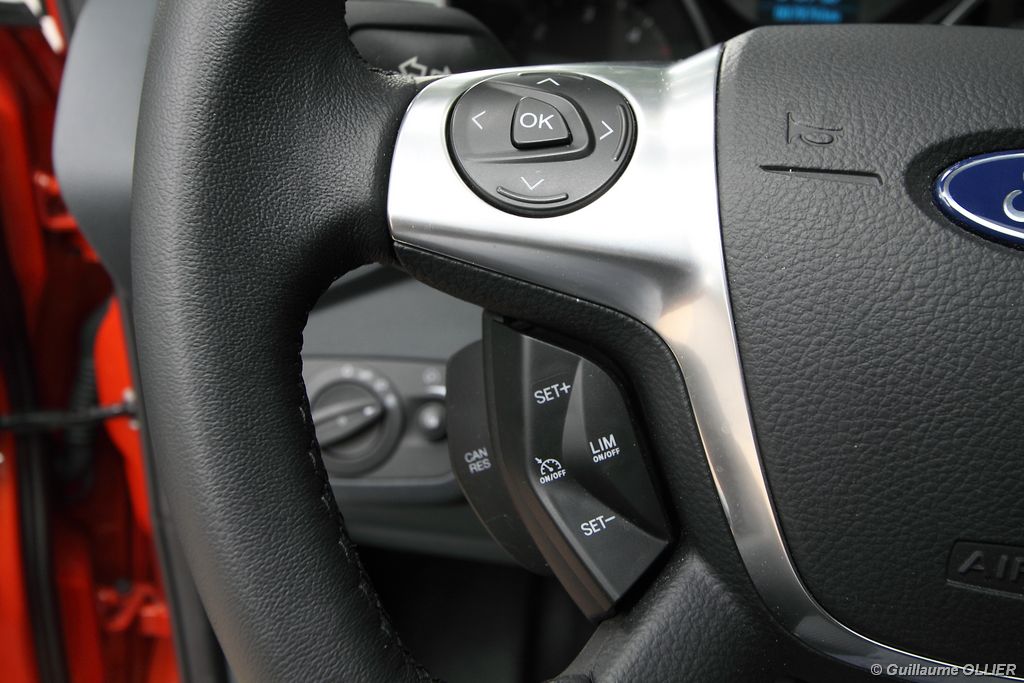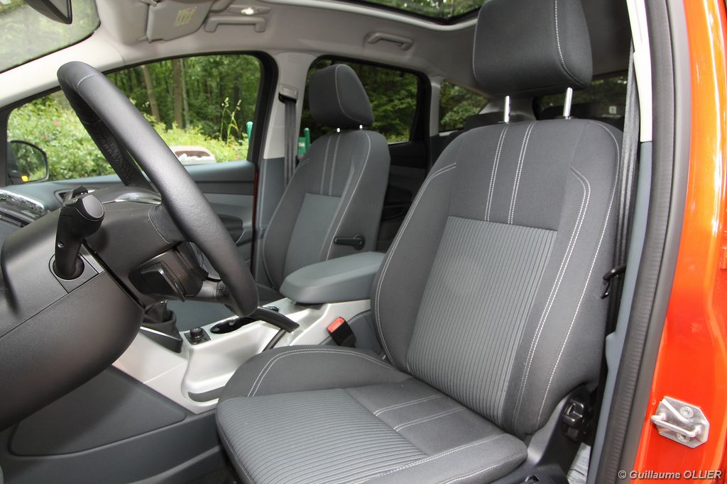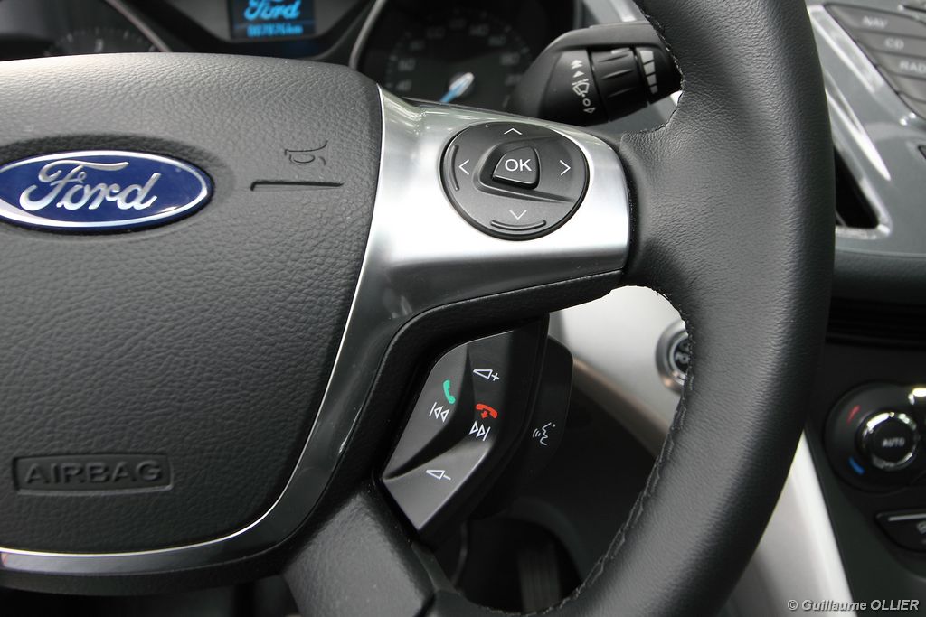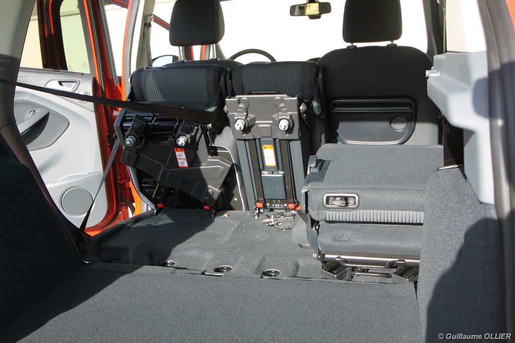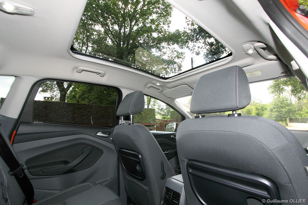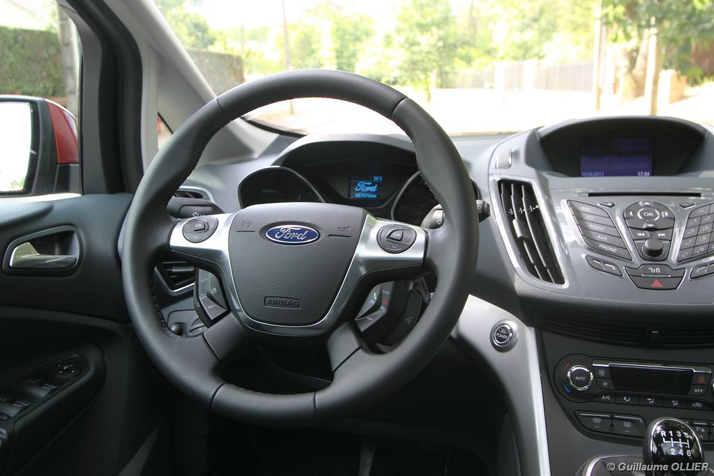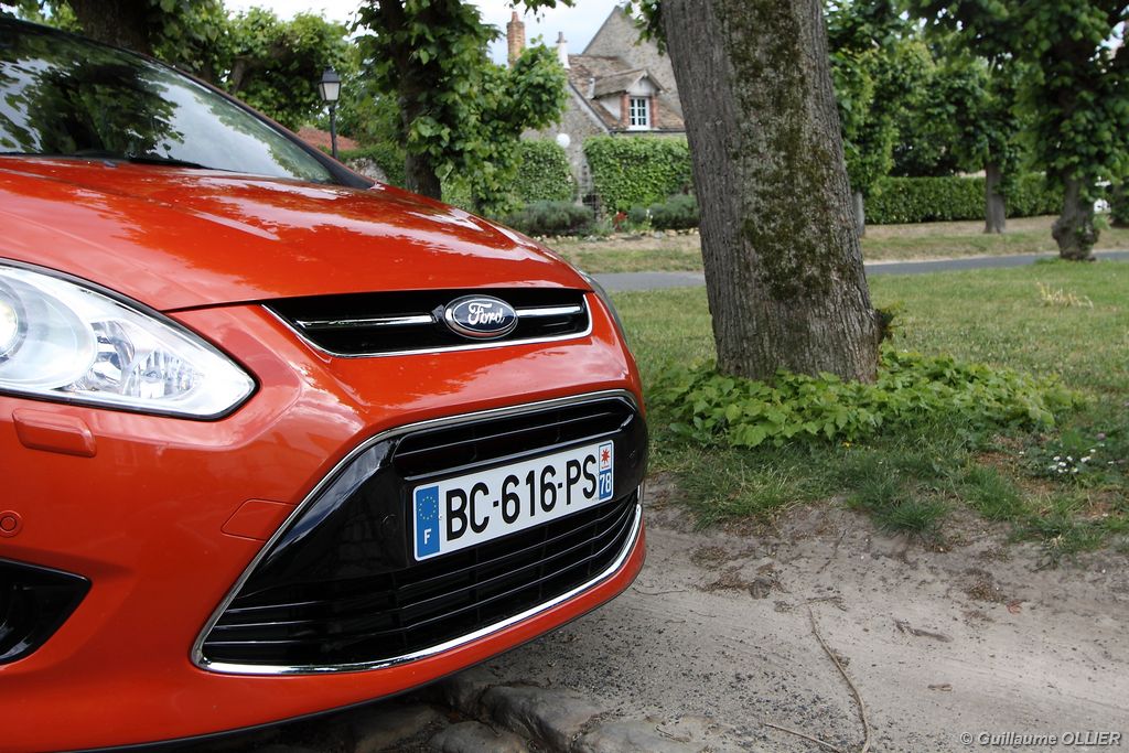 Le combiné de compteurs respire la modernité avec des aiguilles bleutées originales, et un bel écran couleur pour l’ordinateur de bord. L’éclairage bleuté est repris sur les petits écrans LCD du panneau de climatisation. Les passagers avant se sentent dans un cocon, à l’instar d’un Peugeot 5008. Le volant en cuir est très agréable pour sa prise en main. La position de conduite conviendra à tous les gabarits. L’ergonomie est moyenne pour la partie multimédia, il vous faudra du temps avant de vous habituer au fonctionnement, et ne pas vous perdre parmi les nombreux boutons… De même pour le volant multifonctions, assez chargé en commandes. L’ordinateur de bord est très complet, il regroupe les informations du véhicule, le kit main libre mais également les pistes de musique ou les stations de radio sous forme de dossiers. La façade du système radio-GPS a été étudiée avec Sony, et se révèle pratique d’utilisation et bien présentée, avec une grosse molette centrale. L’écran du GPS est un peu petit avec 5″ en diagonale. A l’instar du Kuga, l’équipement optionnel vaste propose notamment une très pratique caméra de recul, un système de démarrage sans clé, un système de détection des angles morts, l’aide au démarrage en côte et le hayon électrique. Côté habitabilité, l’espace dévolu aux passagers arrière est tout à fait honorable, mais aucun progrès n’a été réalisé depuis l’ancien modèle. Les côtes sont logiquement en retrait de celles du Grand C-Max. La longueur aux jambes pour la seconde rangée est de 916 mm contre 864 à 966 mm pour le Grand C-Max. La largeur aux épaules du second rang est de 1402 mm contre 1427 mm. Ford a opté pour des sièges escamotables avec le système Diagoflex. Lorsque le siège central est retiré, les deux autres peuvent coulisser vers le milieu de quelques centimètres afin de libérer de l’espace aux coudes. A noter que sur le grand C-Max l’assise centrale se camoufle dans le siège de droite. Quant au coffre, il est d’un volume suffisant de 471 litres avec kit anti-crevaison. Cela reste tout de même en retrait du volume de 500 litres proposé par un C4 Picasso. En configuration deux places, le volume utile peut grimper jusqu’à 1723 litres avec un chargement jusqu’au toit. Point négatif : le seuil du coffre est supérieur à celui du C4 Picasso ou du Scenic et présente un rebord qui ne sera pas pratique pour charger des objets lourds. Le hayon est quand à lui motorisé.