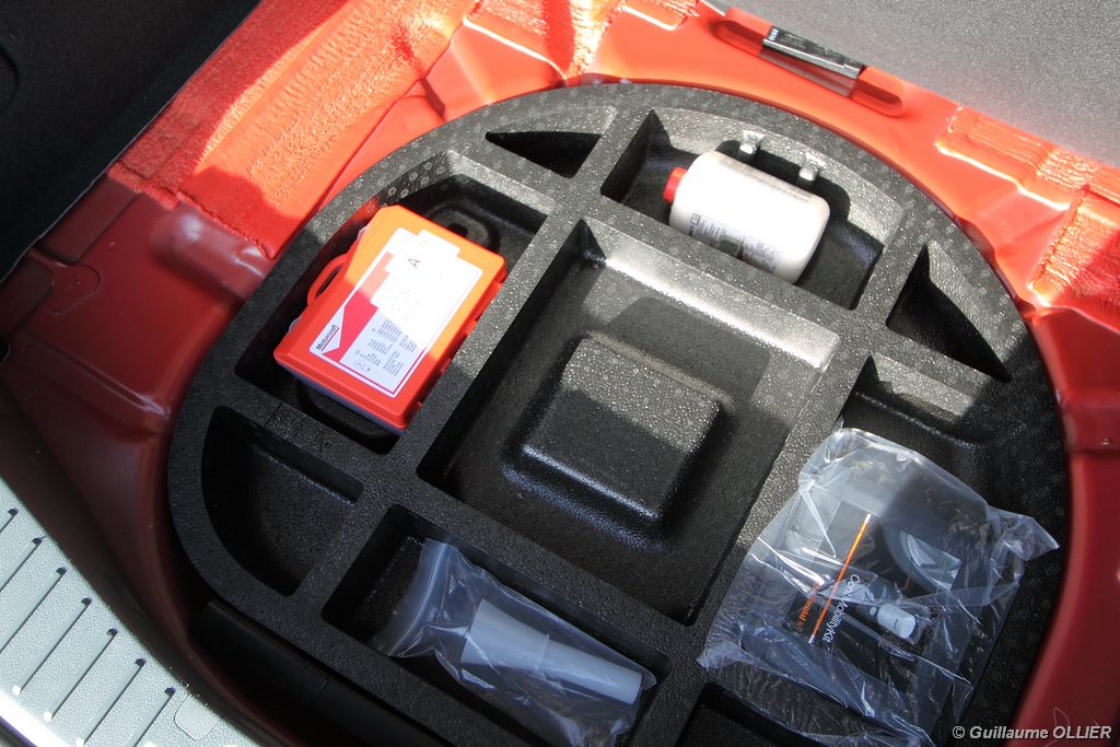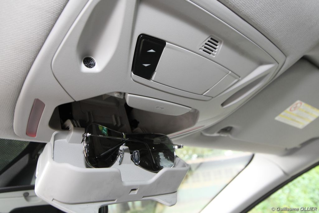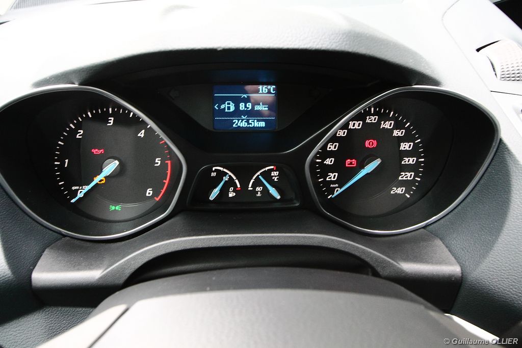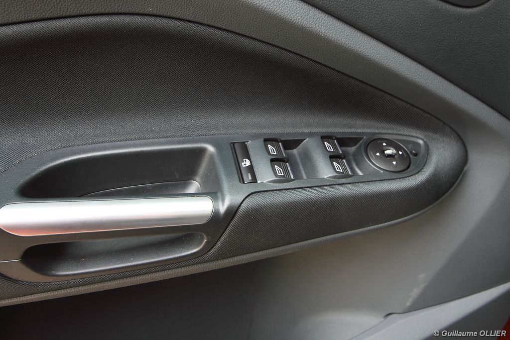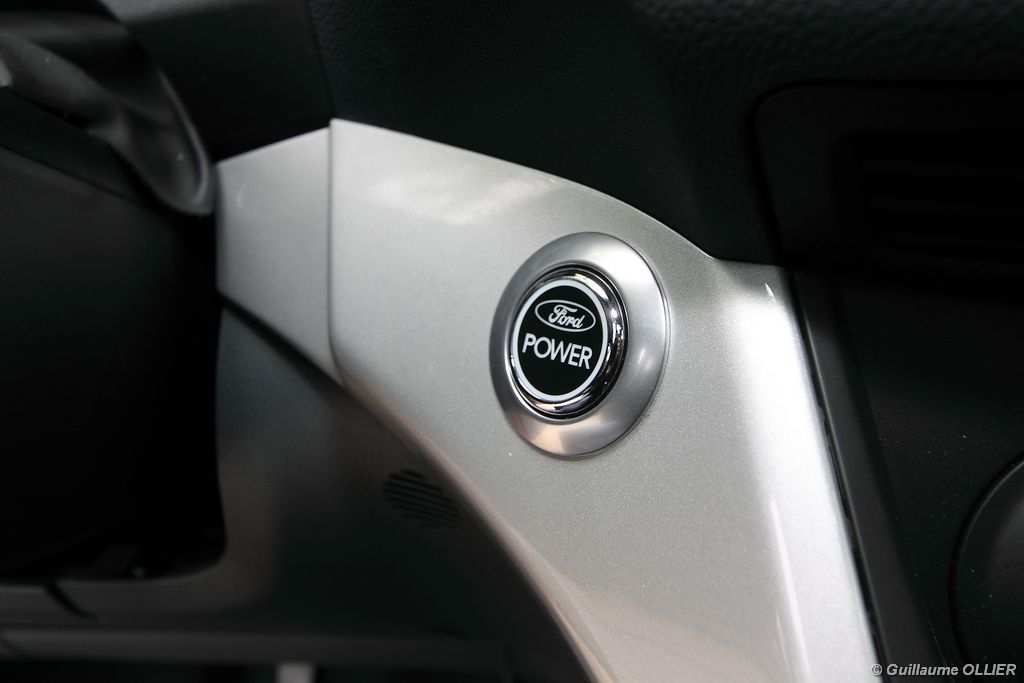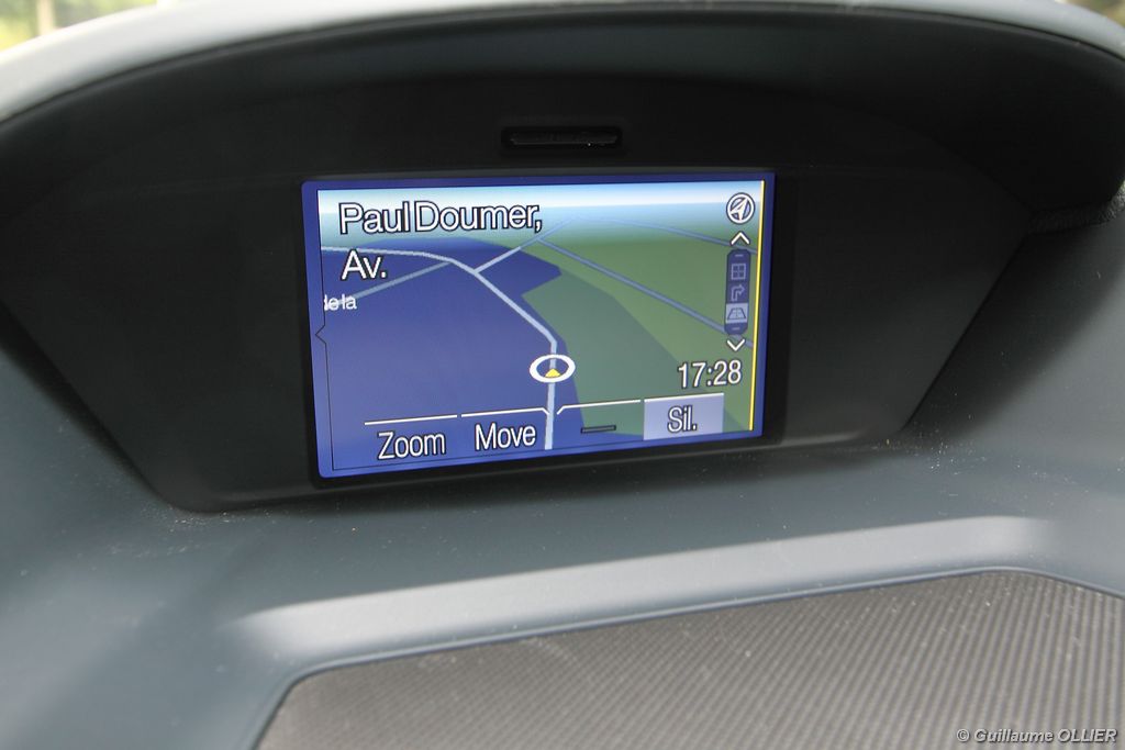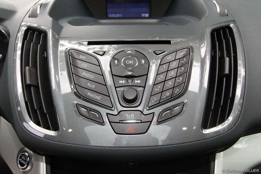 Le combiné de compteurs respire la modernité avec des aiguilles bleutées originales, et un bel écran couleur pour l’ordinateur de bord. L’éclairage bleuté est repris sur les petits écrans LCD du panneau de climatisation. Les passagers avant se sentent dans un cocon, à l’instar d’un Peugeot 5008. Le volant en cuir est très agréable pour sa prise en main. La position de conduite conviendra à tous les gabarits. L’ergonomie est moyenne pour la partie multimédia, il vous faudra du temps avant de vous habituer au fonctionnement, et ne pas vous perdre parmi les nombreux boutons… De même pour le volant multifonctions, assez chargé en commandes. L’ordinateur de bord est très complet, il regroupe les informations du véhicule, le kit main libre mais également les pistes de musique ou les stations de radio sous forme de dossiers. La façade du système radio-GPS a été étudiée avec Sony, et se révèle pratique d’utilisation et bien présentée, avec une grosse molette centrale. L’écran du GPS est un peu petit avec 5″ en diagonale. A l’instar du Kuga, l’équipement optionnel vaste propose notamment une très pratique caméra de recul, un système de démarrage sans clé, un système de détection des angles morts, l’aide au démarrage en côte et le hayon électrique. Côté habitabilité, l’espace dévolu aux passagers arrière est tout à fait honorable, mais aucun progrès n’a été réalisé depuis l’ancien modèle. Les côtes sont logiquement en retrait de celles du Grand C-Max. La longueur aux jambes pour la seconde rangée est de 916 mm contre 864 à 966 mm pour le Grand C-Max. La largeur aux épaules du second rang est de 1402 mm contre 1427 mm. Ford a opté pour des sièges escamotables avec le système Diagoflex. Lorsque le siège central est retiré, les deux autres peuvent coulisser vers le milieu de quelques centimètres afin de libérer de l’espace aux coudes. A noter que sur le grand C-Max l’assise centrale se camoufle dans le siège de droite. Quant au coffre, il est d’un volume suffisant de 471 litres avec kit anti-crevaison. Cela reste tout de même en retrait du volume de 500 litres proposé par un C4 Picasso. En configuration deux places, le volume utile peut grimper jusqu’à 1723 litres avec un chargement jusqu’au toit. Point négatif : le seuil du coffre est supérieur à celui du C4 Picasso ou du Scenic et présente un rebord qui ne sera pas pratique pour charger des objets lourds. Le hayon est quand à lui motorisé.