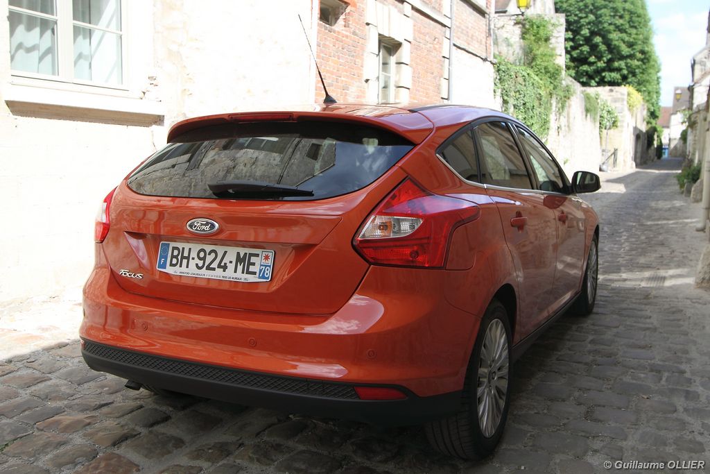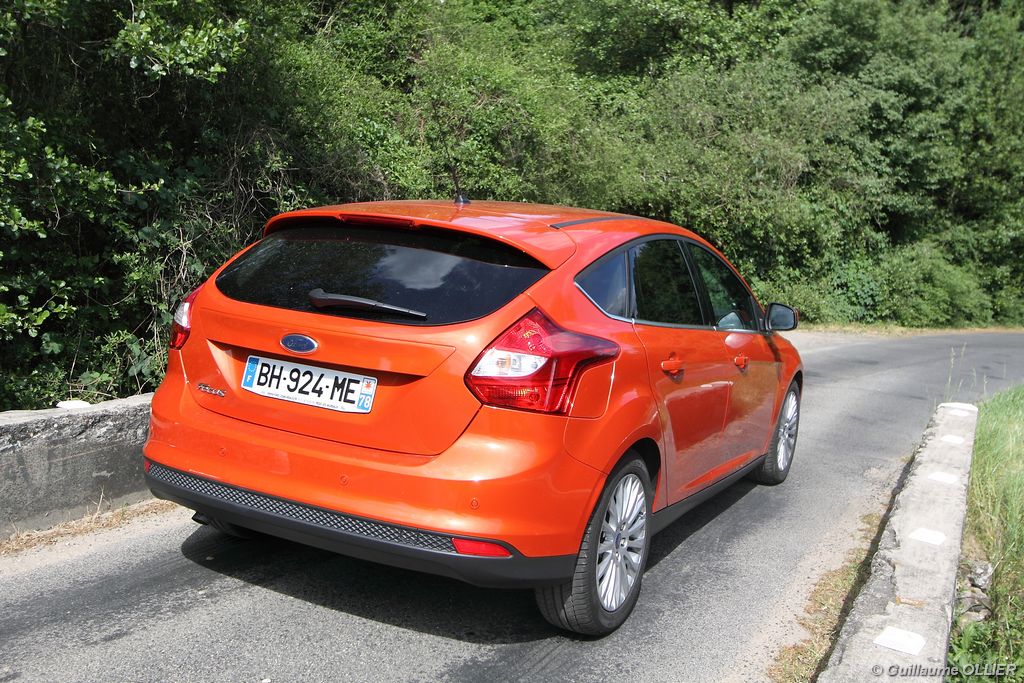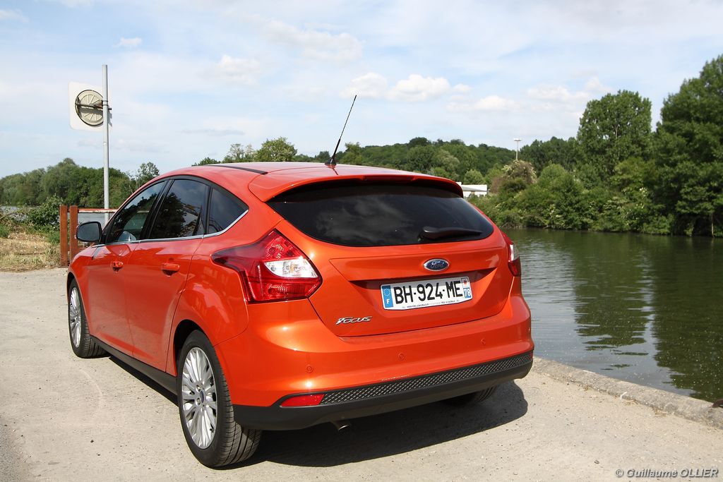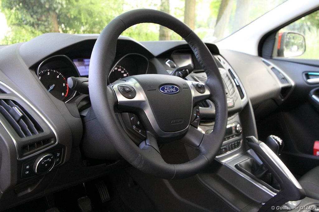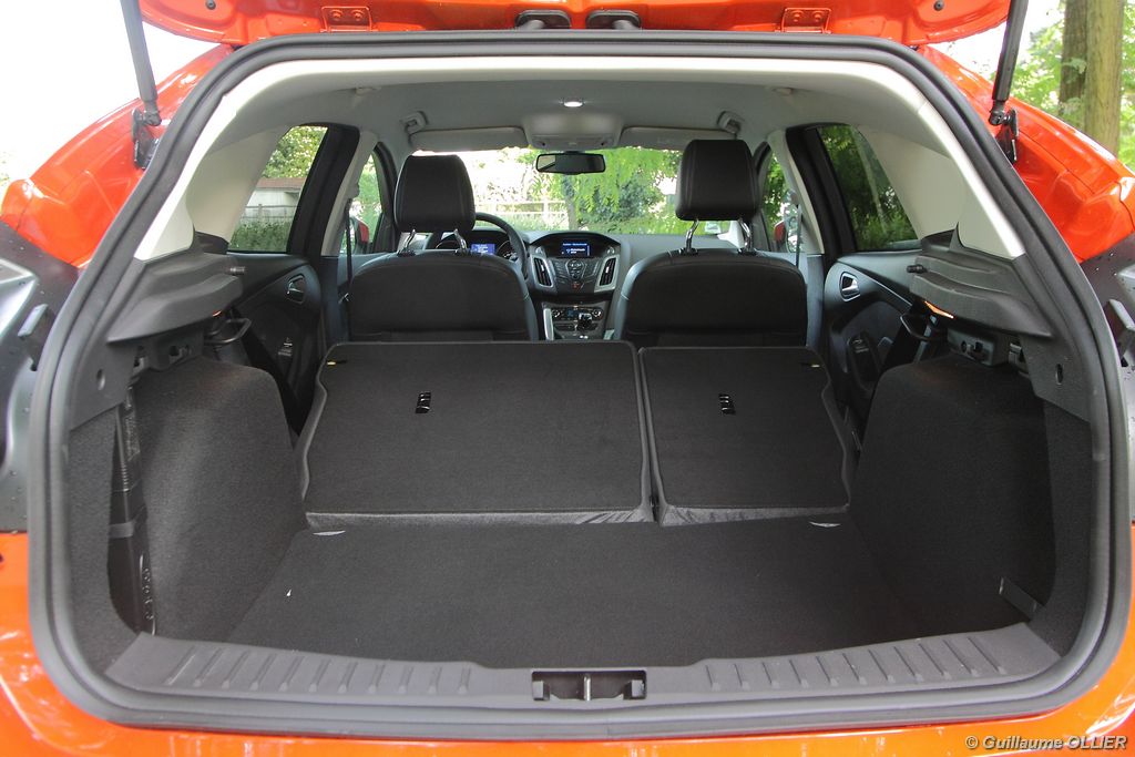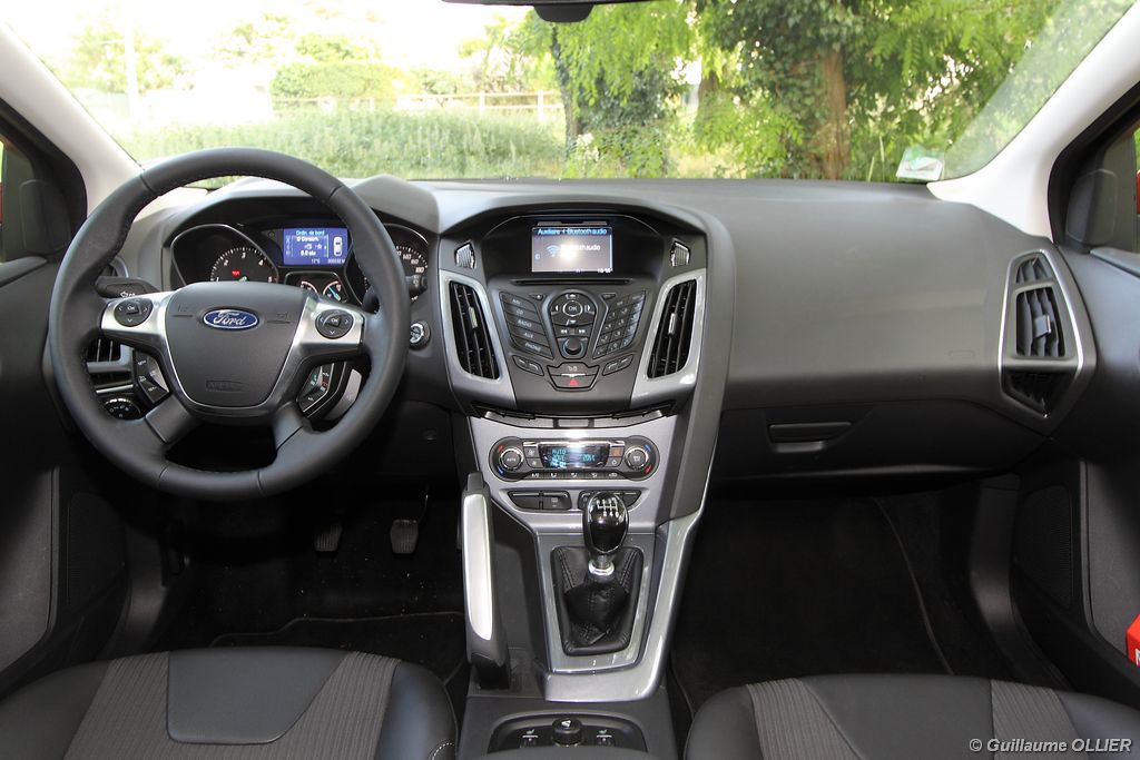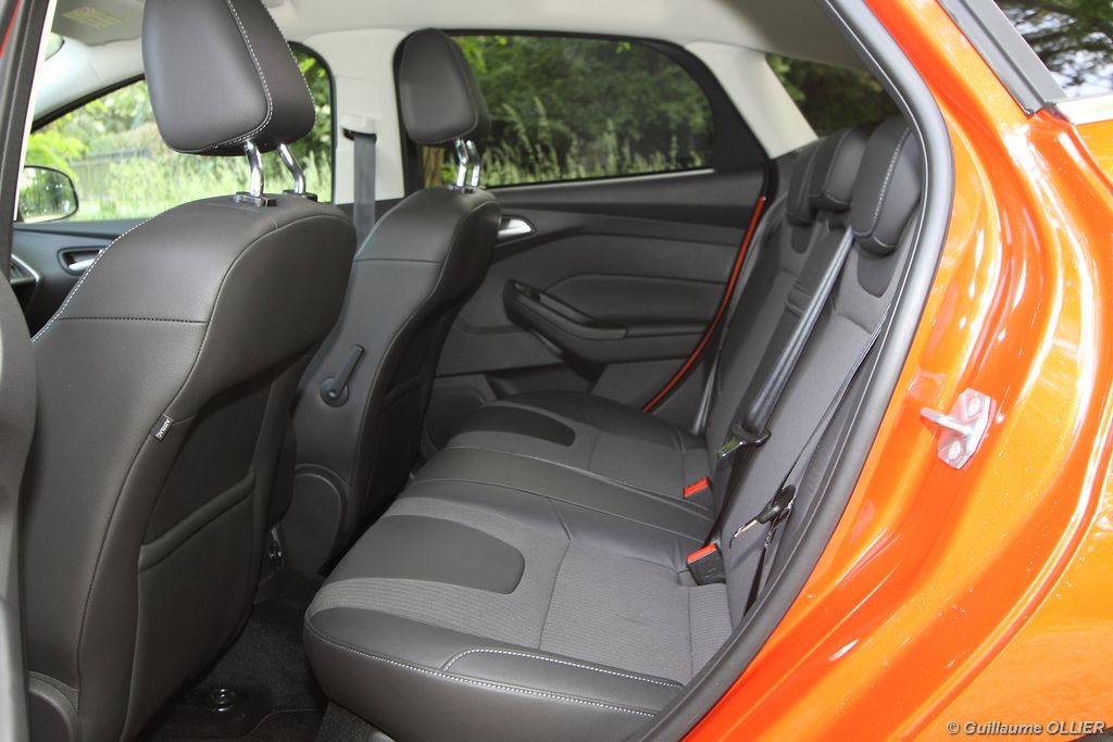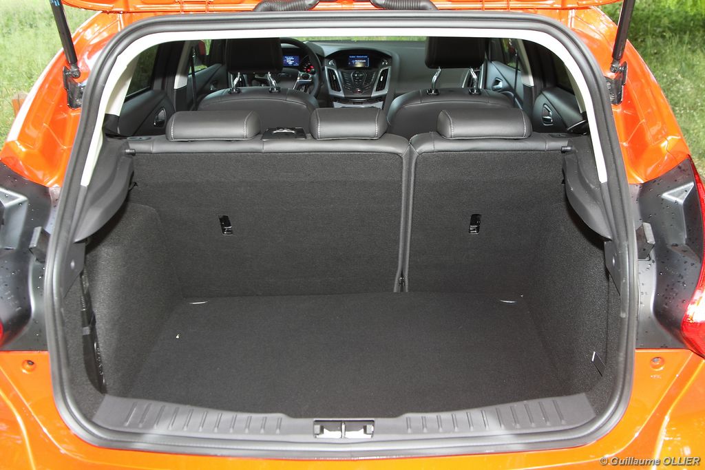 l’écran central couleur pilotable depuis les commandes au volant. Il vous faudra toutefois un temps d’adaptation, puisque l’ordinateur de bord regroupe les informations du véhicule, le kit main libre mais également les pistes de musique ou les stations de radio sous forme de dossiers. L’ergonomie est moyenne pour la partie multimédia (synchronisation Bluetooth, radio…). Il vous faudra du temps avant de vous habituer au fonctionnement, et ne pas vous perdre parmi les nombreux boutons… L’éclairage d’ambiance est à LED sur la finition Titanium. Le plafonnier, les vides poches, les caves, les poignées de portes sont ainsi éclairés par six ambiances lumineuses au choix : Bleu, vert, orange, rouge, violet, ou blanc. Le GPS facturé 590€ en option nous a un peu déçu. Peu moderne, il n’indique aucun radar et son écran de 12,7 cm est trop petit. Le système audio vous permet d’écouter vos musiques en streaming Bluetooth, ou par le biais de la prise USB compatible iPod. A la fin de l’année Ford proposera un système multimédia qui se transforme en Hot Spot Wifi lorsque vous branchez une clé 3G, afin d’offrir aux passagers un accès à Internet. Au chapitre de l’habitabilité, la Focus n’est pas la championne de sa catégorie. Même si les places arrière sont convenables, on peut s’attendre à mieux. L’espace aux genoux est correct mais la largeur allouée aux épaules et la garde au toit manquent de générosité. Le coffre offre un volume de chargement de 363 litres ce qui est dans la moyenne de la catégorie. Moins volumineux d’une trentaine de litres par rapport à l’ancienne génération, aucun effort n’a donc été apporté dans ce domaine. Dommage également lorsque l’on replie la banquette arrière de ne pas obtenir un plancher plat. Quand aux espaces de rangements ils ne sont pas nombreux, un petit logement devant le levier de vitesse vous permet tout de même de poser votre téléphone portable par exemple. La boîte à gants n’est pas très spacieuse.
