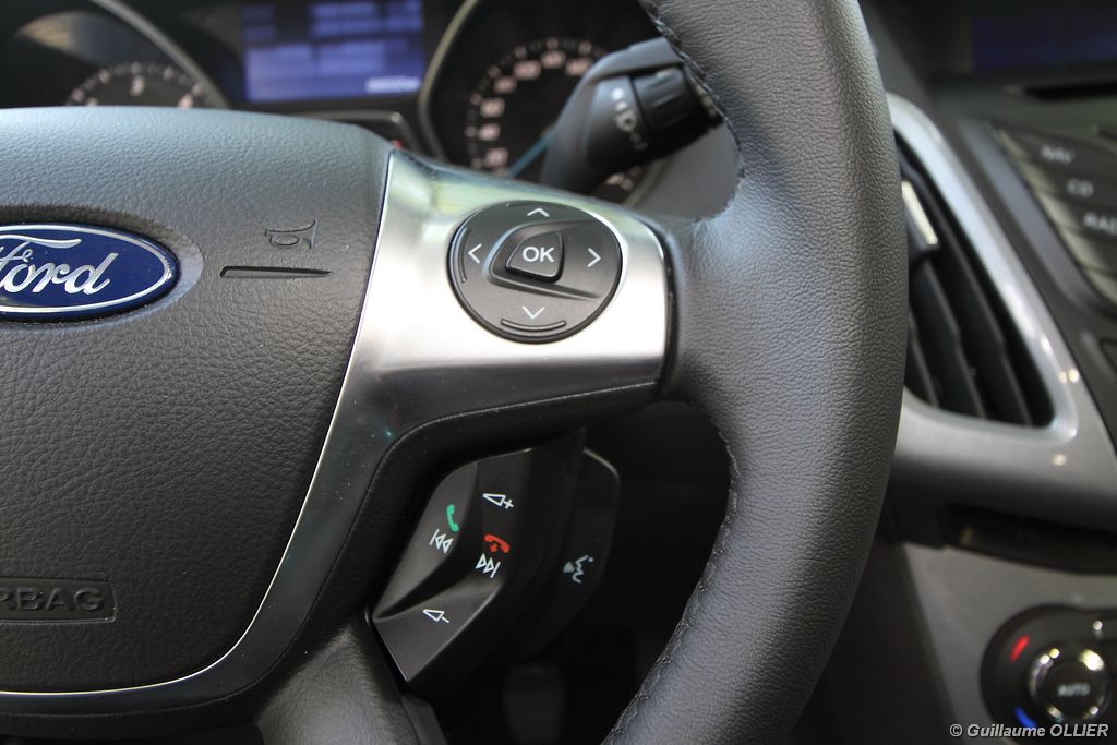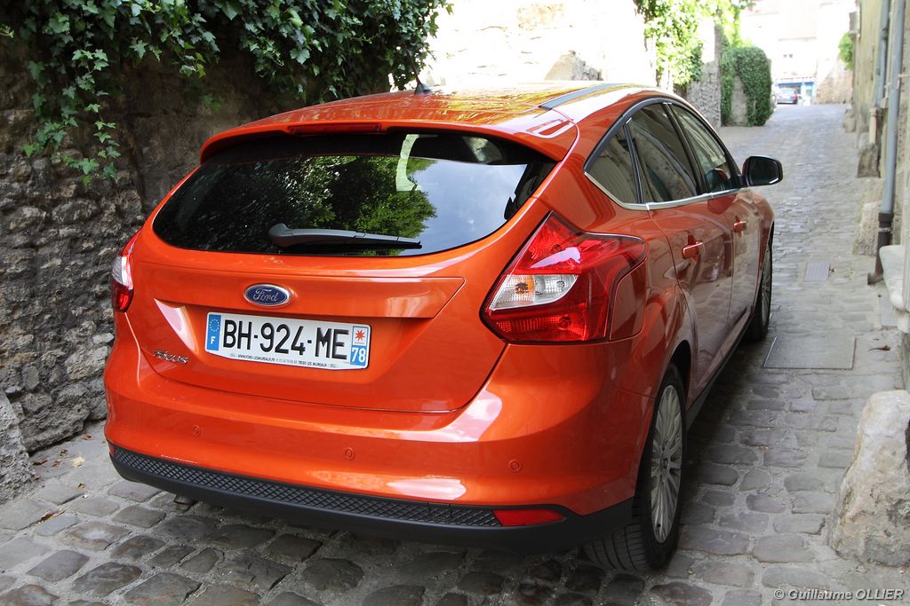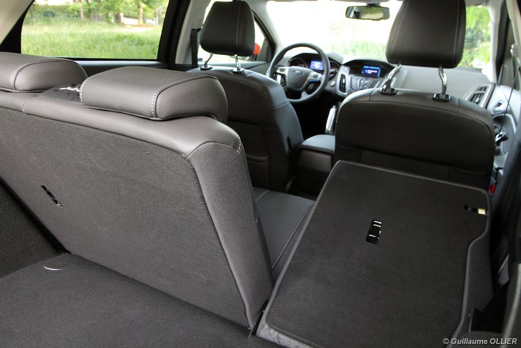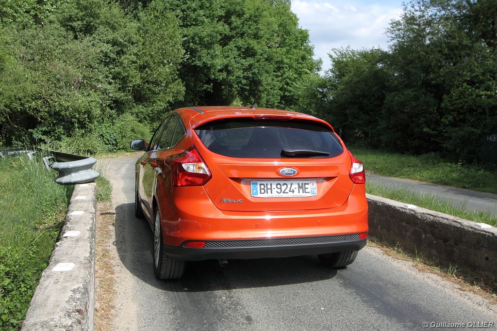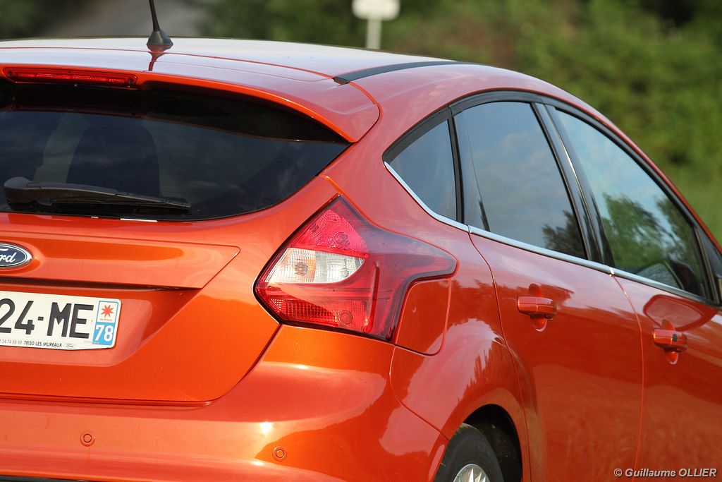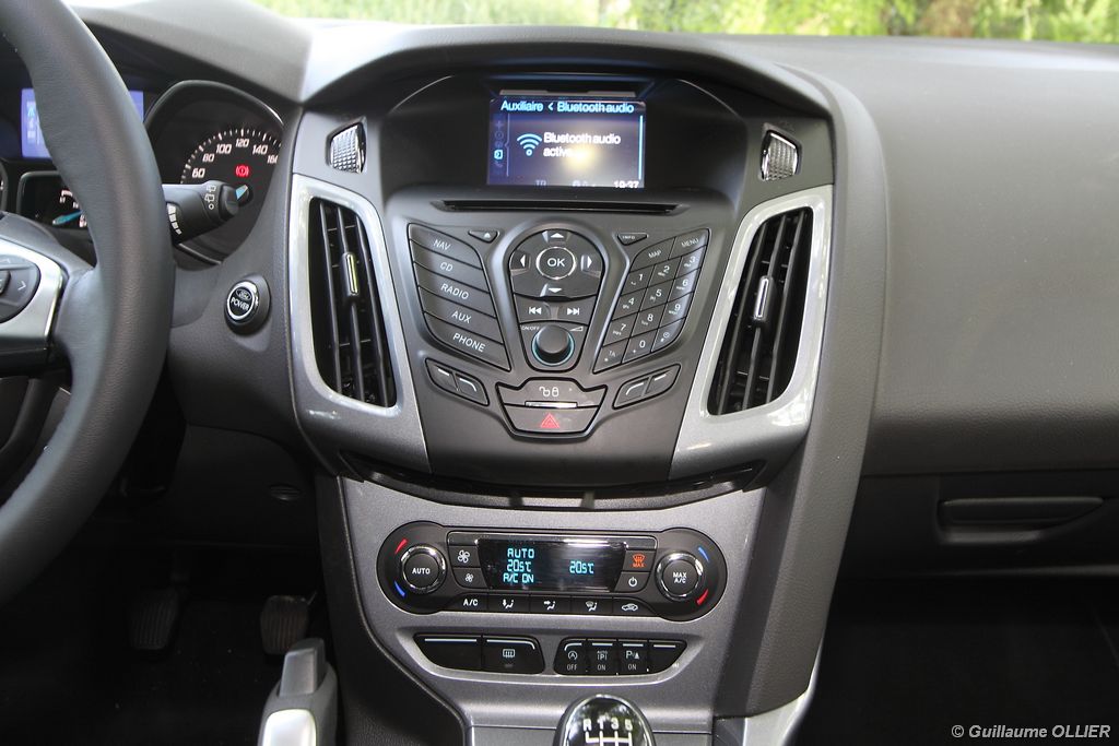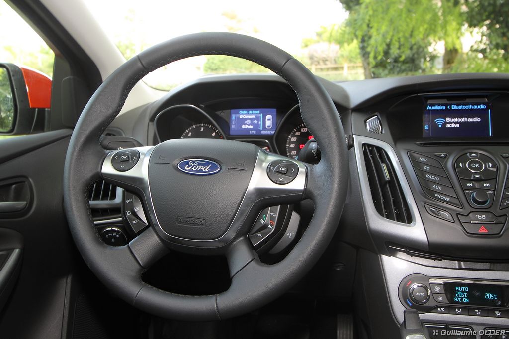 l’écran central couleur pilotable depuis les commandes au volant. Il vous faudra toutefois un temps d’adaptation, puisque l’ordinateur de bord regroupe les informations du véhicule, le kit main libre mais également les pistes de musique ou les stations de radio sous forme de dossiers. L’ergonomie est moyenne pour la partie multimédia (synchronisation Bluetooth, radio…). Il vous faudra du temps avant de vous habituer au fonctionnement, et ne pas vous perdre parmi les nombreux boutons… L’éclairage d’ambiance est à LED sur la finition Titanium. Le plafonnier, les vides poches, les caves, les poignées de portes sont ainsi éclairés par six ambiances lumineuses au choix : Bleu, vert, orange, rouge, violet, ou blanc. Le GPS facturé 590€ en option nous a un peu déçu. Peu moderne, il n’indique aucun radar et son écran de 12,7 cm est trop petit. Le système audio vous permet d’écouter vos musiques en streaming Bluetooth, ou par le biais de la prise USB compatible iPod. A la fin de l’année Ford proposera un système multimédia qui se transforme en Hot Spot Wifi lorsque vous branchez une clé 3G, afin d’offrir aux passagers un accès à Internet. Au chapitre de l’habitabilité, la Focus n’est pas la championne de sa catégorie. Même si les places arrière sont convenables, on peut s’attendre à mieux. L’espace aux genoux est correct mais la largeur allouée aux épaules et la garde au toit manquent de générosité. Le coffre offre un volume de chargement de 363 litres ce qui est dans la moyenne de la catégorie. Moins volumineux d’une trentaine de litres par rapport à l’ancienne génération, aucun effort n’a donc été apporté dans ce domaine. Dommage également lorsque l’on replie la banquette arrière de ne pas obtenir un plancher plat. Quand aux espaces de rangements ils ne sont pas nombreux, un petit logement devant le levier de vitesse vous permet tout de même de poser votre téléphone portable par exemple. La boîte à gants n’est pas très spacieuse.