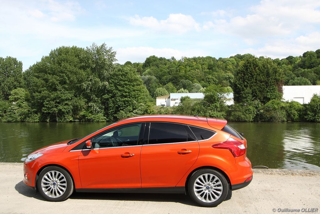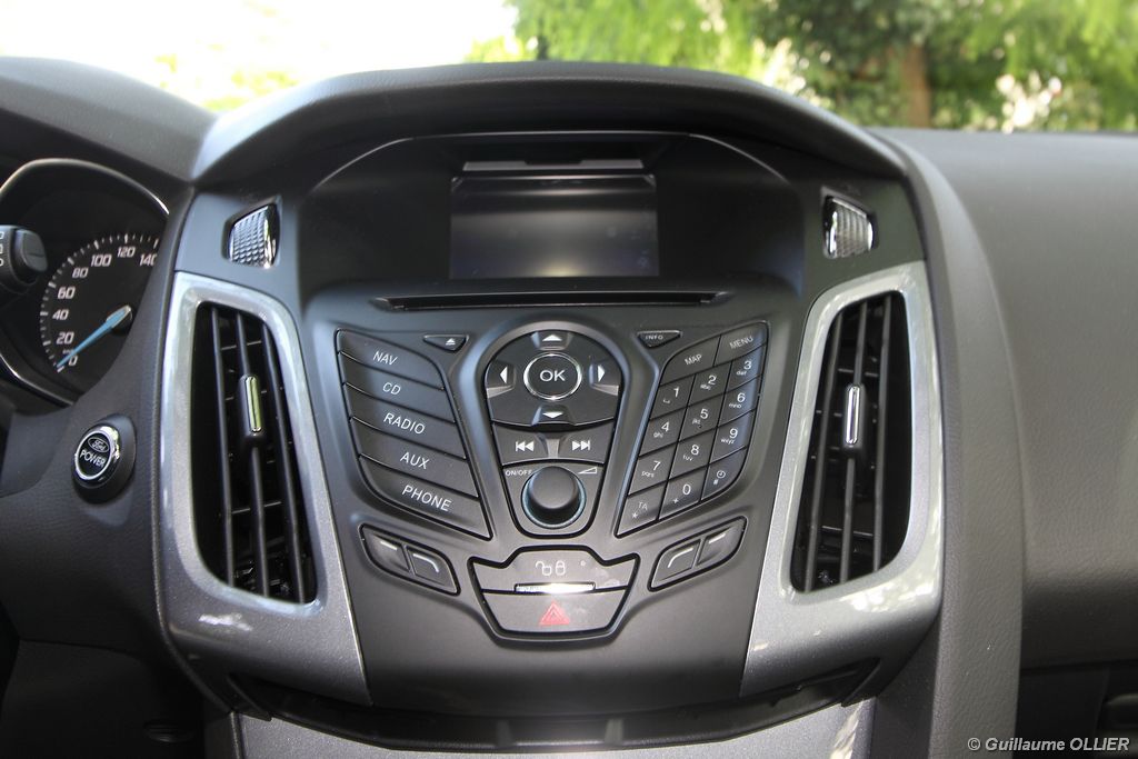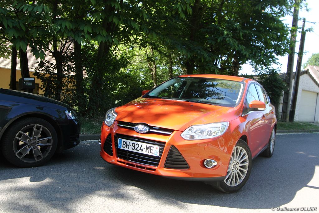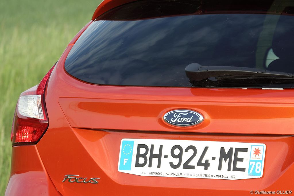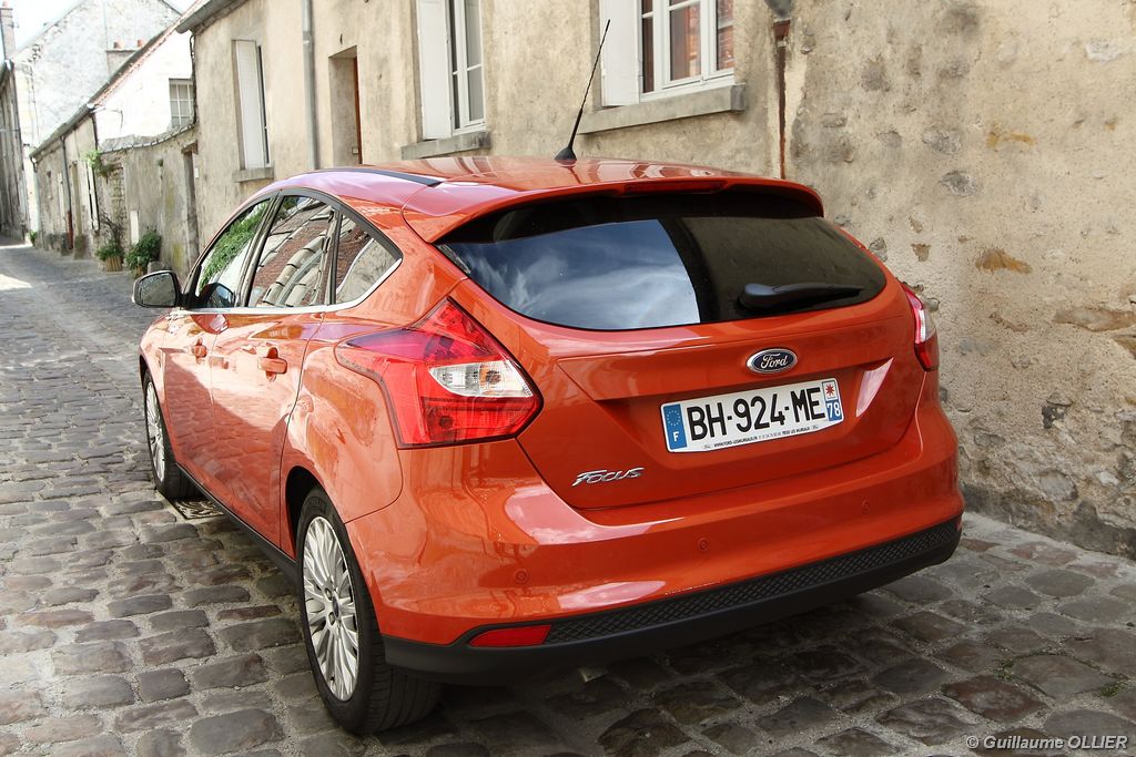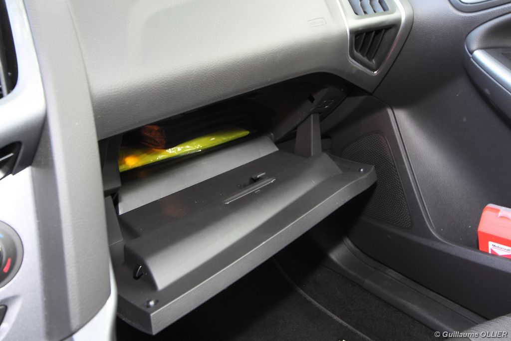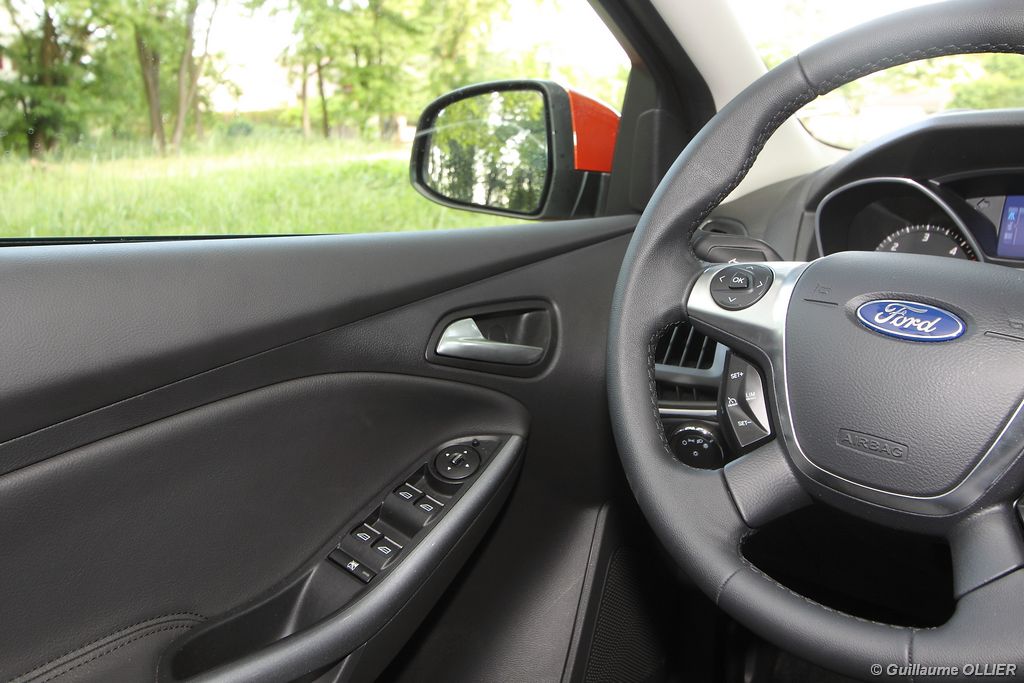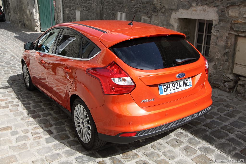 l’écran central couleur pilotable depuis les commandes au volant. Il vous faudra toutefois un temps d’adaptation, puisque l’ordinateur de bord regroupe les informations du véhicule, le kit main libre mais également les pistes de musique ou les stations de radio sous forme de dossiers. L’ergonomie est moyenne pour la partie multimédia (synchronisation Bluetooth, radio…). Il vous faudra du temps avant de vous habituer au fonctionnement, et ne pas vous perdre parmi les nombreux boutons… L’éclairage d’ambiance est à LED sur la finition Titanium. Le plafonnier, les vides poches, les caves, les poignées de portes sont ainsi éclairés par six ambiances lumineuses au choix : Bleu, vert, orange, rouge, violet, ou blanc. Le GPS facturé 590€ en option nous a un peu déçu. Peu moderne, il n’indique aucun radar et son écran de 12,7 cm est trop petit. Le système audio vous permet d’écouter vos musiques en streaming Bluetooth, ou par le biais de la prise USB compatible iPod. A la fin de l’année Ford proposera un système multimédia qui se transforme en Hot Spot Wifi lorsque vous branchez une clé 3G, afin d’offrir aux passagers un accès à Internet. Au chapitre de l’habitabilité, la Focus n’est pas la championne de sa catégorie. Même si les places arrière sont convenables, on peut s’attendre à mieux. L’espace aux genoux est correct mais la largeur allouée aux épaules et la garde au toit manquent de générosité. Le coffre offre un volume de chargement de 363 litres ce qui est dans la moyenne de la catégorie. Moins volumineux d’une trentaine de litres par rapport à l’ancienne génération, aucun effort n’a donc été apporté dans ce domaine. Dommage également lorsque l’on replie la banquette arrière de ne pas obtenir un plancher plat. Quand aux espaces de rangements ils ne sont pas nombreux, un petit logement devant le levier de vitesse vous permet tout de même de poser votre téléphone portable par exemple. La boîte à gants n’est pas très spacieuse.