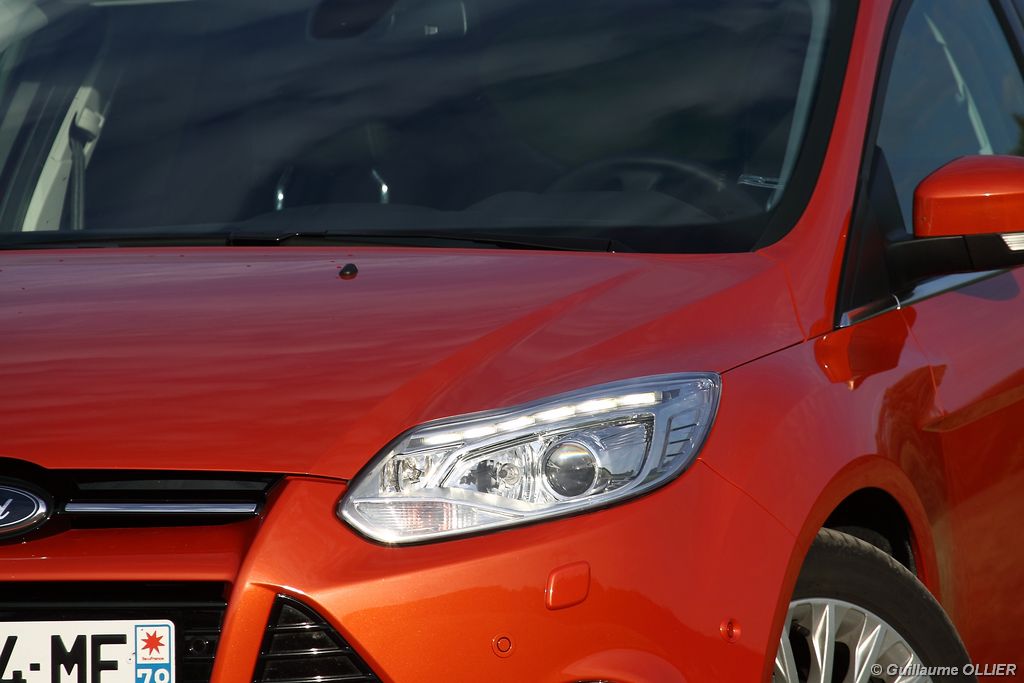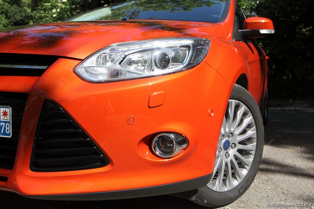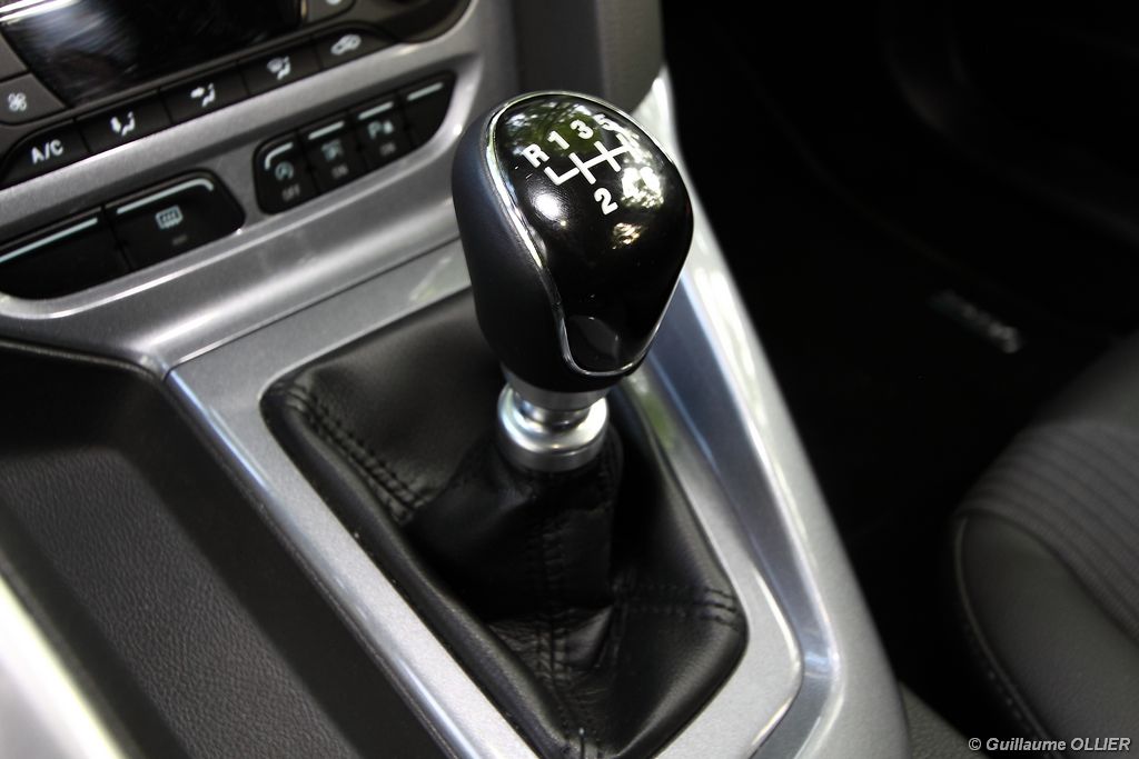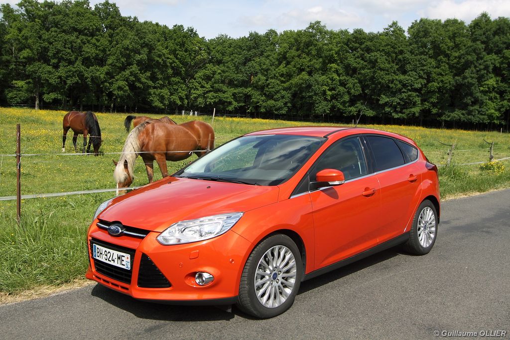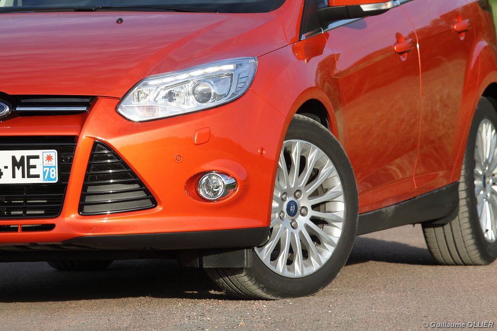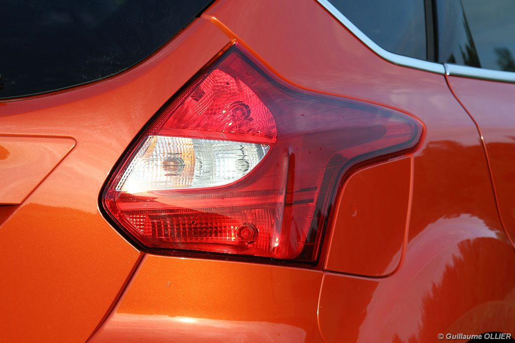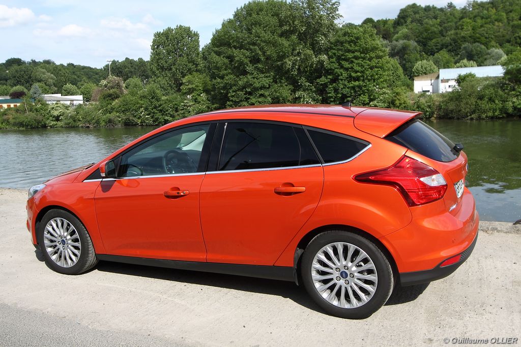 l’écran central couleur pilotable depuis les commandes au volant. Il vous faudra toutefois un temps d’adaptation, puisque l’ordinateur de bord regroupe les informations du véhicule, le kit main libre mais également les pistes de musique ou les stations de radio sous forme de dossiers. L’ergonomie est moyenne pour la partie multimédia (synchronisation Bluetooth, radio…). Il vous faudra du temps avant de vous habituer au fonctionnement, et ne pas vous perdre parmi les nombreux boutons… L’éclairage d’ambiance est à LED sur la finition Titanium. Le plafonnier, les vides poches, les caves, les poignées de portes sont ainsi éclairés par six ambiances lumineuses au choix : Bleu, vert, orange, rouge, violet, ou blanc. Le GPS facturé 590€ en option nous a un peu déçu. Peu moderne, il n’indique aucun radar et son écran de 12,7 cm est trop petit. Le système audio vous permet d’écouter vos musiques en streaming Bluetooth, ou par le biais de la prise USB compatible iPod. A la fin de l’année Ford proposera un système multimédia qui se transforme en Hot Spot Wifi lorsque vous branchez une clé 3G, afin d’offrir aux passagers un accès à Internet. Au chapitre de l’habitabilité, la Focus n’est pas la championne de sa catégorie. Même si les places arrière sont convenables, on peut s’attendre à mieux. L’espace aux genoux est correct mais la largeur allouée aux épaules et la garde au toit manquent de générosité. Le coffre offre un volume de chargement de 363 litres ce qui est dans la moyenne de la catégorie. Moins volumineux d’une trentaine de litres par rapport à l’ancienne génération, aucun effort n’a donc été apporté dans ce domaine. Dommage également lorsque l’on replie la banquette arrière de ne pas obtenir un plancher plat. Quand aux espaces de rangements ils ne sont pas nombreux, un petit logement devant le levier de vitesse vous permet tout de même de poser votre téléphone portable par exemple. La boîte à gants n’est pas très spacieuse.