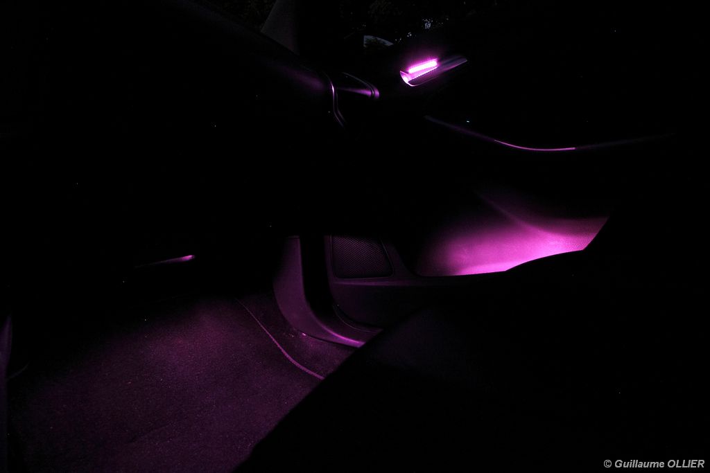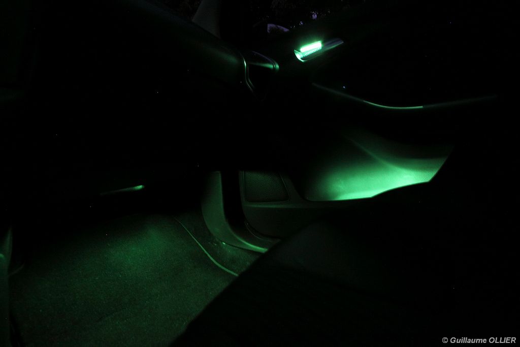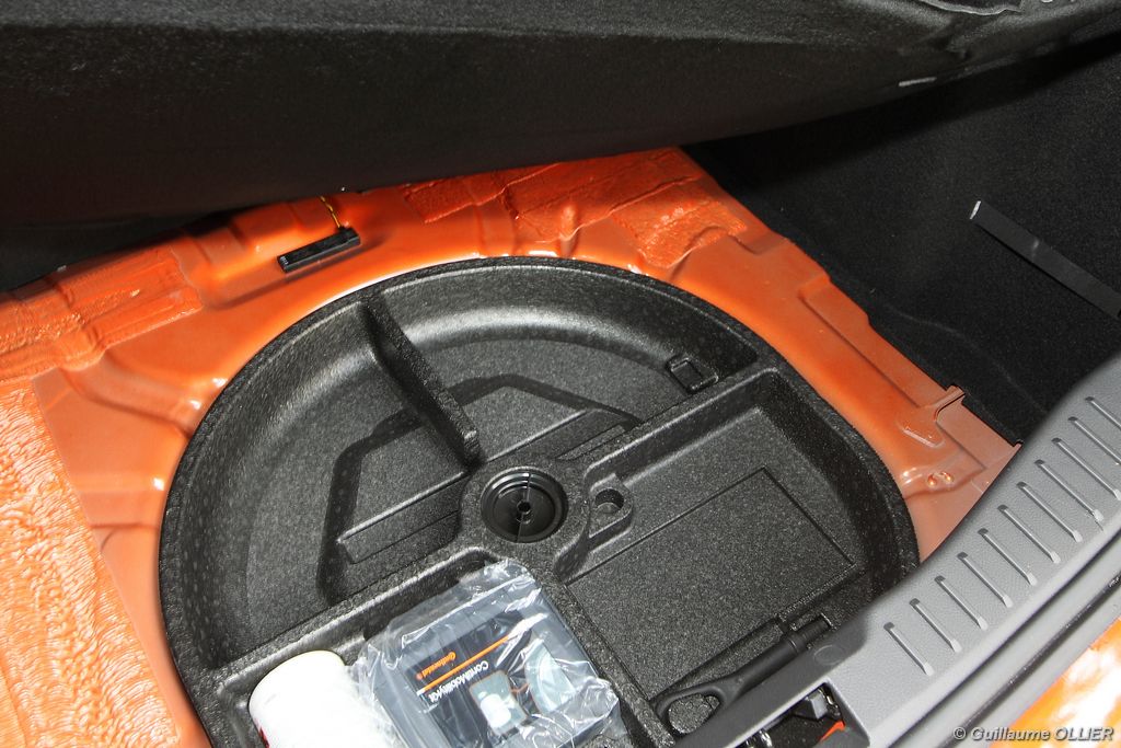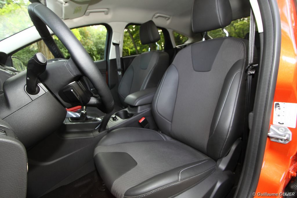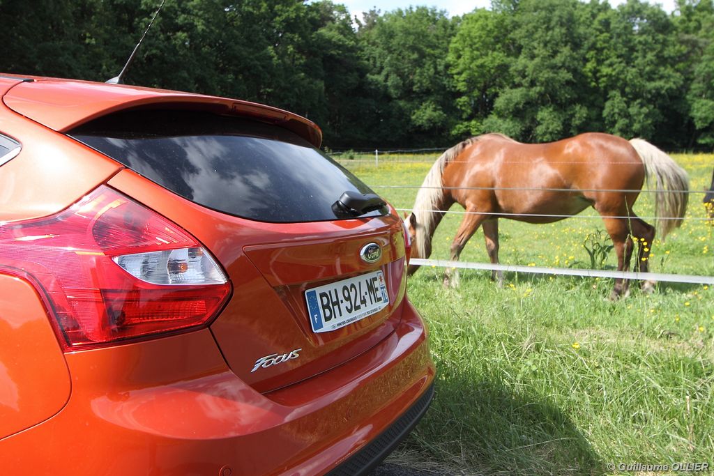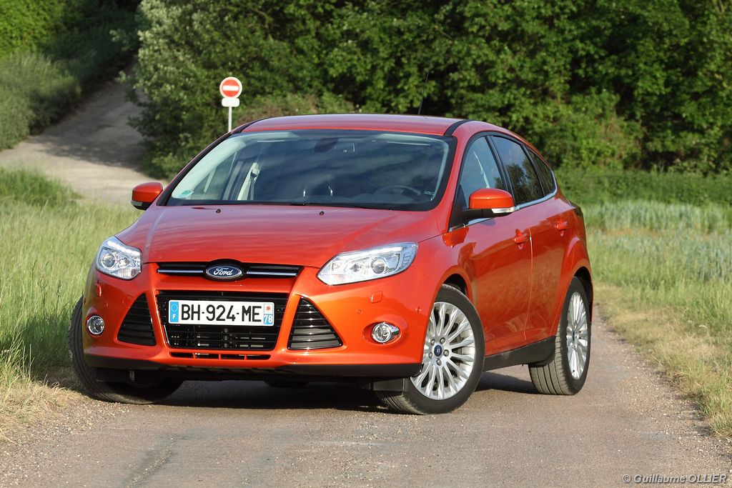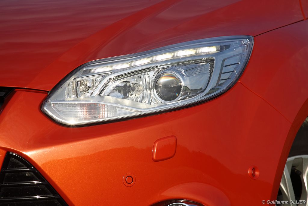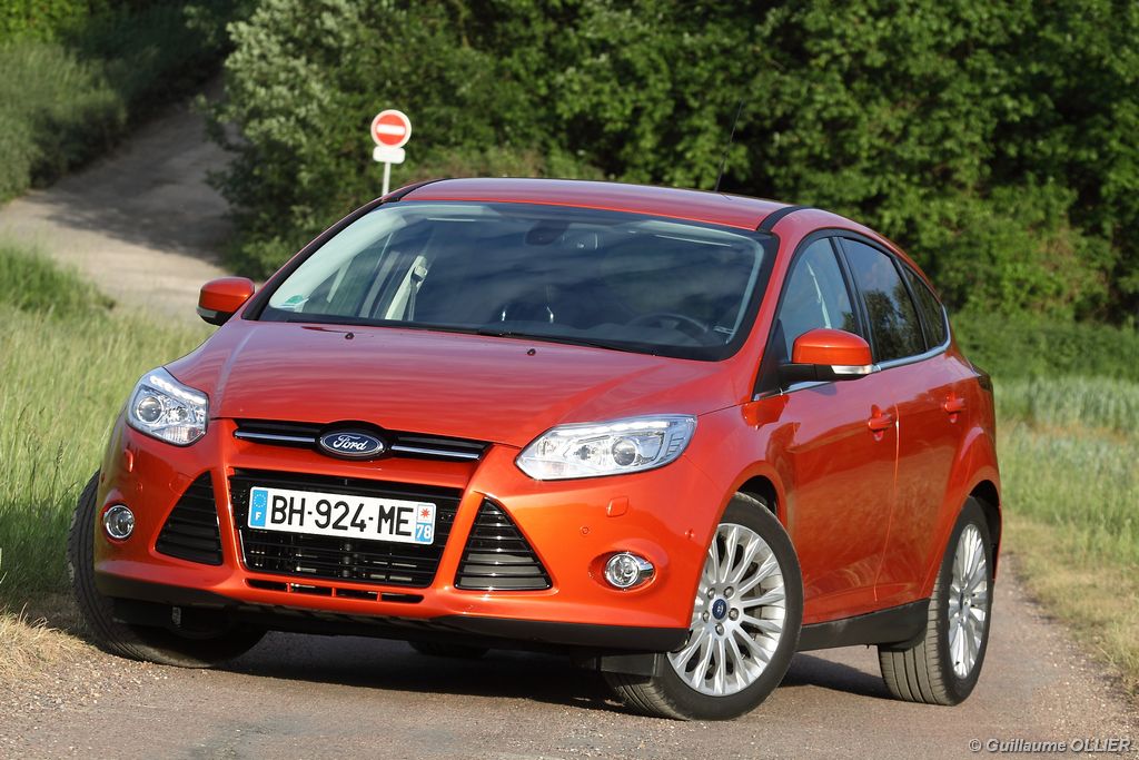 l’écran central couleur pilotable depuis les commandes au volant. Il vous faudra toutefois un temps d’adaptation, puisque l’ordinateur de bord regroupe les informations du véhicule, le kit main libre mais également les pistes de musique ou les stations de radio sous forme de dossiers. L’ergonomie est moyenne pour la partie multimédia (synchronisation Bluetooth, radio…). Il vous faudra du temps avant de vous habituer au fonctionnement, et ne pas vous perdre parmi les nombreux boutons… L’éclairage d’ambiance est à LED sur la finition Titanium. Le plafonnier, les vides poches, les caves, les poignées de portes sont ainsi éclairés par six ambiances lumineuses au choix : Bleu, vert, orange, rouge, violet, ou blanc. Le GPS facturé 590€ en option nous a un peu déçu. Peu moderne, il n’indique aucun radar et son écran de 12,7 cm est trop petit. Le système audio vous permet d’écouter vos musiques en streaming Bluetooth, ou par le biais de la prise USB compatible iPod. A la fin de l’année Ford proposera un système multimédia qui se transforme en Hot Spot Wifi lorsque vous branchez une clé 3G, afin d’offrir aux passagers un accès à Internet. Au chapitre de l’habitabilité, la Focus n’est pas la championne de sa catégorie. Même si les places arrière sont convenables, on peut s’attendre à mieux. L’espace aux genoux est correct mais la largeur allouée aux épaules et la garde au toit manquent de générosité. Le coffre offre un volume de chargement de 363 litres ce qui est dans la moyenne de la catégorie. Moins volumineux d’une trentaine de litres par rapport à l’ancienne génération, aucun effort n’a donc été apporté dans ce domaine. Dommage également lorsque l’on replie la banquette arrière de ne pas obtenir un plancher plat. Quand aux espaces de rangements ils ne sont pas nombreux, un petit logement devant le levier de vitesse vous permet tout de même de poser votre téléphone portable par exemple. La boîte à gants n’est pas très spacieuse.