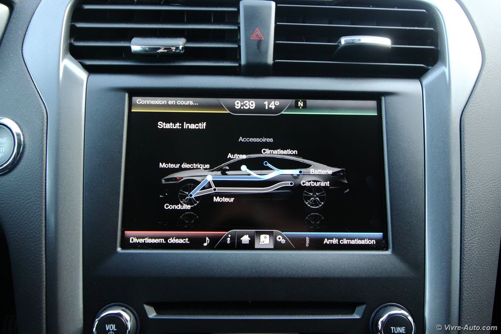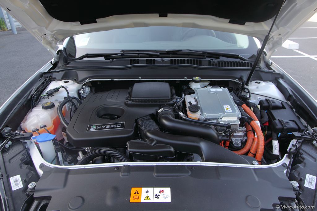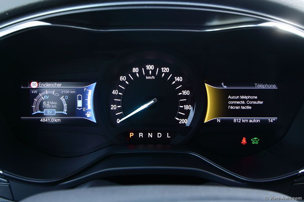 Passons maintenant à la technique. Comment ça fonctionne ? Sous le capot on retrouve un moteur essence 2.0 litres Atkinson de 141 ch spécialement conçu, il est associé à deux moteurs électriques, le premier de 88 kW (120 ch) vient assister les roues avant, tandis que le second, logé sous les sièges arrière, recharge la batterie lors des phases de décélération ou de freinage. L’ensemble cumulé offre une puissance totale de 187 ch et un couple de 173 Nm. Le système fonctionne en toute autonomie, on oublie donc les modes 100% électrique « EV » et charge « Save » que l’on retrouve habituellement sur les modèles hybrides. Et ce n’est pas plus mal, on rejoint ainsi l’objectif de Ford qui est de conserver le même comportement au volant qu’une version thermique tout en améliorant sa conduite pour la rendre plus économe. Sur le tableau de bord, l’affichage indique quel moteur est en service ou le nombre de kilomètres parcourus en tout électrique. C’est assez clair et simple.