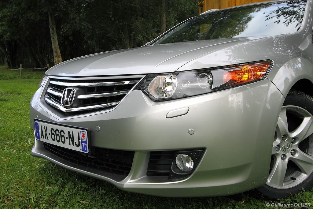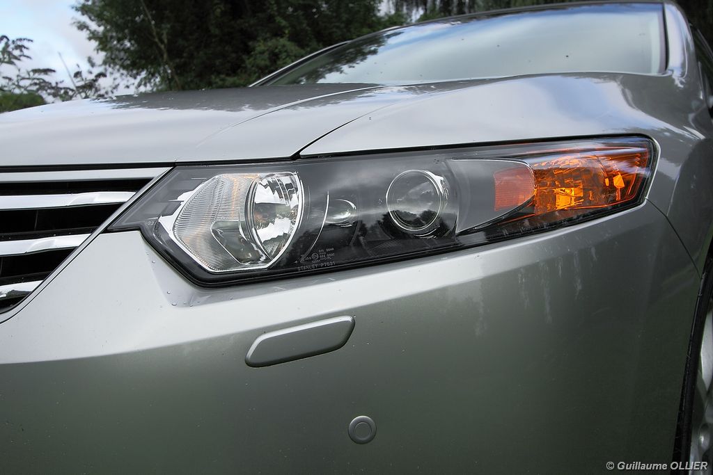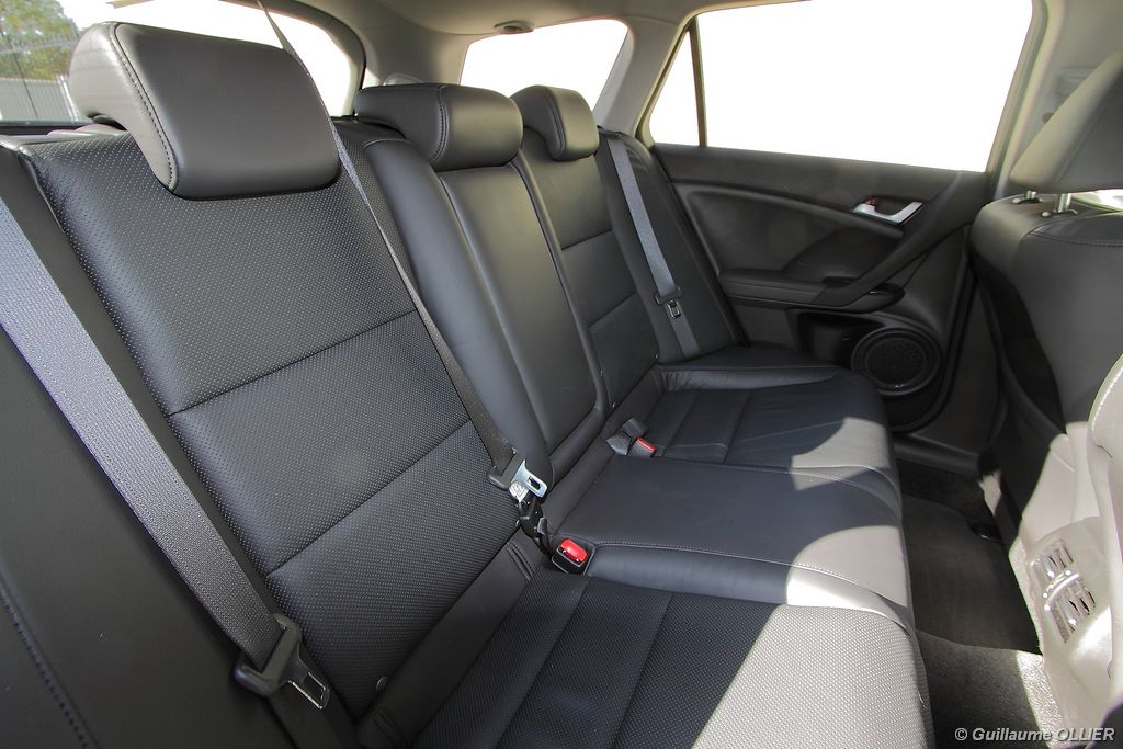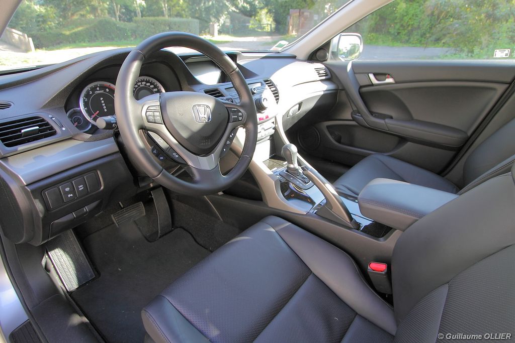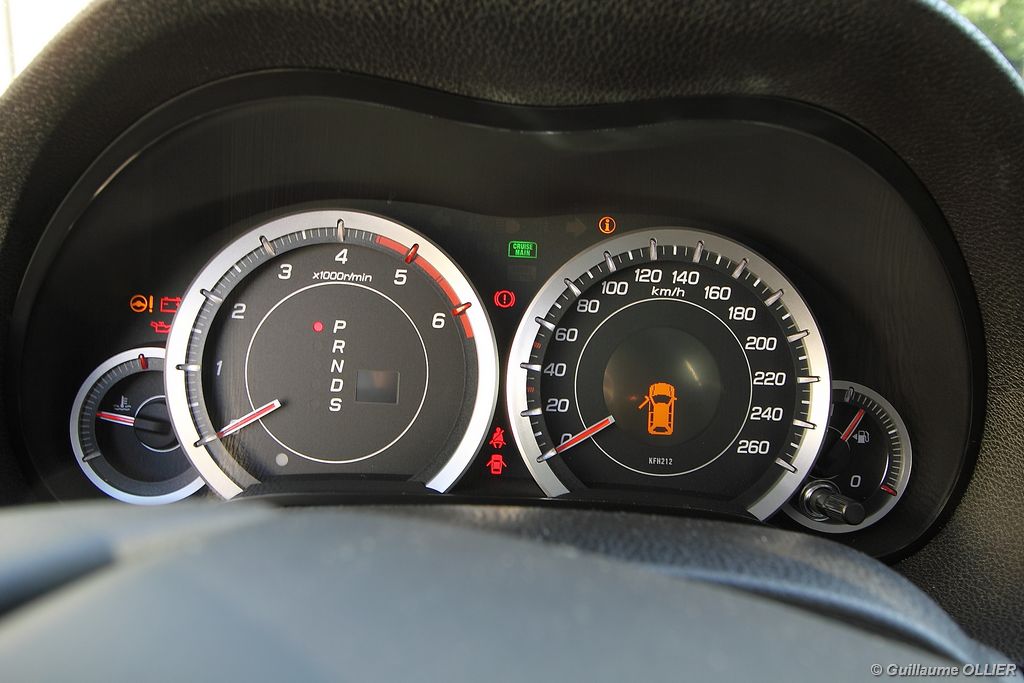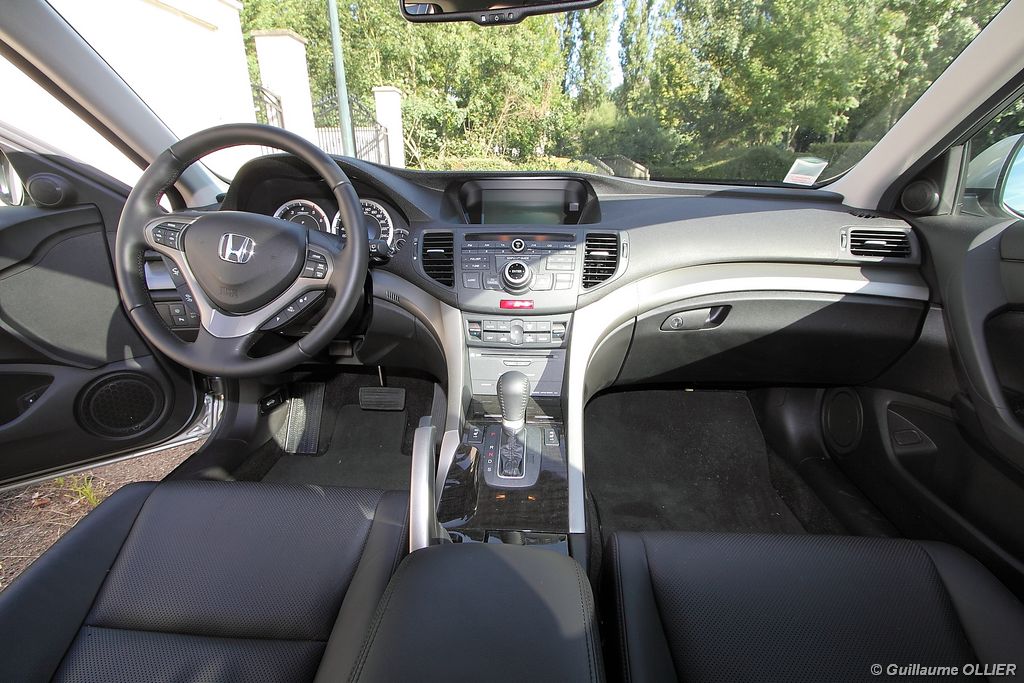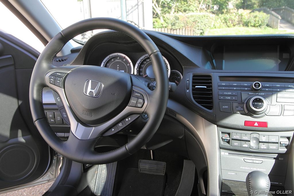 A l’intérieur rien ne change, et l’ambiance sportive est toujours présente. La qualité des matériaux est correcte, et l’ensemble ne souffre d’aucun reproche. L’ergonomie est bonne même si la profusion de boutons sur la planche de bord et sur le volant peut déstabiliser au début. Le GPS mériterait un rajeunissement, ne comptez pas sur lui pour vous indiquer les radars par exemple. Les sièges avant sont plutôt confortables, mais à l’arrière les places manquent de générosité, avec un tunnel central un peu trop massif. Les rangements dans l’habitacle sont nombreux : petit compartiment à côté du volant, pochettes sur les côtés de la console centrale, logement profond dans les portes avant, porte-gobelets sur la console centrale et dans l’accoudoir arrière, porte-bouteilles dans les panneaux de portes arrière. Sur le plan technologique Honda a greffé deux nouveaux équipements propre à l’éclairage sur sa familiale. Les nouveaux feux avant dorénavant bi-Xénon intègrent un éclairage actif d’intersection. Lorsque l’angle de rotation du volant dépasse les 90 degrés et si le véhicule roule en dessous de 35 km/h, un faisceau de lumière supplémentaire s’allume du côté en question. L’Accord dispose également des feux de route actifs, un système qui, à l’aide d’une caméra gère automatiquement le passage des feux de route en feux de croisement lorsqu‘un véhicule arrive en face.