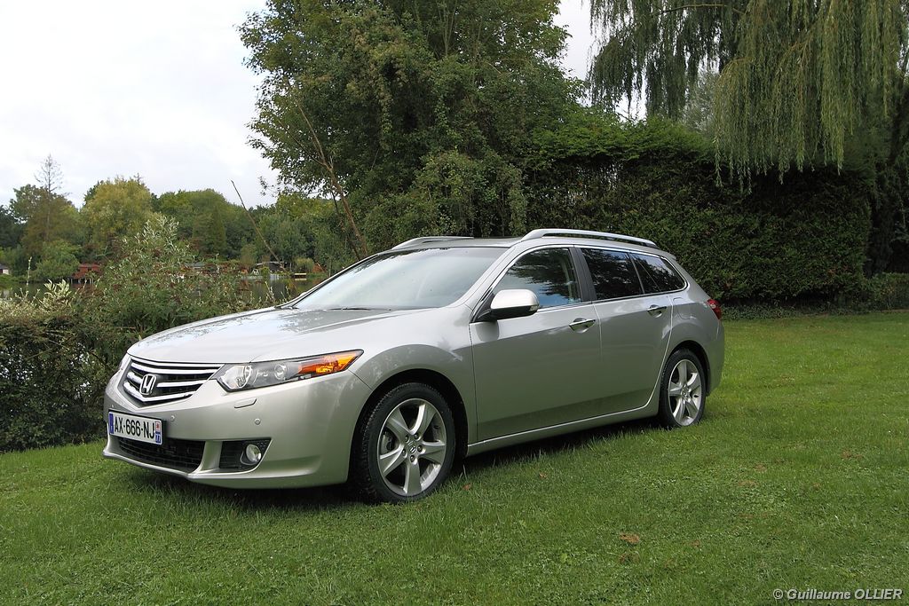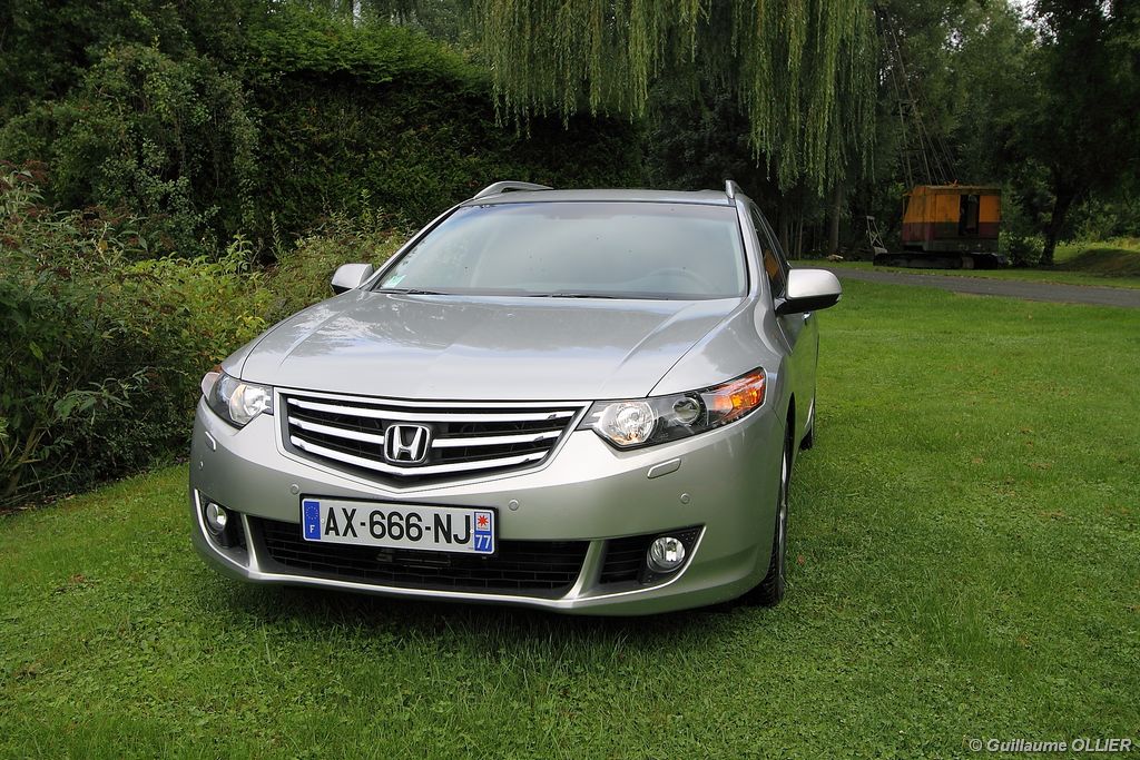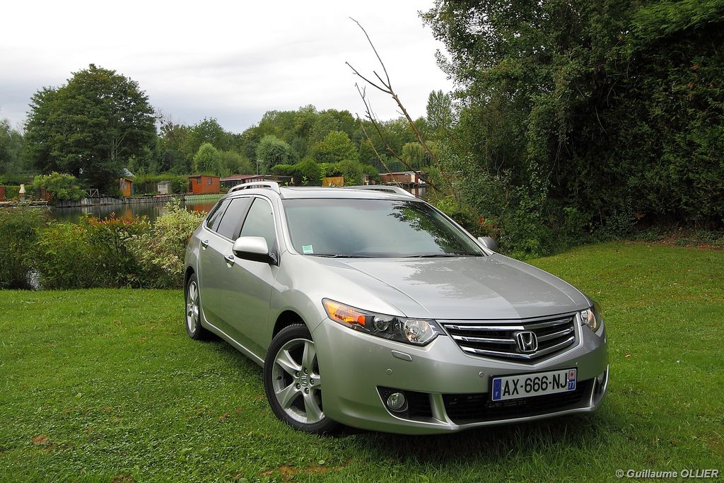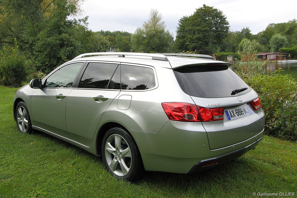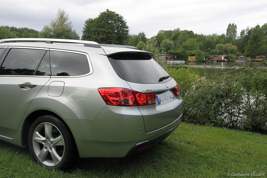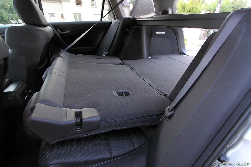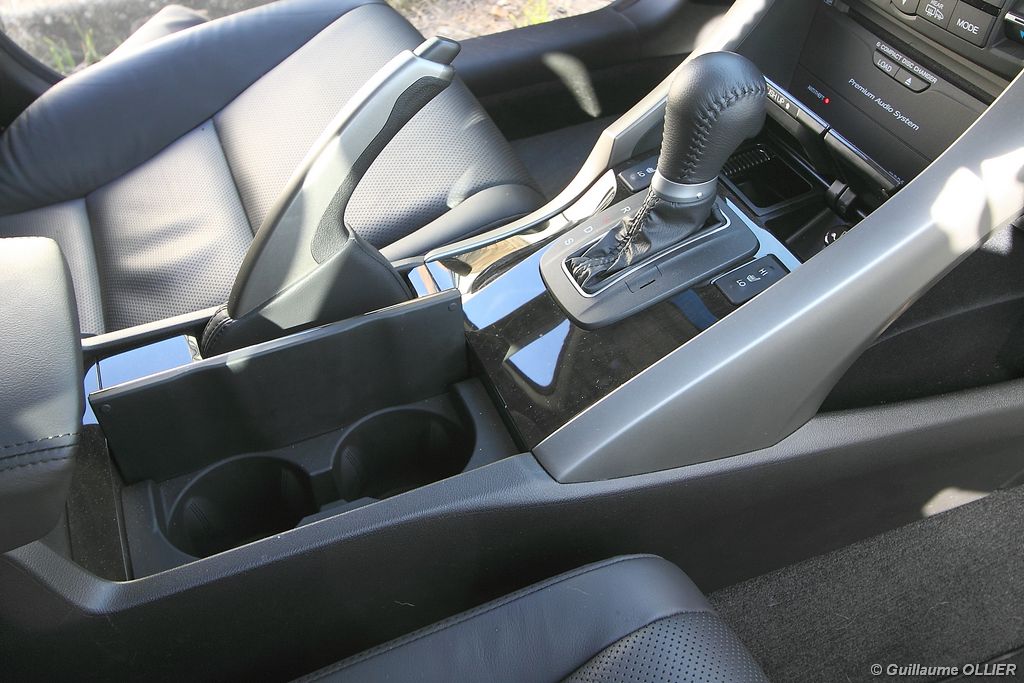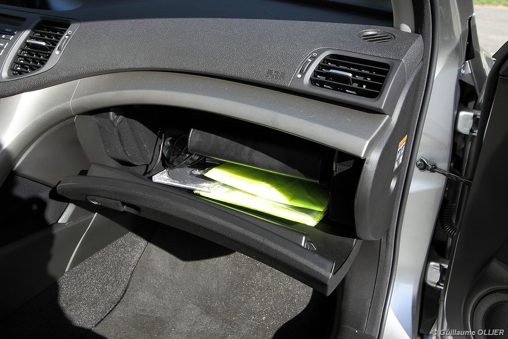 A l’intérieur rien ne change, et l’ambiance sportive est toujours présente. La qualité des matériaux est correcte, et l’ensemble ne souffre d’aucun reproche. L’ergonomie est bonne même si la profusion de boutons sur la planche de bord et sur le volant peut déstabiliser au début. Le GPS mériterait un rajeunissement, ne comptez pas sur lui pour vous indiquer les radars par exemple. Les sièges avant sont plutôt confortables, mais à l’arrière les places manquent de générosité, avec un tunnel central un peu trop massif. Les rangements dans l’habitacle sont nombreux : petit compartiment à côté du volant, pochettes sur les côtés de la console centrale, logement profond dans les portes avant, porte-gobelets sur la console centrale et dans l’accoudoir arrière, porte-bouteilles dans les panneaux de portes arrière. Sur le plan technologique Honda a greffé deux nouveaux équipements propre à l’éclairage sur sa familiale. Les nouveaux feux avant dorénavant bi-Xénon intègrent un éclairage actif d’intersection. Lorsque l’angle de rotation du volant dépasse les 90 degrés et si le véhicule roule en dessous de 35 km/h, un faisceau de lumière supplémentaire s’allume du côté en question. L’Accord dispose également des feux de route actifs, un système qui, à l’aide d’une caméra gère automatiquement le passage des feux de route en feux de croisement lorsqu‘un véhicule arrive en face.