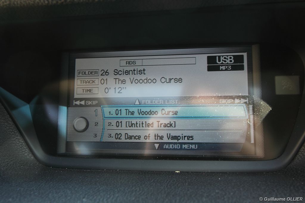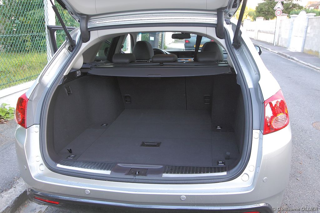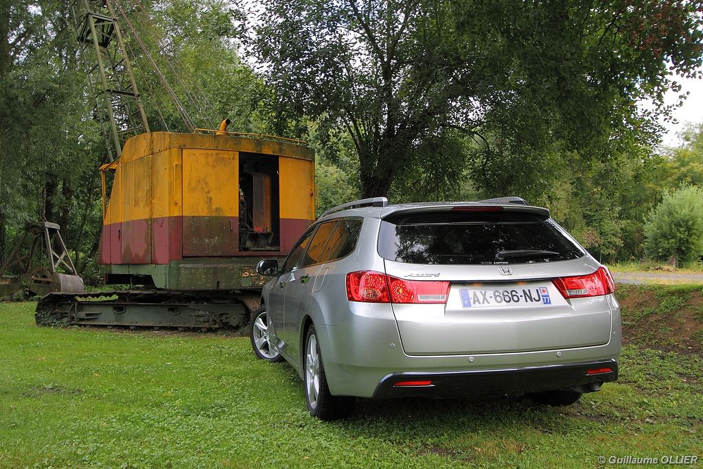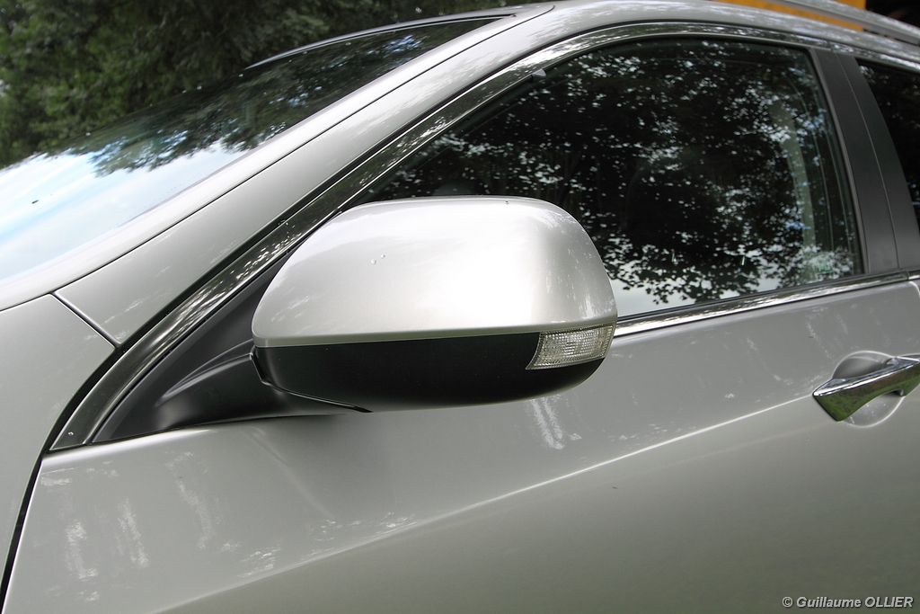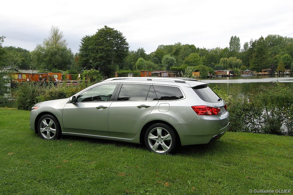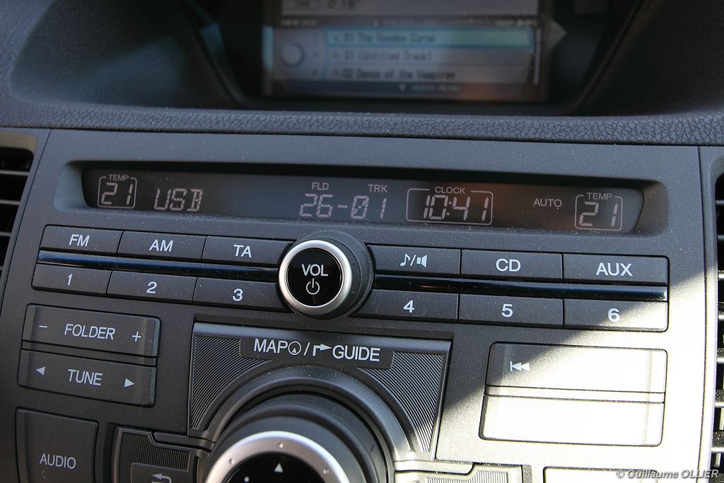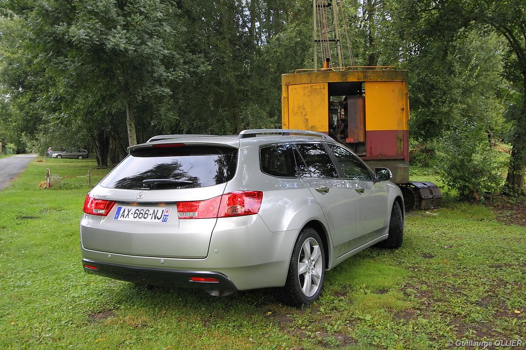 A l’intérieur rien ne change, et l’ambiance sportive est toujours présente. La qualité des matériaux est correcte, et l’ensemble ne souffre d’aucun reproche. L’ergonomie est bonne même si la profusion de boutons sur la planche de bord et sur le volant peut déstabiliser au début. Le GPS mériterait un rajeunissement, ne comptez pas sur lui pour vous indiquer les radars par exemple. Les sièges avant sont plutôt confortables, mais à l’arrière les places manquent de générosité, avec un tunnel central un peu trop massif. Les rangements dans l’habitacle sont nombreux : petit compartiment à côté du volant, pochettes sur les côtés de la console centrale, logement profond dans les portes avant, porte-gobelets sur la console centrale et dans l’accoudoir arrière, porte-bouteilles dans les panneaux de portes arrière. Sur le plan technologique Honda a greffé deux nouveaux équipements propre à l’éclairage sur sa familiale. Les nouveaux feux avant dorénavant bi-Xénon intègrent un éclairage actif d’intersection. Lorsque l’angle de rotation du volant dépasse les 90 degrés et si le véhicule roule en dessous de 35 km/h, un faisceau de lumière supplémentaire s’allume du côté en question. L’Accord dispose également des feux de route actifs, un système qui, à l’aide d’une caméra gère automatiquement le passage des feux de route en feux de croisement lorsqu‘un véhicule arrive en face.