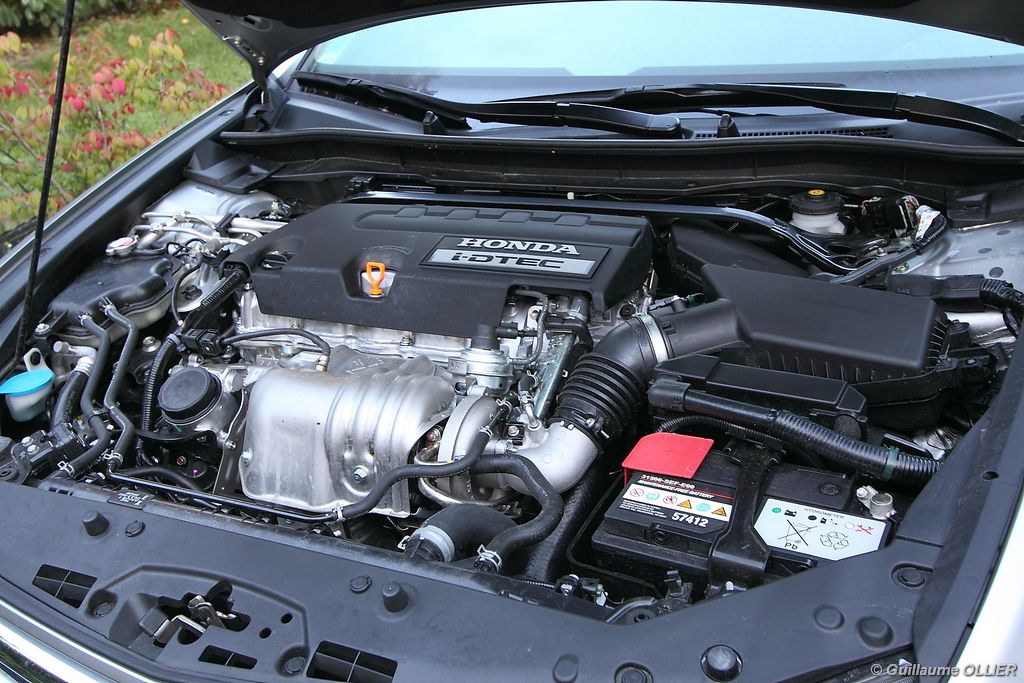 L’Accord bénéficie enfin d’un deuxième moteur Diesel, avec une puissance portée à 180 ch. Le i-DTEC 150 est toujours proposé au catalogue avec en prime une baisse des émissions de CO2. Tout d’abord nous avons pris la route au volant du i-DTEC 150. Développant 150 ch à 4 000 tr/mn et un couple de 350 Nm à 2 000 tr/mn, il offre de belles prestations et de bonnes reprises sur une très large plage d’utilisation. Largement suffisant pour les 1,6 tonne de notre version break à l’essai. Cette motorisation est associée soit avec une boîte mécanique 6 rapports, soit en boîte automatique à 5 rapports comme sur notre modèle. Les passages sont doux et rapides, cette transmission s’adapte parfaitement au conducteur et aucun à-coup ne se ressent. Nous aurions en revanche apprécié que le guidage se termine par la position D et non S, ce qui faciliterait l’utilisation, d’autant plus que la majorité des conducteurs utilisent très peu le mode séquentiel. La consommation relevée lors de notre essai sur route se situait entre 7l et 8l /100 km, et en usage urbain 9l /100 km. En version boîte manuelle, vous pourrez obtenir un gain d’environ 0,7 l /100km en moins. Le i-DTEC 180 est un peu plus coupleux avec 380 Nm, nous l’avons trouvé très souple et disponible. Il réagit sans problème lorsque vous montez dans les
