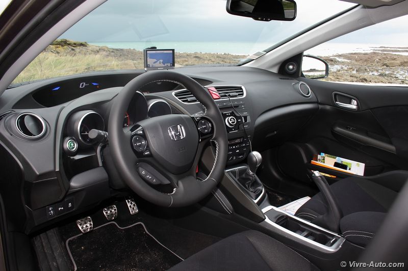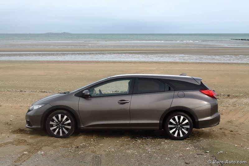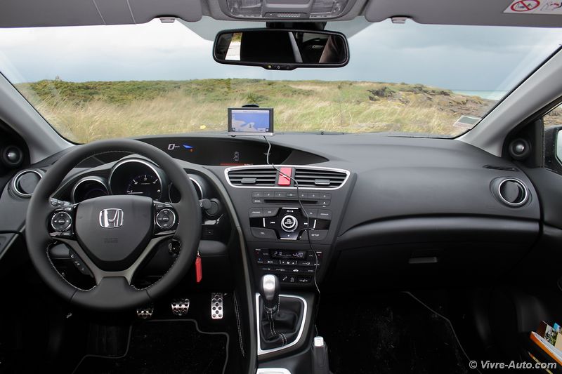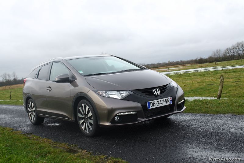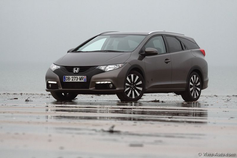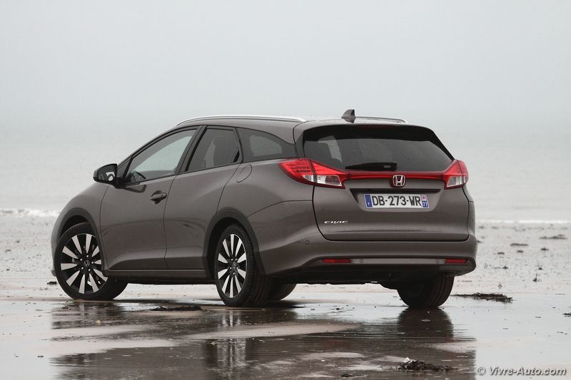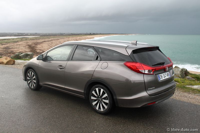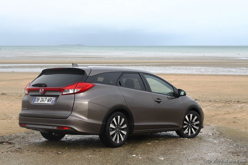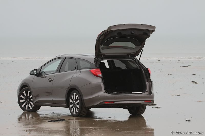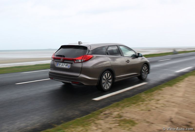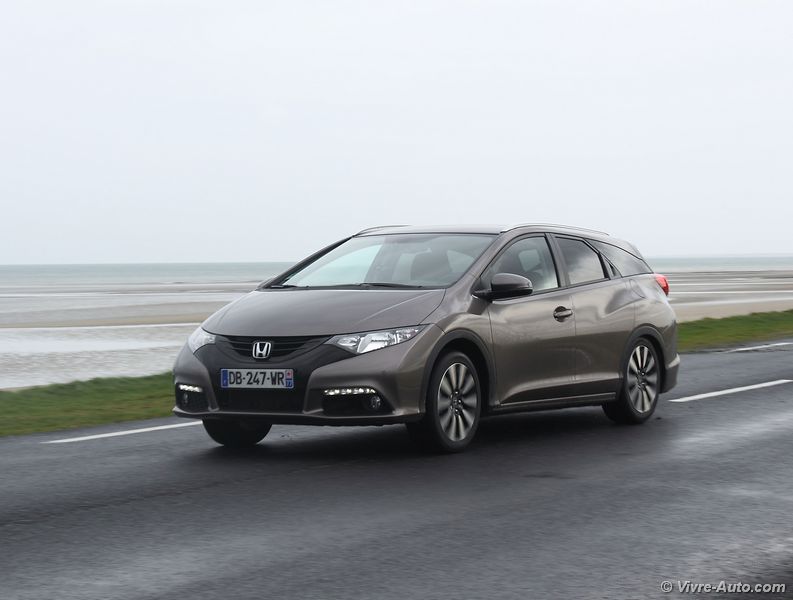 A l’avant, le Tourer reprend les dernières évolutions de la Civic 2014, à savoir : un diamètre de la jante du volant plus important, des décors noir brillant, des cerclages chromés et des surpiqûres blanche. La qualité des matériaux est de bonne facture, les assemblages sont bons et la présentation soignée. Les commandes tombent aisément sous la main et nous n’avons pas eu de mal à s’y retrouver. Les équipements sont assez complets avec la climatisation bi-zone, les sièges chauffants, la caméra de recul, les feux de route automatiques… Seul bémol, si vous souhaitez le GPS il faut prendre la finition spéciale « Executive Navi » et la note grimpe puisque le surcoût est de 1 200€ ! La finition la plus haute propose des équipements de sécurité des plus complets avec un détecteur d’angle mort, la reconnaissance des panneaux de signalisation, un détecteur de franchissement de file, un système de prévention de collision frontale avec freinage sous les 32 km/h, et un système d’assistance aux intersections qui vous averti lors d’une marche arrière si des véhicules arrivent à gauche et à droite. Avec tout de même un surcoût de 1 200€ par rapport à la berline, le Tourer se place correctement en tarifs à équipements équivalents face à la concurrence mais ne propose pas d’option ce qui oblige l’acheteur à prendre obligatoirement la finition qui propose l’équipement souhaité.