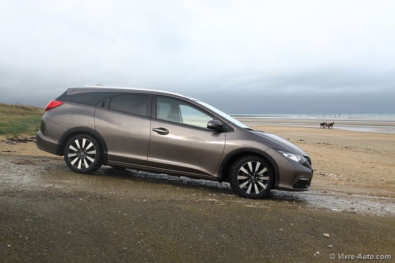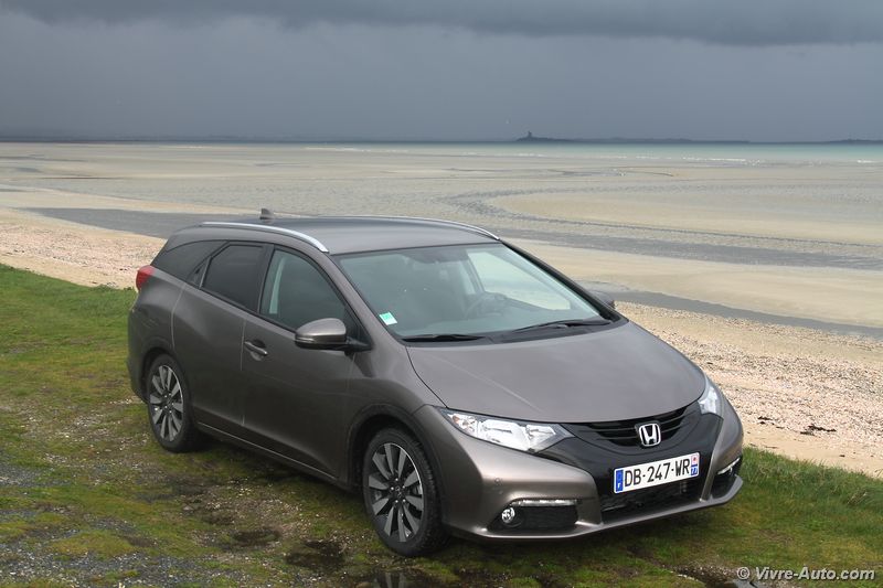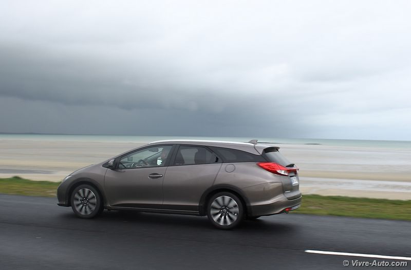 Ceinture bouclée, c’est parti pour plusieurs centaines de kilomètres sur les routes du Cotentin. On se sent tout de suite bien au volant, avec une bonne lecture des informations et les sièges offrent un bon maintient latéral. Le Tourer est proposé avec deux moteurs au catalogue, un essence 1.8 i-VTEC de 142 ch en boîte manuelle ou automatique, et le Diesel 1.6 i-DTEC de 120 ch uniquement en boîte mécanique qui équipait notre voiture. En agglomération, ce bloc se montre très appréciable de part sa souplesse et sa discrétion. Une fois sortie de la ville, on remarque tout de suite que les 300 Nm de couple sont bien présents avec des accélérations franches et des bonnes reprises. Même si les adeptes des transmissions automatiques devront malheureusement passer leur chemin, la boîte manuelle à six rapports est très bien étagée. En jantes 16 pouces, le 1.6 i-DTEC n’émet que 99g de CO² et échappe au malus. Nous n’avons pas dépassé les 6l/100 km de consommation moyenne durant notre essai malgré une conduite pas toujours portée sur l’économie. A l’inverse et avec le mode « Eco » enclenché, il est possible de faire baisser cette moyenne sous la barre des 5l. Pour cette version break, le châssis a évolué avec des réglages de suspensions spécifiques et une barre anti-roulis. Sur les versions Exclusive Navi et Innova, les roues arrière disposent d’une suspension adaptative. Un calculateur agit sur les amortisseurs pour limiter les effets de pompage en charge et trois modes sont proposés : Confort, Normal et Dynamique. Même si nous n’avons pas pu essayer ce système avec un coffre chargé nous avons testé les trois positions et constaté des différences sur le confort. Notre Tourer s’est extrêmement bien comporté sur les routes normandes, s’inscrivant bien en courbe et offrant un bon compromis pour le confort même avec la monte pneumatique 18 pouces.