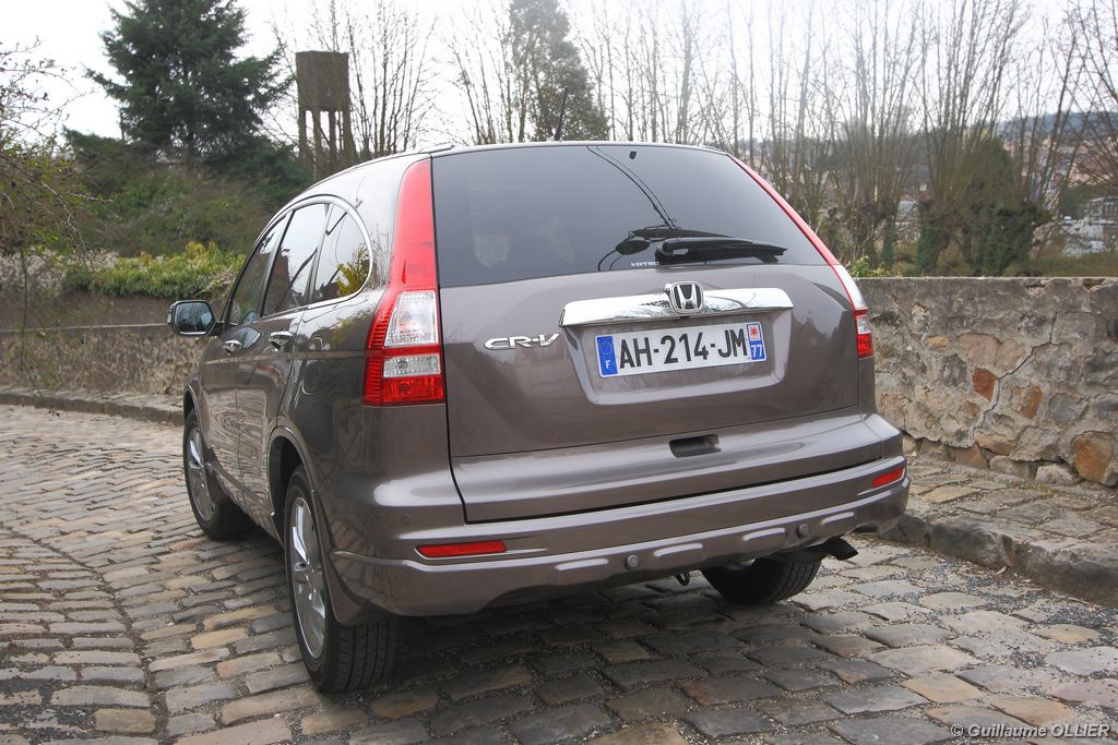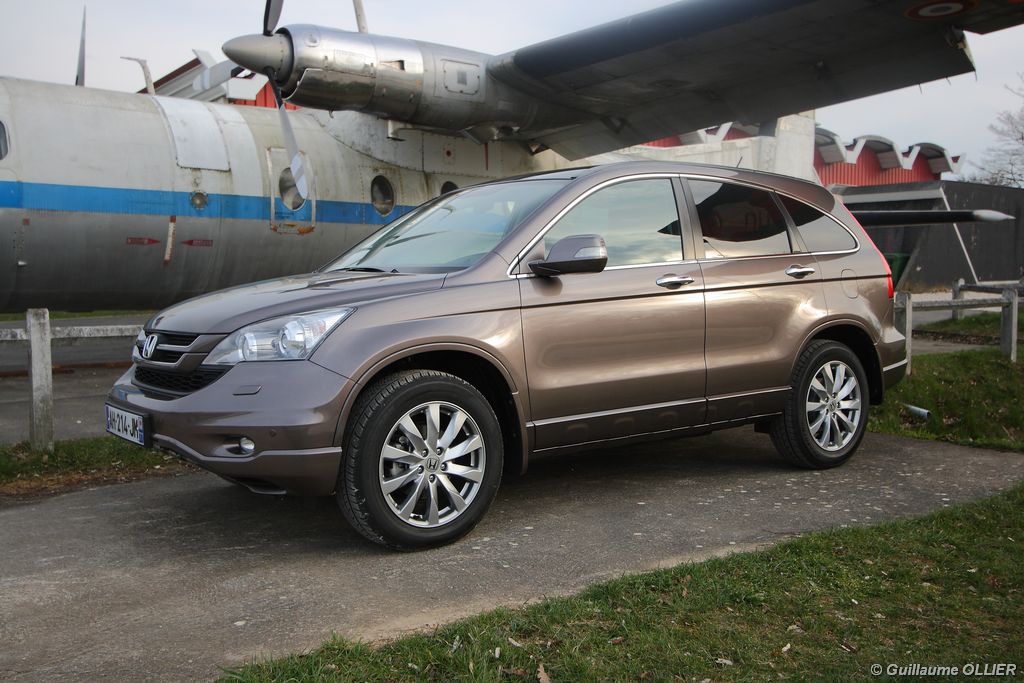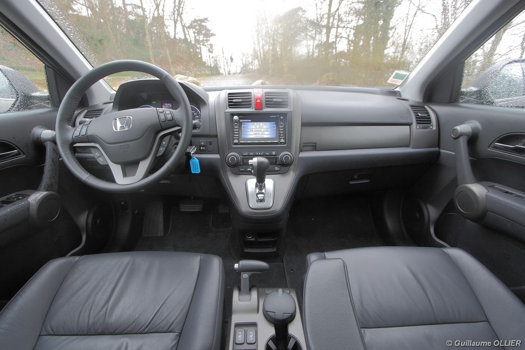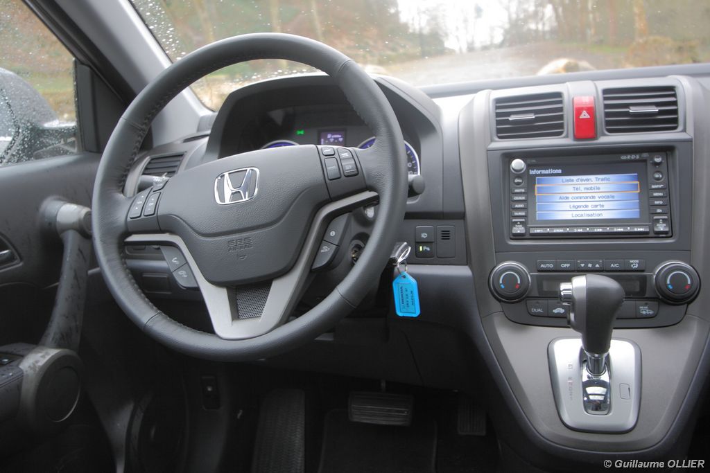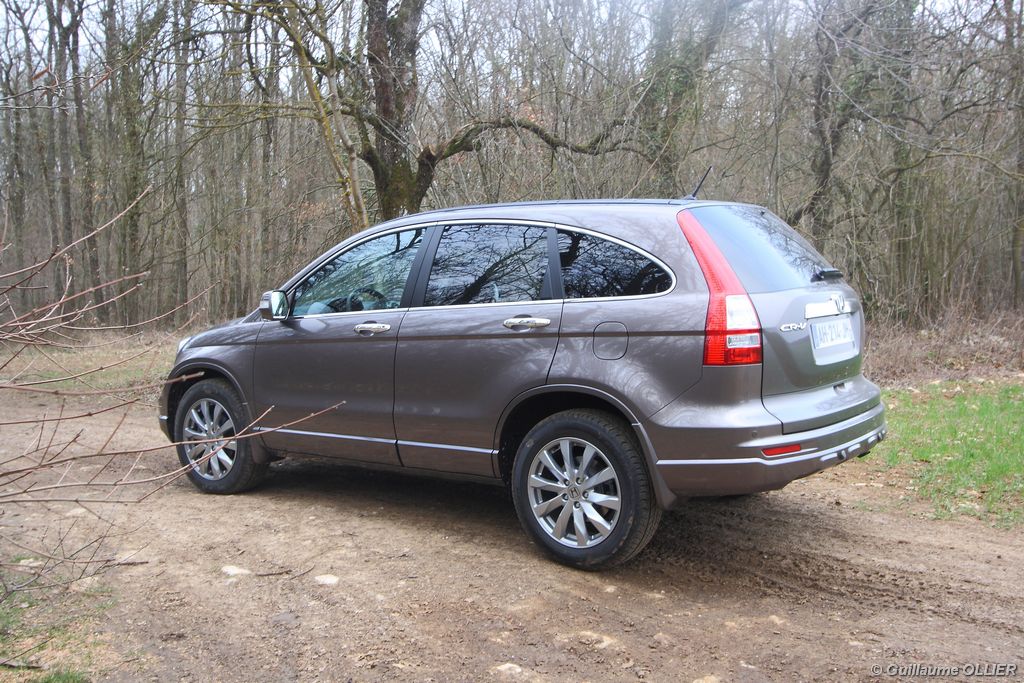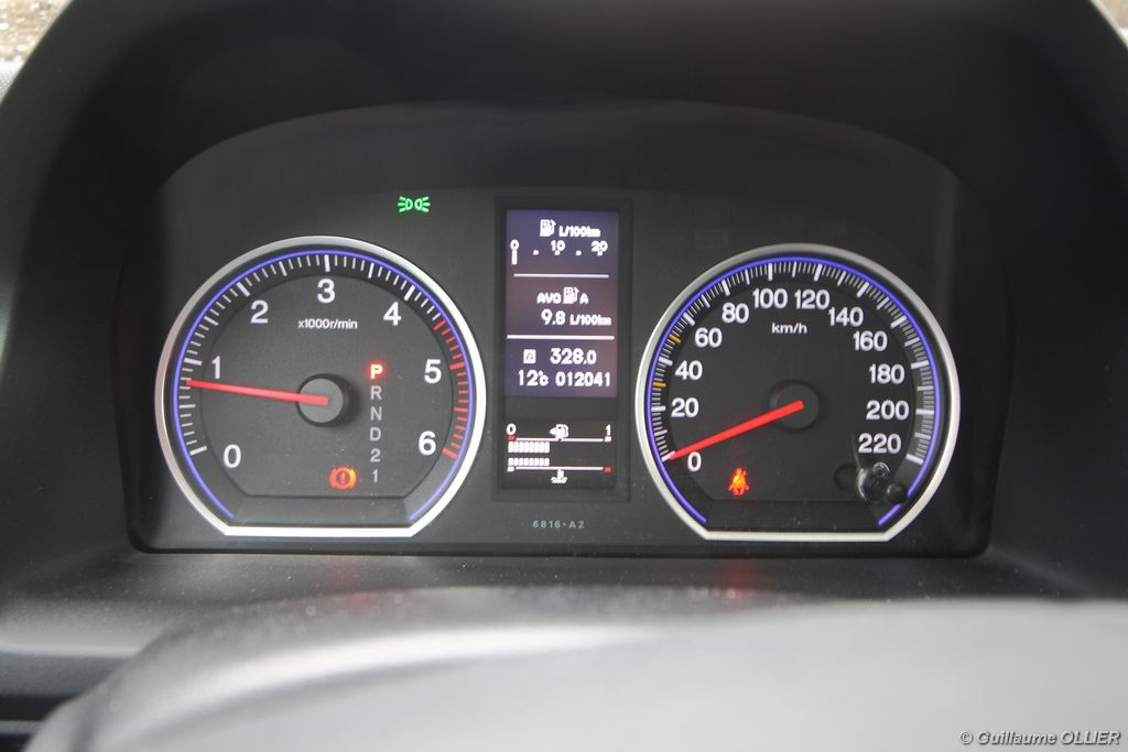être un plus. Avec cinq rapports, il est tout à fait possible de n’utiliser que les trois premiers, lors de franchissement. Les trains roulants confèrent une bonne stabilité en courbe, mais les pneumatiques Dunlop Grantrek se font entendre lors de rapides virages. La direction quand à elle, manque de précision sur route. Hors des sentiers battus, le CR-V se comporte comme un 4×4, avec sa transmission intégrale. Elle n’est pas permanente, ce qui permet d’économiser un peu de carburant lorsque deux roues motrices suffisent. Avec une garde au sol de 185 mm, il est tout à fait possible d’emprunter des chemins très abimés. Nous avons d’ailleurs été surpris par le confort relevé sur ce type de parcours. Enfin, au chapitre consommation, le SUV nippon est assez gourmand. Avec une moyenne de 9,5l /100 km lors de notre essai, on ne peut pas dire que la sobriété est son point fort. La transmission à convertisseur de couple y est peut-être pour quelque chose. Toutefois, en cycle extra urbain il est possible de descendre sous les 9 litres.