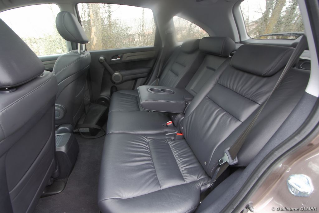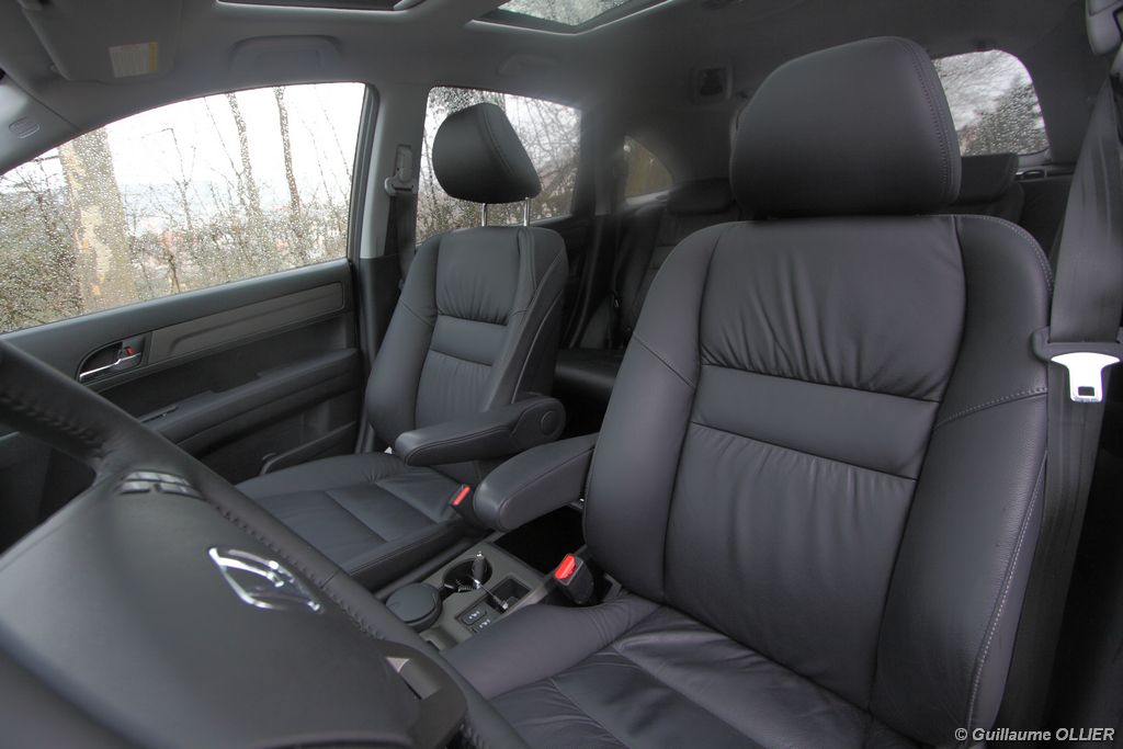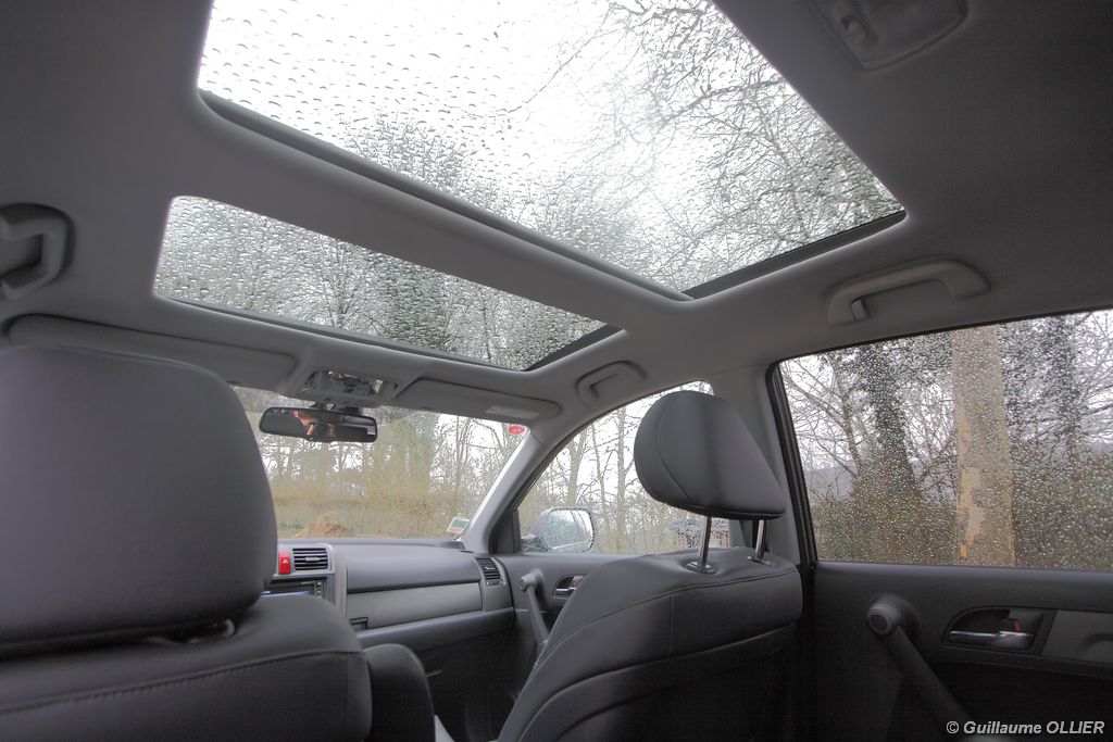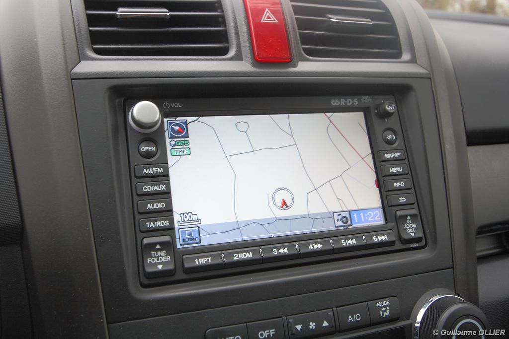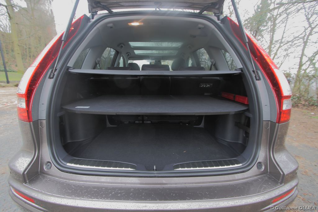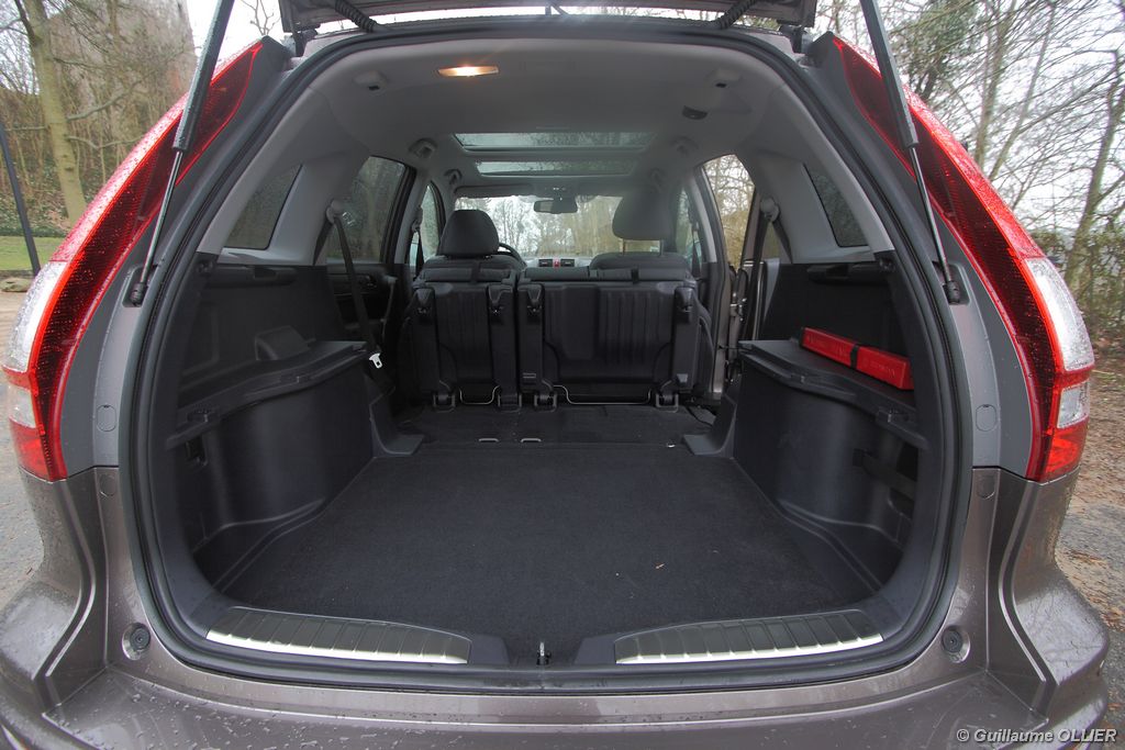 Le coffre offre un très bon volume de chargement avec 442 dm3, pouvant s’étendre jusqu’à 955 dm3 une fois la banquette arrière rabattue, cette opération étant plutôt facile à réaliser. L’équipement a aussi été peaufiné avec l’ajout d’un système de surveillance des pressions des pneumatiques, d’un régulateur de vitesse adaptatif (non présent sur notre modèle), d’un système audio muni d’un port USB compatible iPod, et du kit main libre Bluetooth, dont l’utilisation n’est pas des plus simples, du moins pour jumeler un téléphone. A cela s’ajoute une climatisation bizone, une sellerie cuir, et une caméra de recul qui s’avère très pratique ! Le CR-V reçoit également un double toit en verre qui apporte de la lumière dans l’habitacle, mais malheureusement non ouvrable. L’ergonomie est bien étudiée, avec des commandes au volant, et un écran de navigation tactile. Le GPS, malgré qu’il soit complet n’est point récent, et il faudra se contenter d’un affichage de carte en 2D. Au final, ce SUV reprend plusieurs gènes d’un monospace, avec une habitabilité et une modularité plus que correctes.