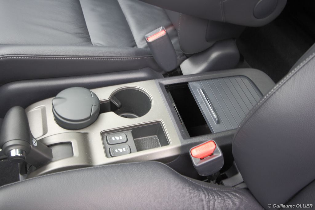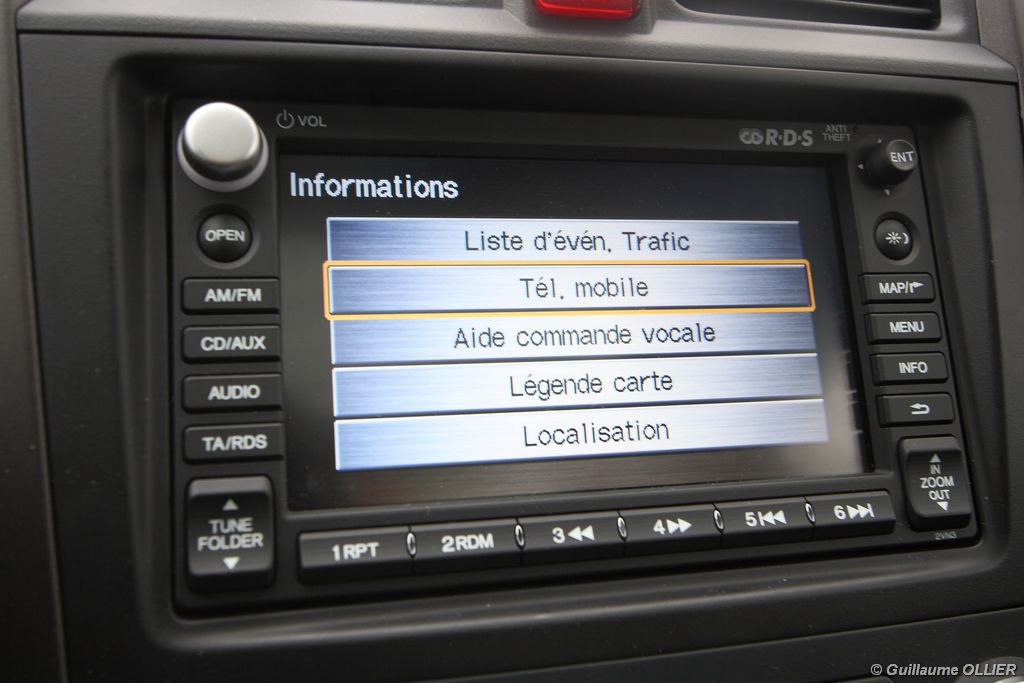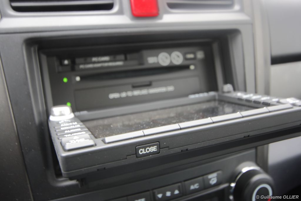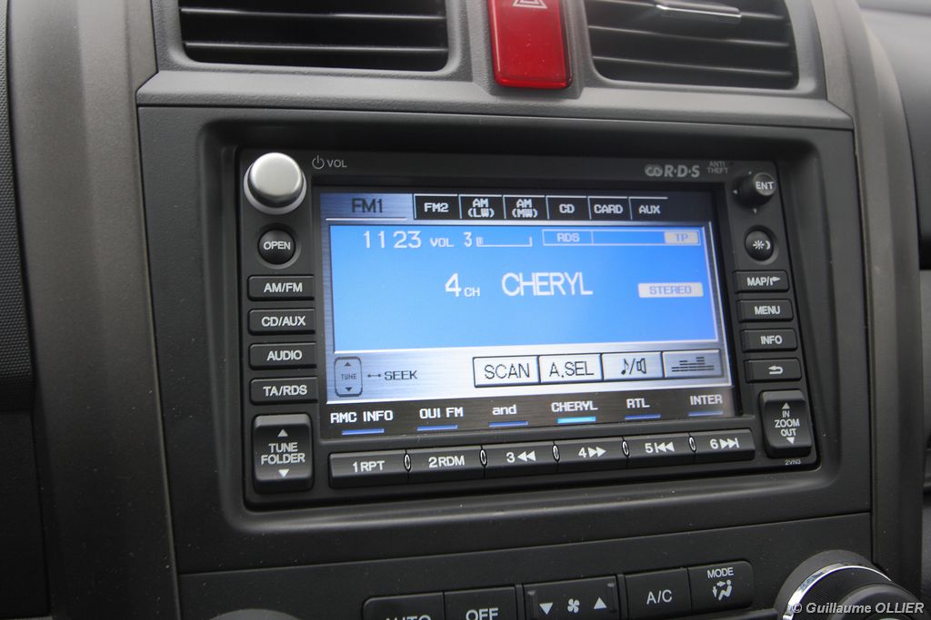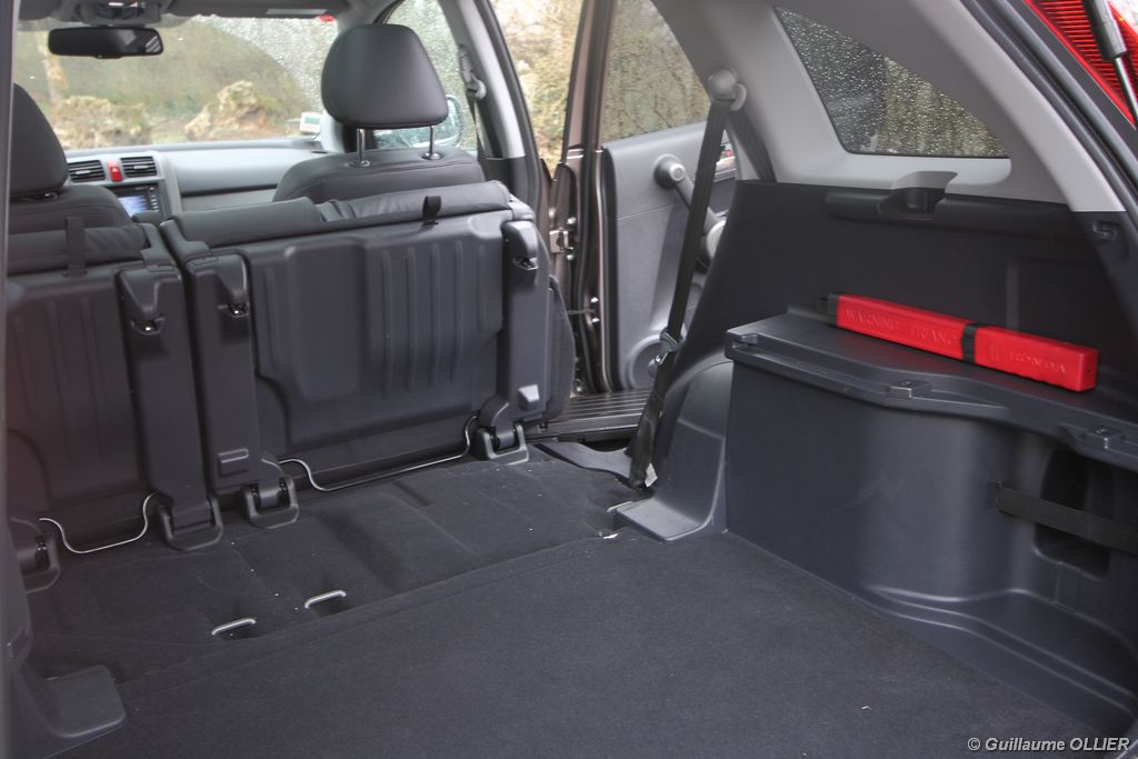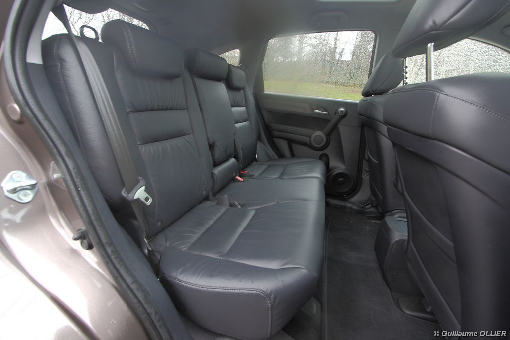 Le coffre offre un très bon volume de chargement avec 442 dm3, pouvant s’étendre jusqu’à 955 dm3 une fois la banquette arrière rabattue, cette opération étant plutôt facile à réaliser. L’équipement a aussi été peaufiné avec l’ajout d’un système de surveillance des pressions des pneumatiques, d’un régulateur de vitesse adaptatif (non présent sur notre modèle), d’un système audio muni d’un port USB compatible iPod, et du kit main libre Bluetooth, dont l’utilisation n’est pas des plus simples, du moins pour jumeler un téléphone. A cela s’ajoute une climatisation bizone, une sellerie cuir, et une caméra de recul qui s’avère très pratique ! Le CR-V reçoit également un double toit en verre qui apporte de la lumière dans l’habitacle, mais malheureusement non ouvrable. L’ergonomie est bien étudiée, avec des commandes au volant, et un écran de navigation tactile. Le GPS, malgré qu’il soit complet n’est point récent, et il faudra se contenter d’un affichage de carte en 2D. Au final, ce SUV reprend plusieurs gènes d’un monospace, avec une habitabilité et une modularité plus que correctes.