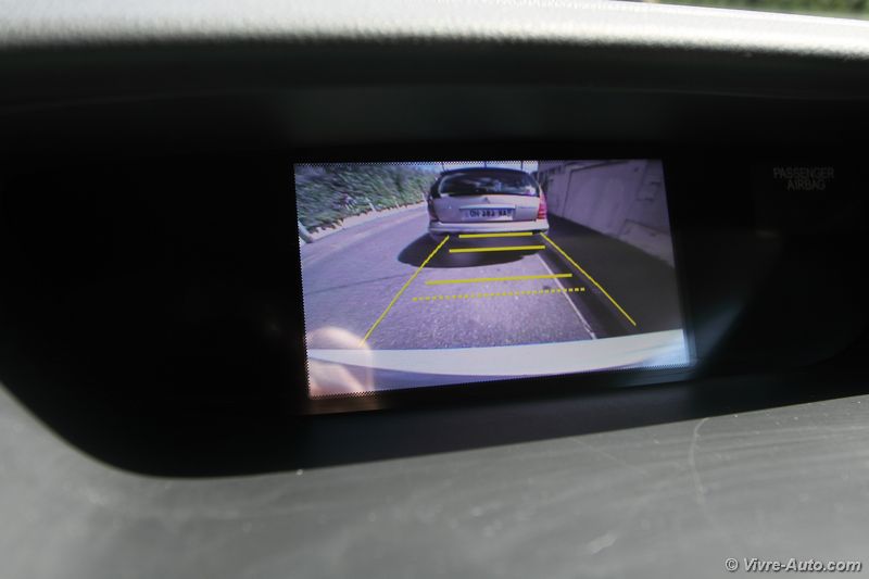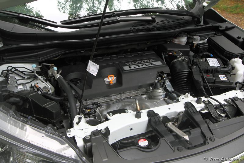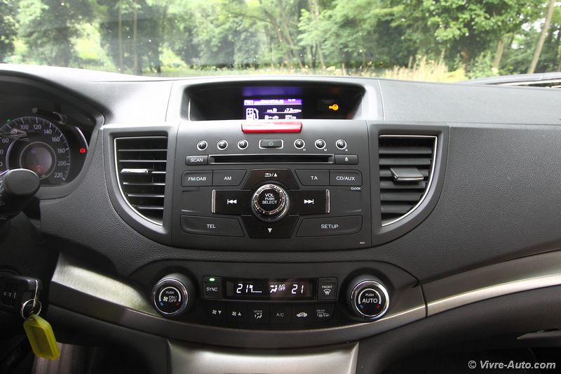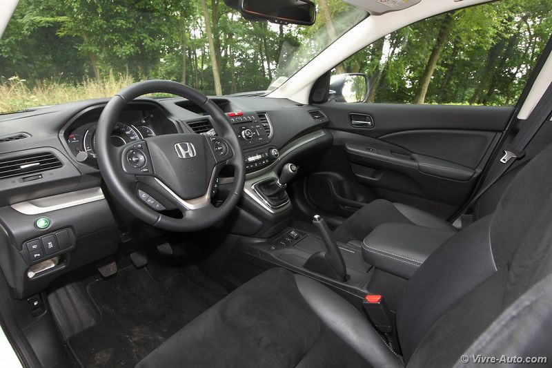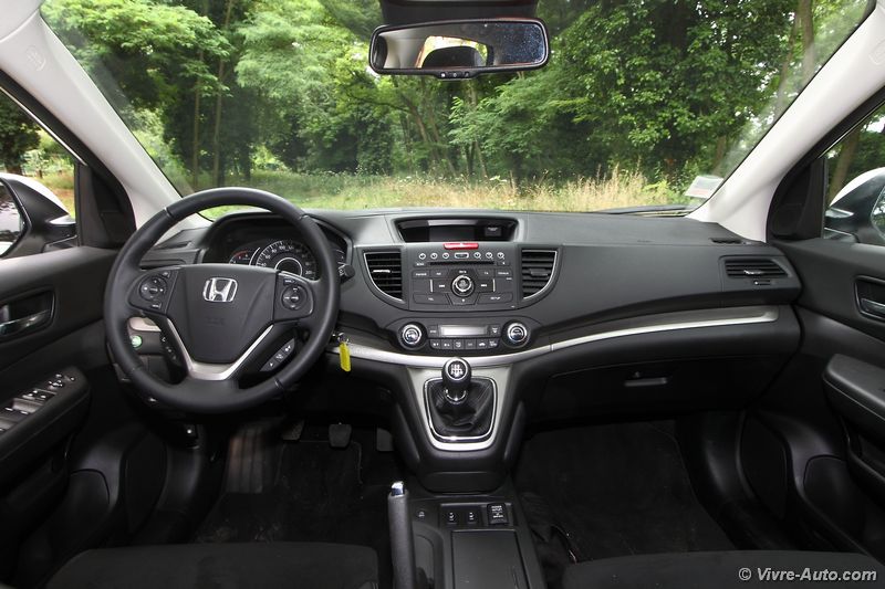 Une fois la porte ouverte on retrouve un intérieur typé Honda, peut-être un peu trop triste pour certains, mais on sent que l’ensemble est sérieux. La qualité des matériaux est bonne tout comme les assemblages. Les différents réglages du siège permettent au conducteur de trouver sa position de conduite idéale. On note juste un léger manque de maintien latéral. Les différentes commandes tombent aisément sous la main et l’ergonomie ne pose aucun problème. Seul regret, pour les versions sans GPS seul un petit écran situé au dessus de la planche de bord affiche les informations de l’ordinateur de bord et la caméra de recul. Pour les autres versions on s’y retrouve également sans problème dans les commandes du système multimédia mais ce dernier est tout de même dépassé.
