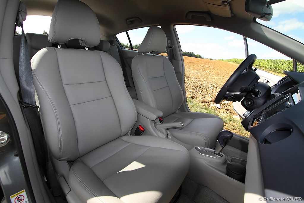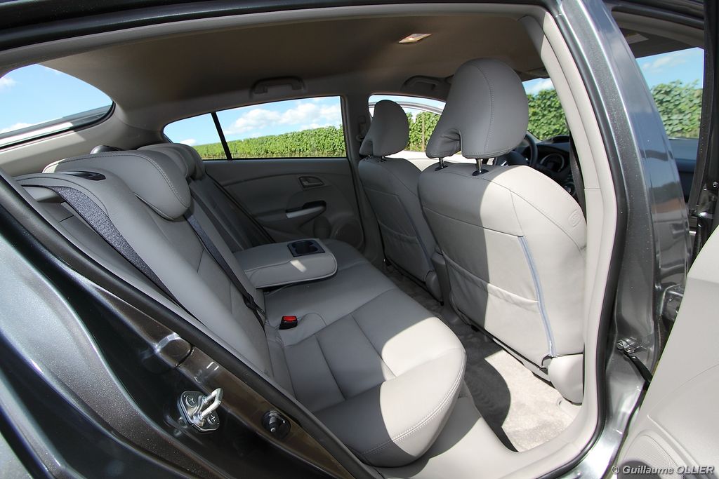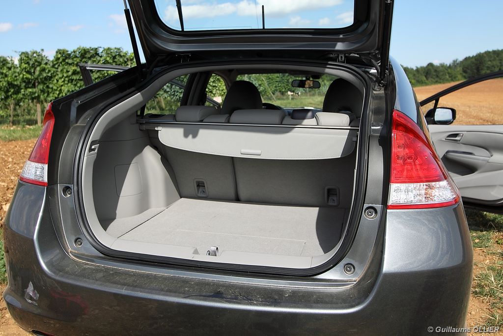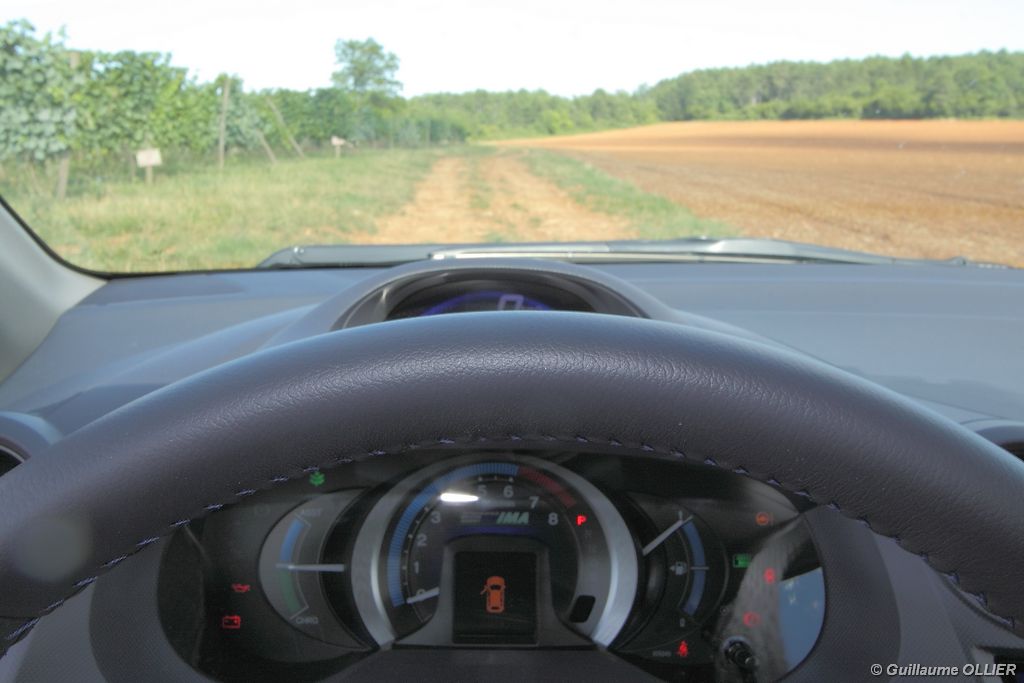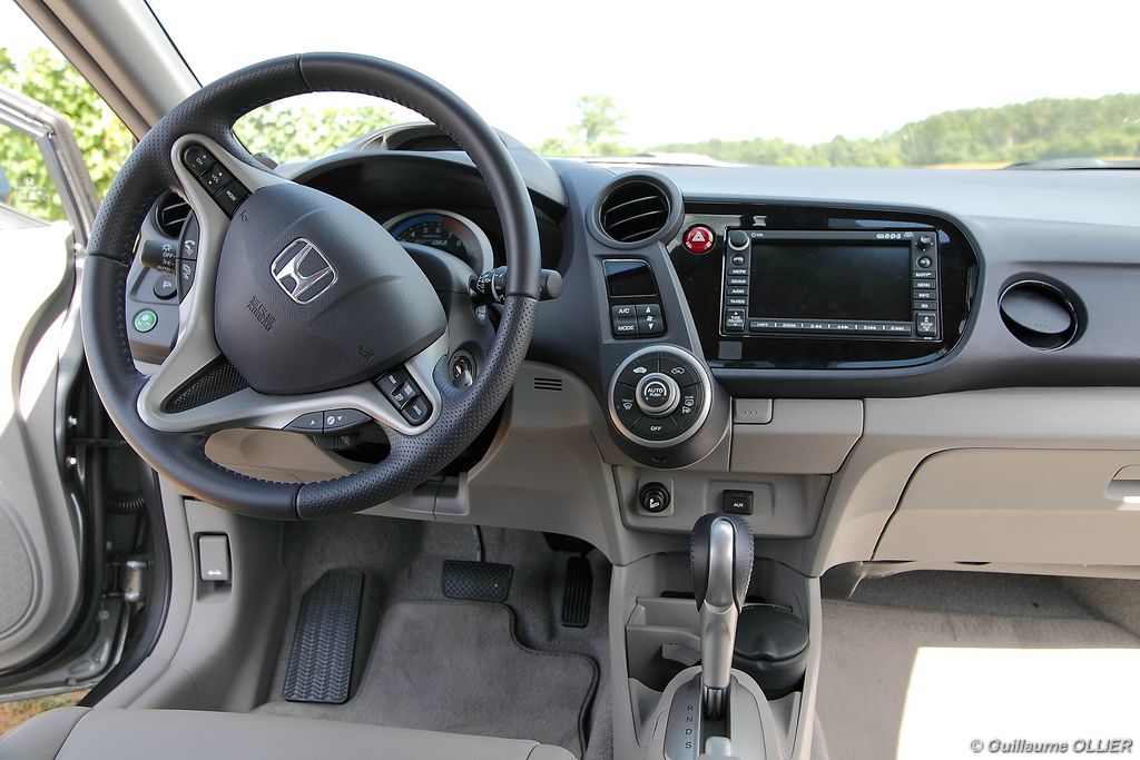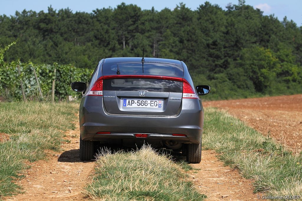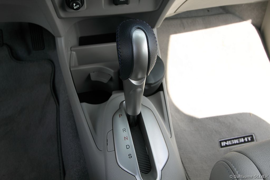 de prédilection pour autant. Lorsque le régulateur de vitesse est enclenché, la voiture perd au moins 6 km/h lors d’une montée, cassant ainsi votre vitesse de croisière. La transmission automatique qui est un vrai régal en ville, peut se montrer parfois agaçante sur route ou en conduite un peu plus soutenue, car elle ne passe pas le rapport supérieur, et fait ainsi hurler le moteur. Heureusement les palettes au volant et le mode séquentiel permettent de corriger le tir. Sur le plan de la consommation, nous avons obtenu des résultats assez satisfaisants. Par exemple lors d’un trajet sur route comprenant des embouteillages, la consommation moyenne était de 5,6l/100 km. Sur autoroute 6l/100km et en conduite dynamique 7l/100 km. En ville l’ordinateur de bord indiquait entre 5.0l et 5.5l/100 km. La climatisation était activée tout au long de notre essai. Le bilan est donc plutôt favorable en comparaison des autres berlines essence. L’Insight tient le cap, freine plutôt bien et le confort est de mise, la direction manque en revanche un peu de précision notamment en son point milieu. Quand à la visibilité arrière, elle est gênée par la partie séparant les deux vitres du hayon.