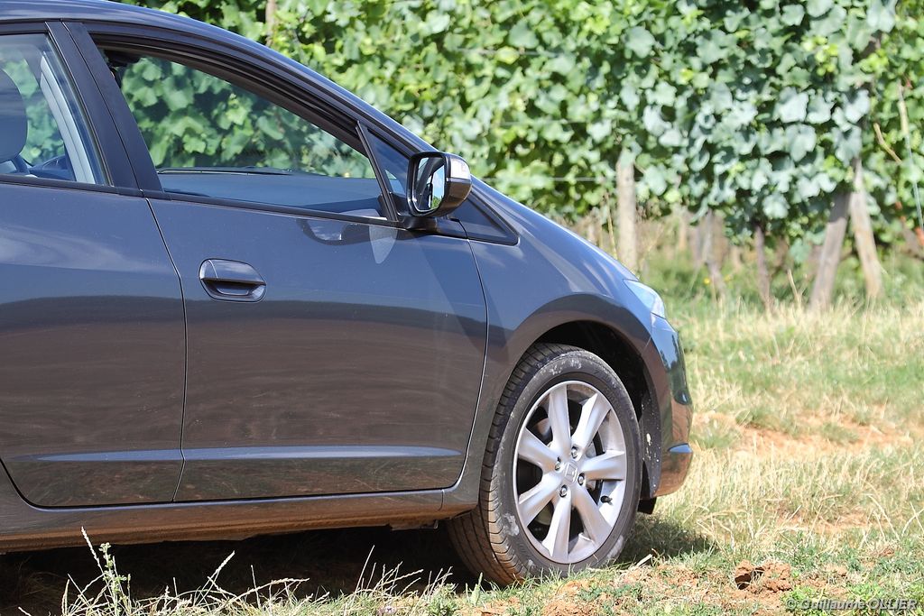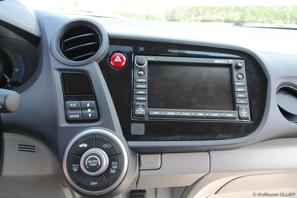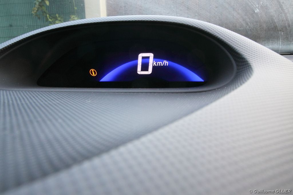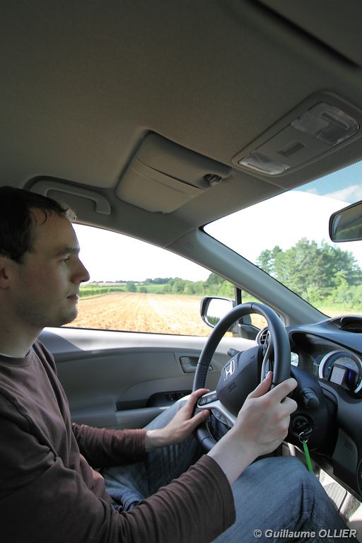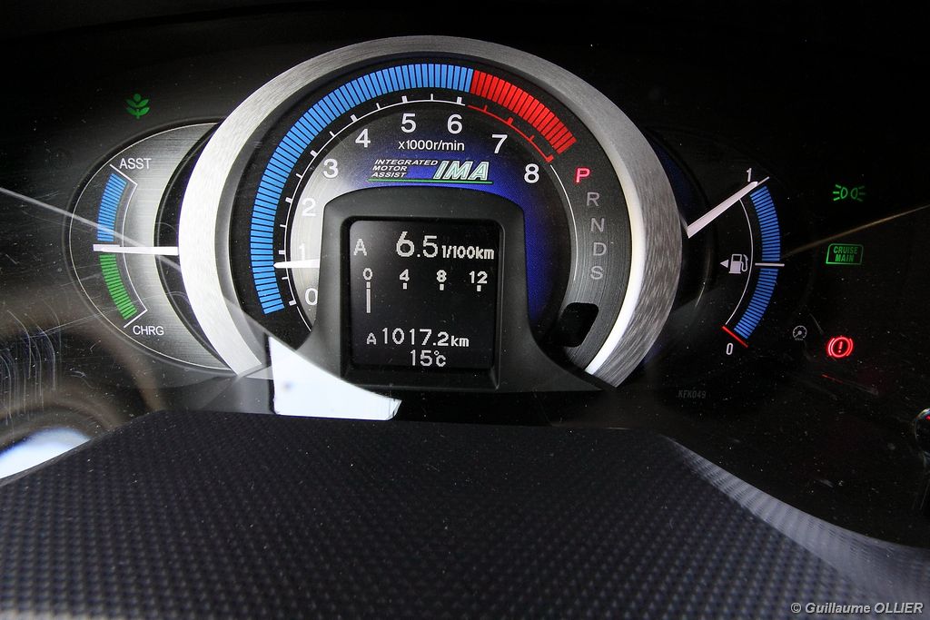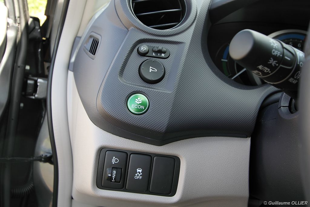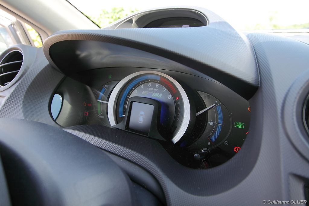 Contact enclenché, tout de suite l’envie de rouler paisiblement nous prend ! Le confort à bord, et la boîte automatique CVT 7 rapports favorisent cet état d’esprit. Les rapports s’enchaînent sans le moindre à-coup et le moteur est silencieux. Parlons donc du fonctionnement de cette Honda Insight. Le moteur thermique essence d’une cylindrée de 1.339 cm3 et d‘une puissance de 88 ch est assisté par un moteur électrique offrant 14 ch supplémentaires. Celui-ci se met en marche dans les conditions suivantes : démarrage, trajet à vitesse stabilisée lente, accélération. Il se recharge en récupérant un maximum d’énergie emmagasinée durant la phase de décélération du véhicule. Un système « auto-stop » arrête le moteur lors d’un arrêt, pour ensuite le relancer rapidement au démarrage. Le conducteur est encouragé à adopter une éco-conduite tout au long de ses trajets par des indications au tableau de bord. Tout d’abord le tachymètre se pare d’une couleur verte lors d’accélération modérée, de vitesse stabilisée optimale ou lors d’un freinage progressif. Pour le reste la couleur vire au bleue. Un mode baptisé « Econ » ajuste la climatisation, étend la durée de fonctionnement de l’Auto-Stop et augmente la régénération en phase de décélération lorsque vous l’activez via un bouton vert à gauche du volant. Mais ce n’est pas tout, le système analyse votre conduite. Une fleur présente sur l’ordinateur de bord grandit plus vous conduisez de manière maîtrisée. A la fin de chaque trajet, vous totalisez un score qui s’ajoute à votre performance cumulée. En ville l’Insight se montre particulièrement agréable à conduire, le moteur convient parfaitement à l‘usage urbain. Nous avons cependant trouvé trop sensible le système « auto-stop, entraînant ainsi l’arrêt du moteur trop fréquemment, par exemple lors d’un « Cédez le passage ». Sur route la petite motorisation entraîne la japonaise sans trop de difficultés, mais ce n’est pas son terrain