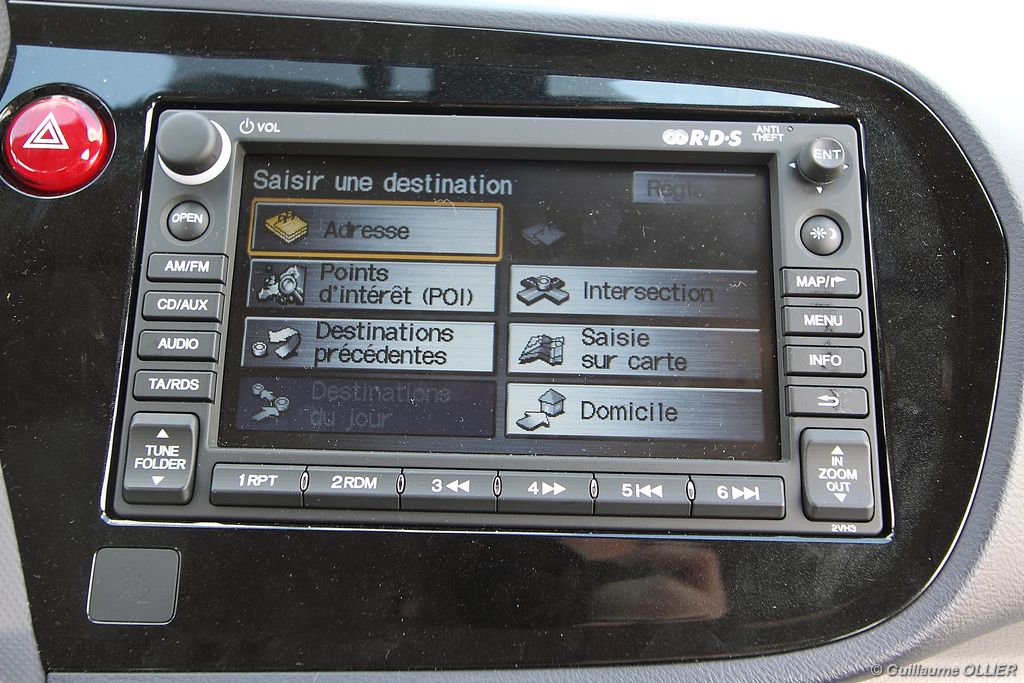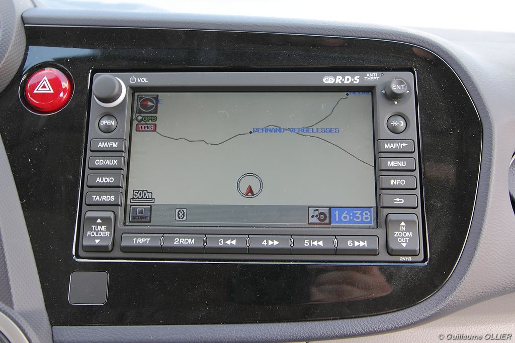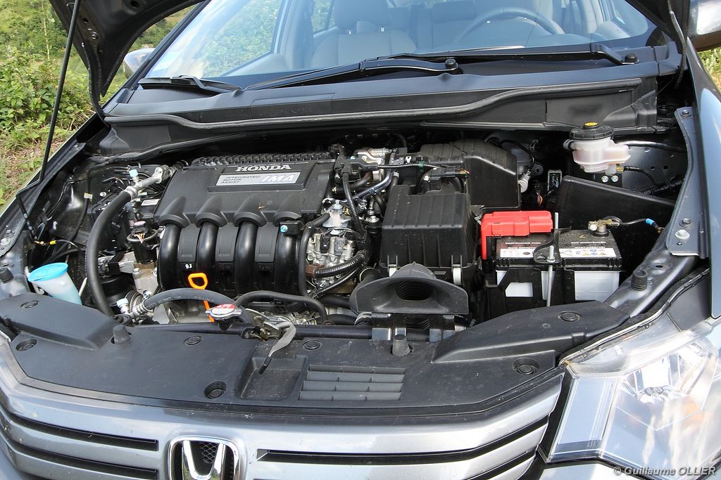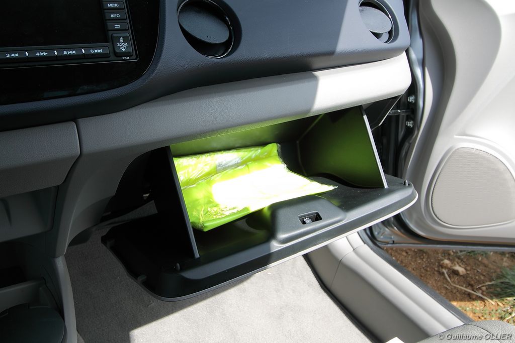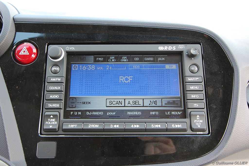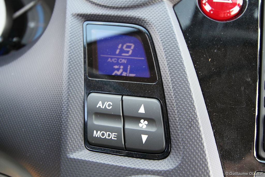 Contact enclenché, tout de suite l’envie de rouler paisiblement nous prend ! Le confort à bord, et la boîte automatique CVT 7 rapports favorisent cet état d’esprit. Les rapports s’enchaînent sans le moindre à-coup et le moteur est silencieux. Parlons donc du fonctionnement de cette Honda Insight. Le moteur thermique essence d’une cylindrée de 1.339 cm3 et d‘une puissance de 88 ch est assisté par un moteur électrique offrant 14 ch supplémentaires. Celui-ci se met en marche dans les conditions suivantes : démarrage, trajet à vitesse stabilisée lente, accélération. Il se recharge en récupérant un maximum d’énergie emmagasinée durant la phase de décélération du véhicule. Un système « auto-stop » arrête le moteur lors d’un arrêt, pour ensuite le relancer rapidement au démarrage. Le conducteur est encouragé à adopter une éco-conduite tout au long de ses trajets par des indications au tableau de bord. Tout d’abord le tachymètre se pare d’une couleur verte lors d’accélération modérée, de vitesse stabilisée optimale ou lors d’un freinage progressif. Pour le reste la couleur vire au bleue. Un mode baptisé « Econ » ajuste la climatisation, étend la durée de fonctionnement de l’Auto-Stop et augmente la régénération en phase de décélération lorsque vous l’activez via un bouton vert à gauche du volant. Mais ce n’est pas tout, le système analyse votre conduite. Une fleur présente sur l’ordinateur de bord grandit plus vous conduisez de manière maîtrisée. A la fin de chaque trajet, vous totalisez un score qui s’ajoute à votre performance cumulée. En ville l’Insight se montre particulièrement agréable à conduire, le moteur convient parfaitement à l‘usage urbain. Nous avons cependant trouvé trop sensible le système « auto-stop, entraînant ainsi l’arrêt du moteur trop fréquemment, par exemple lors d’un « Cédez le passage ». Sur route la petite motorisation entraîne la japonaise sans trop de difficultés, mais ce n’est pas son terrain