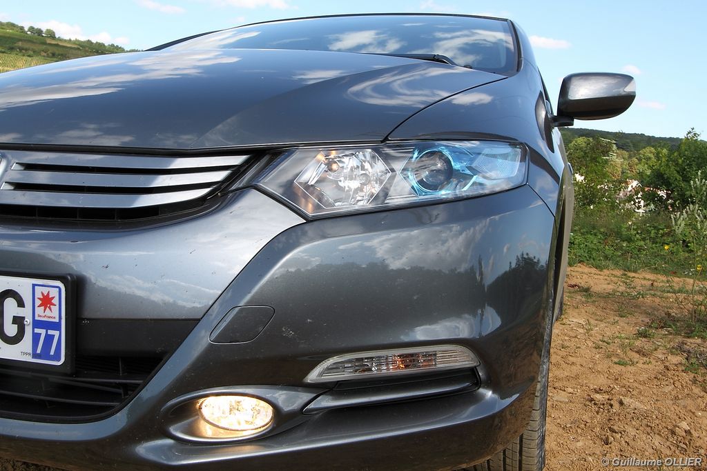 Avec son style dynamique et un design original, l’Insight a pour but de se démarquer des autres berlines sur le marché. L’extérieur est repris en partie de la FCX Clarity, la voiture « zéro émission ». Ici il n’est pas question d’une voiture 100% électrique puisqu’un logo « Hybrid » figure sur le coffre. Ses lignes fluides mettent en avant un aérodynamisme poussé. A l’avant la grille de calandre a été conçue pour maximiser les flux d’air, et souligne d’un point de vue stylistique les optiques avant. Ces dernières adoptent un effet bleuté. La ligne de toit est plongeante sur l’arrière, et le hayon forme un angle droit. Les feux arrière sont triangulaires et intègrent des LED. A noter que les portes n’ont pas de protection latérale. Enfin, notre version est dotée de jantes 16 pouces en alliage. Si le trois quart arrière ne nous a pas séduits au premier coup d’œil, nous avons apprécié la partie avant très dynamique.
