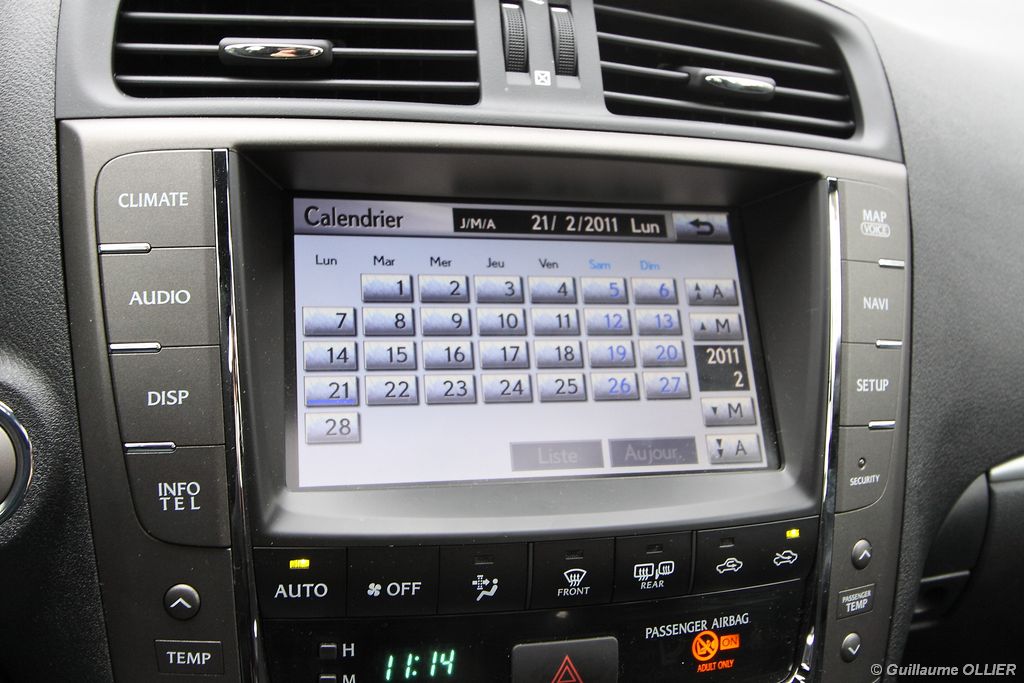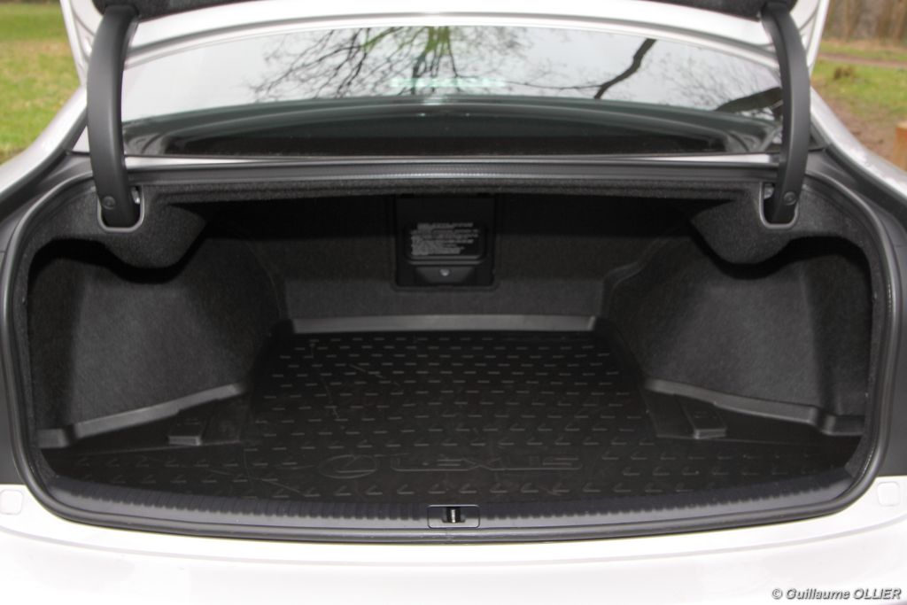 vivre-auto-lexus-is-200d-essai-18Lorsque l’on monte à bord on constate tout de suite que l’habitacle est luxueux. La finition est sérieuse et les assemblages ne souffrent d’aucun reproche. Quelques plastiques ne font pas haut de gamme mais globalement la qualité perçue est de rigueur. La planche de bord est belle et la finition F-Sport ajoute des inserts d’aluminium sur la console centrale, la boîte à gants et le volant. Le pédalier est également en aluminium. Les sièges avant sont confortables et offrent un très bon maintien latéral. La position de conduite est bonne, facilement réglable avec les 8 positions électriques des sièges qui vous permettent de trouver la configuration la plus adaptée. Petit détail, les liseuses sont à LED, et lorsque l’on s’approche de la voiture elles s’allument. L’ensemble des commandes et les fonctions profitent d’une bonne ergonomie. Le tableau de bord laisse place à une instrumentation lisible. Le système de navigation tactile dispose d’un grand écran, et il est facile à utiliser. Les informations véhicules sont disponibles, et l’on peut dire qu’il y en a énormément, surtout pour la partie de l’entretien où pas moins de quinze sous-menus sont accessibles. Un calendrier est même utilisable ! A l’arrière l’espace alloué aux occupants est correct, la garde au toit est cependant un peu juste, et la partie centrale de la banquette arrière est gênée par le tunnel de transmission. Coffre rangements, la Lexus IS propose plusieurs espaces à l’avant comme à l’arrière. Le coffre offre un volume de chargement de 379 litres, ce qui n’est pas énorme pour la catégorie. Pour les vacances, mieux vaut ne pas être nombreux.