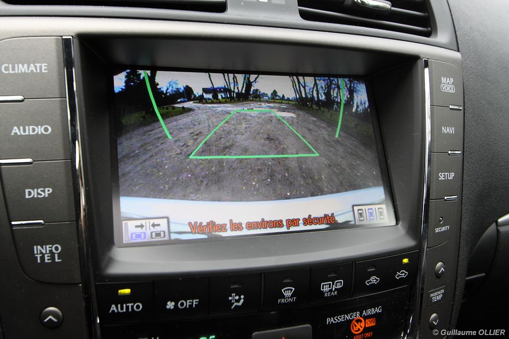 vivre-auto-lexus-is-200d-essai-03L’IS 200d est toujours équipée du quatre cylindres 2,2 litres turbo diesel à rampe commune d’injection et filtre à particules, mais la puissance bascule de 177 ch à 150 ch et le couple de 400 Nm à 340 Nm. Une fois les premiers tours de roue passés on constate que le moteur se montre plutôt bruyant, et quelques vibrations se ressentent notamment au niveau du levier de vitesses. Avant d’essayer la voiture nous nous doutions qu’avec cette descente en puissance, les performances seraient en retrait, mais nous avons été encore plus surpris ! Le moteur est creux et la plage d’utilisation très réduite, c’est entre 2 000 et 3 000 tr/mn que le moteur se montre le plus vivant, ni en dessous ni au dessus… Il faut alors jouer du levier de vitesse, avec une boîte aux rapports longs. A 90 km/h par exemple, le sixième rapport est limite trop juste. Heureusement le levier de vitesse nous a paru très agréable à manier et il tombe aisément sous la main. Il est clair que Lexus a plus optimisé les consommations de son quatre cylindres au détriment de performances très allégées. Au chapitre consommation, nous nous attendions également à mieux. En mixte les moyennes retenues lors de notre essai tournaient autour des 8l/100 km. Le comportement routier est en revanche de qualité. Avec une grande stabilité en ligne droite et une allure posée en courbe, le plaisir de conduite est au rendez-vous. La voiture est peu sensible au roulis, et le conducteur est bien calé dans son siège. La suspension avant à double triangulation et la suspension arrière multi-bras garantissent une conduite dynamique, mais au profit du confort qui se montre plutôt ferme. Très maniable, la Lexus IS bénéficie d’une direction précise. En ville, on regrette le manque de visibilité à l’arrière.
