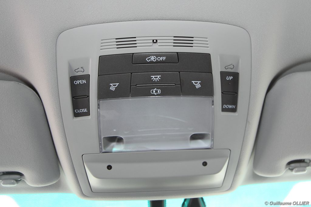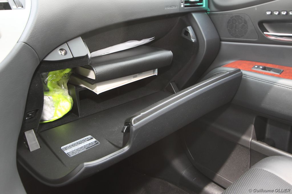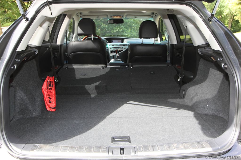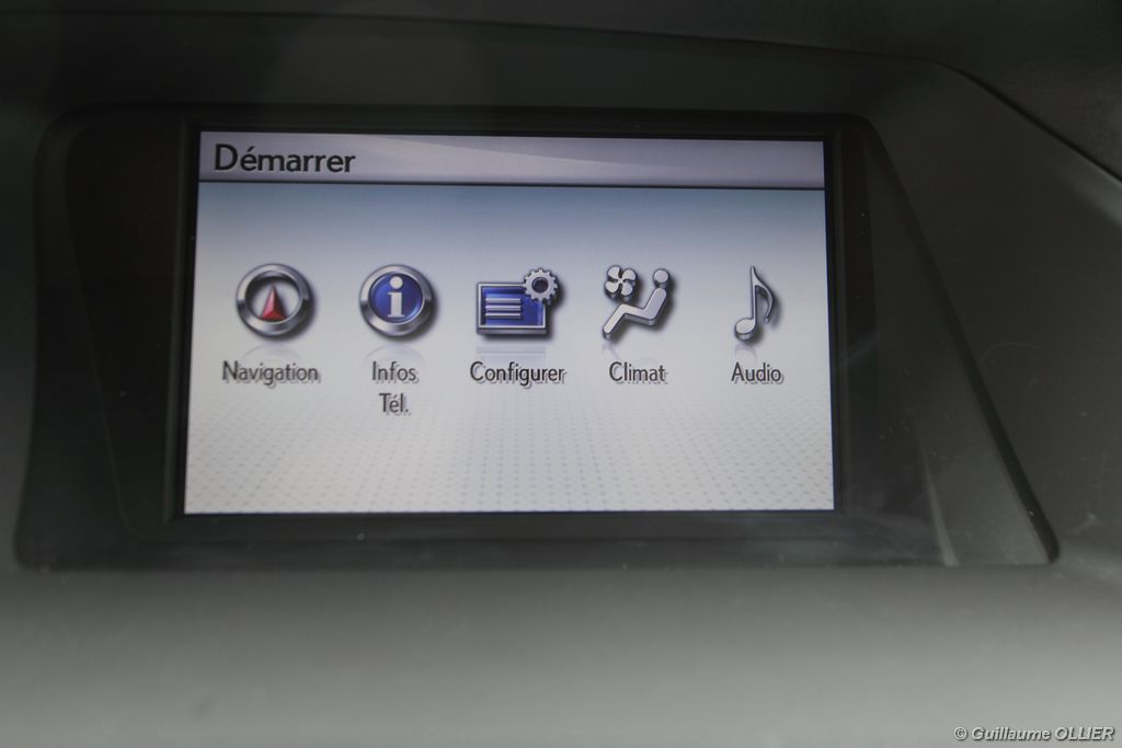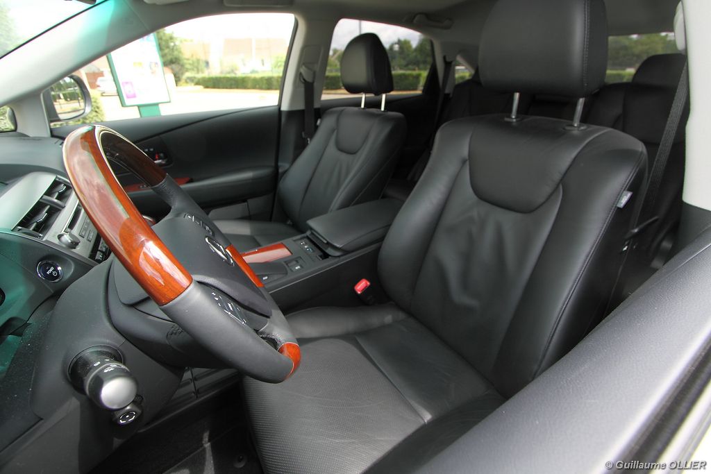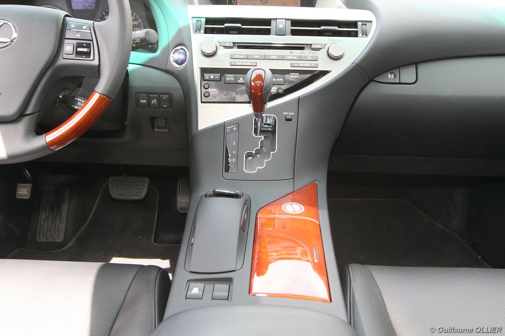Sobre et harmonieux, l’habitacle du RX 450h nous rappelle tout de suite que nous sommes à bord d’une Lexus. Même si certains plastiques dénotent encore, l’ensemble est plutôt bien fini. L’instrumentation et les informations sont lisibles sur fond de rétro éclairage bleuté. Un affichage tête haute permet de rester