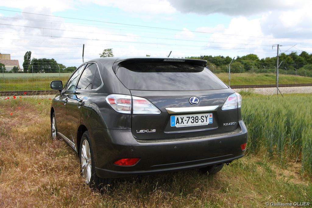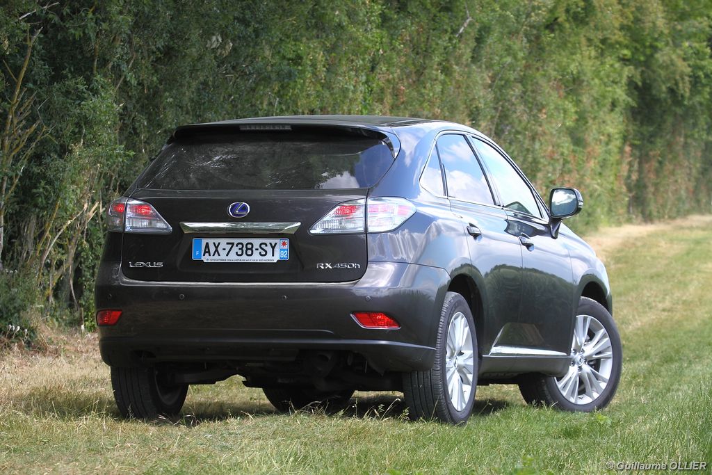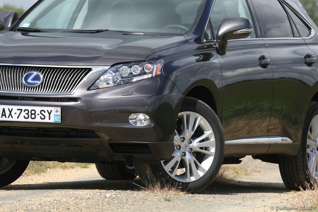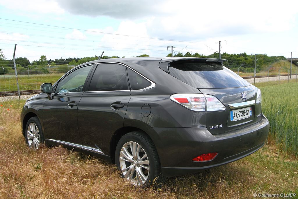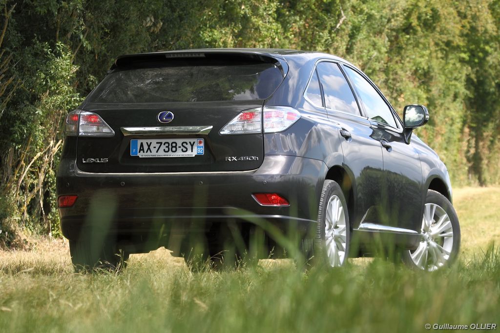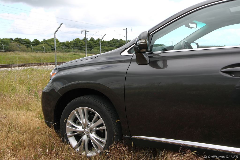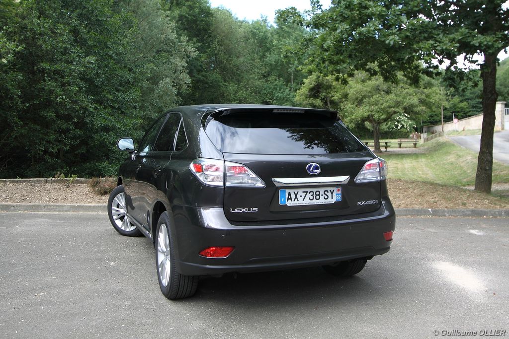 agglomération, notre moyenne établie était de 7l/100 km ! Nous avons même réussi à faire baisser cette donnée à 6,5 l/100 km. Sur route nous avons réalisé des moyennes de 7,5 l/100 km en empruntant des nationales, et des autoroutes. En somme quelque soit l’usage, le rapport consommation/poids/puissance bat des records ! Ainsi, avec un réservoir de 65 litres, vous obtenez une autonomie de prés de 900 km. L’amortissement typé ferme permet de contrôler le roulis et préserve la précision mais se montre également assez souple pour conserver un amortissement optimal. A noter qu’une suspension pneumatique à commande électronique est disponible en option. Le RX 450h peut ainsi parcourir des kilomètres sans que les passagers se plaignent du confort. Le comportement routier n’est pas si mauvais pour ce lourd SUV. L’ESP se montre efficace et va même jusqu’à arrêter le véhicule en cas de gros sous virage. Le freinage est endurant et ça freine court. En option deux équipements de sécurité sont proposées, un régulateur adaptatif (ACC), et un système d’assistance au freinage pré-collision qui utilise les freins avant un impact et rétracte les ceintures (PCS). Malgré son gabarit, le SUV nippon se manœuvre facilement. En plus de la caméra de recul, une caméra latérale avant droite préserve les jantes 19 pouces, elle est activable depuis le volant. Un accessoire fort utile encore peu rependu.