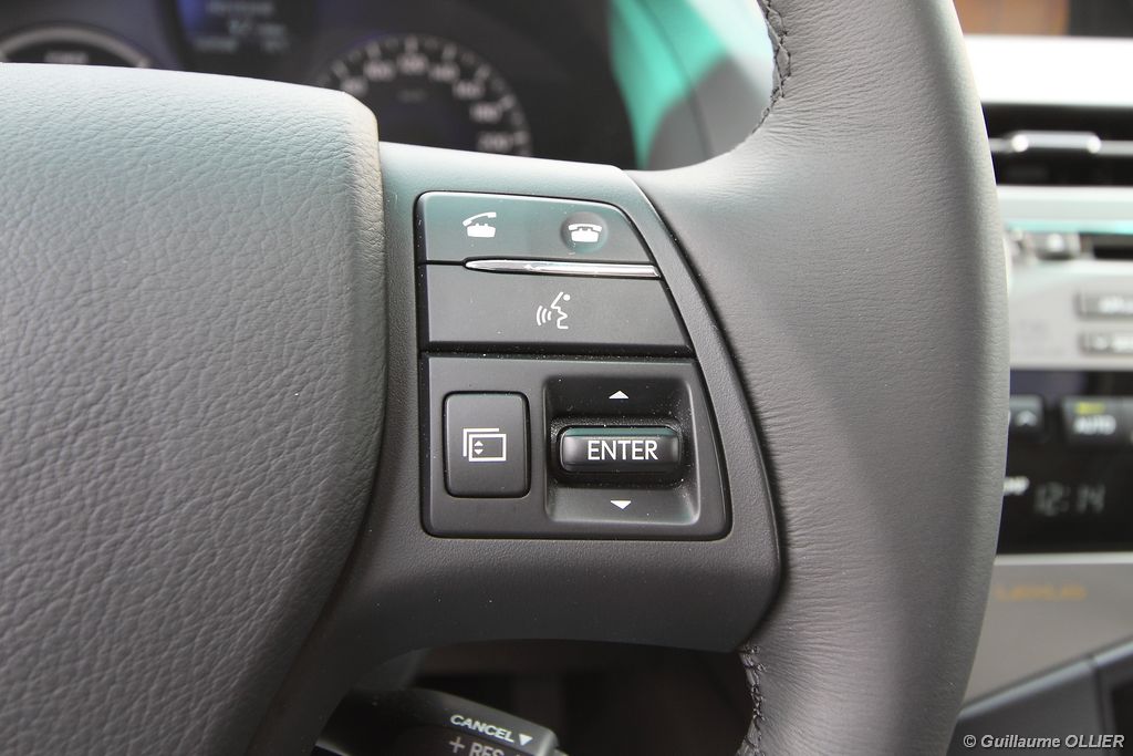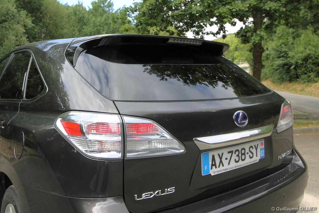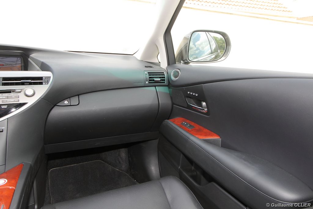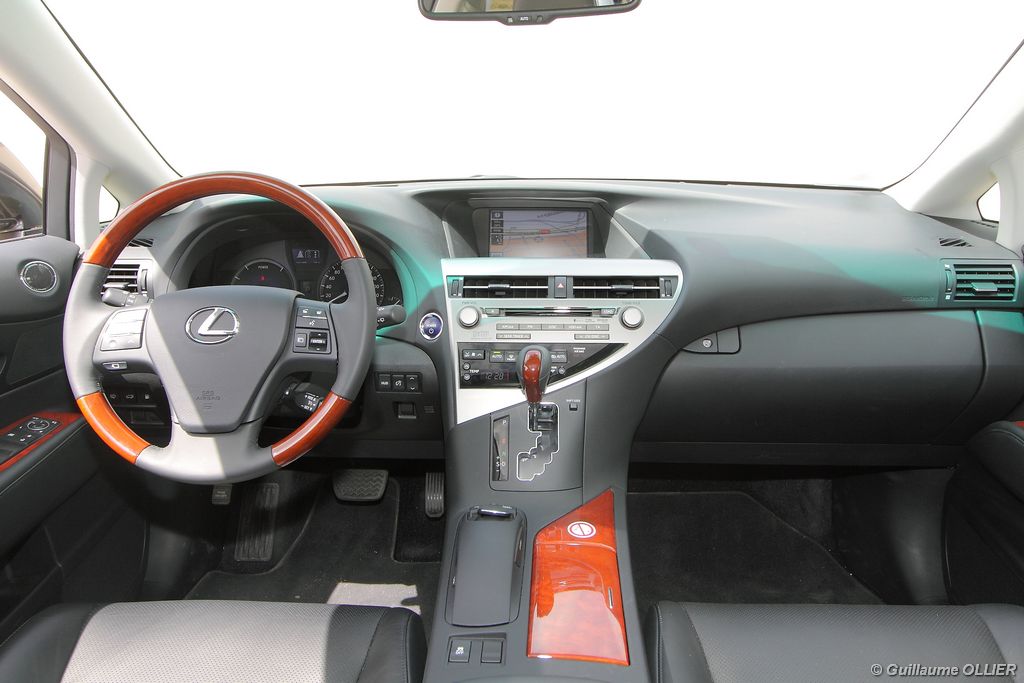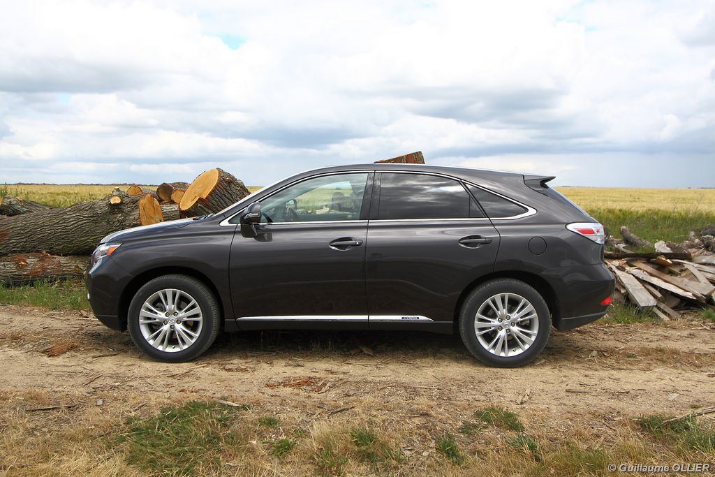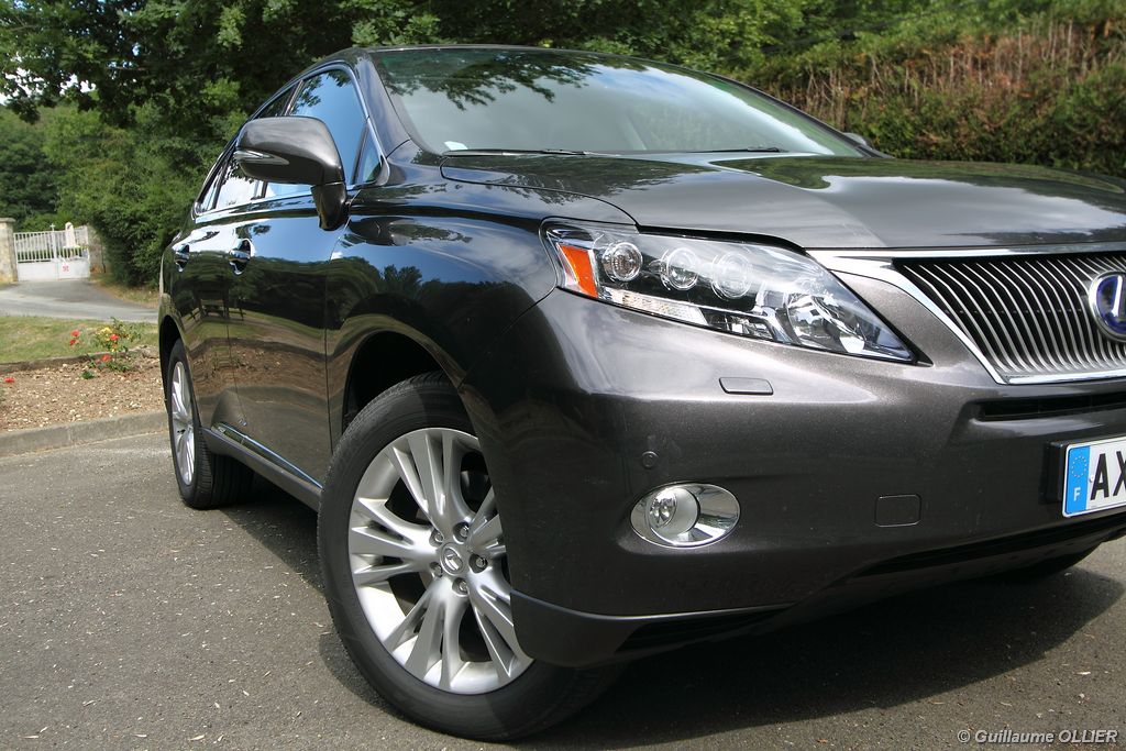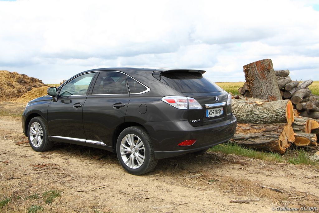 agglomération, notre moyenne établie était de 7l/100 km ! Nous avons même réussi à faire baisser cette donnée à 6,5 l/100 km. Sur route nous avons réalisé des moyennes de 7,5 l/100 km en empruntant des nationales, et des autoroutes. En somme quelque soit l’usage, le rapport consommation/poids/puissance bat des records ! Ainsi, avec un réservoir de 65 litres, vous obtenez une autonomie de prés de 900 km. L’amortissement typé ferme permet de contrôler le roulis et préserve la précision mais se montre également assez souple pour conserver un amortissement optimal. A noter qu’une suspension pneumatique à commande électronique est disponible en option. Le RX 450h peut ainsi parcourir des kilomètres sans que les passagers se plaignent du confort. Le comportement routier n’est pas si mauvais pour ce lourd SUV. L’ESP se montre efficace et va même jusqu’à arrêter le véhicule en cas de gros sous virage. Le freinage est endurant et ça freine court. En option deux équipements de sécurité sont proposées, un régulateur adaptatif (ACC), et un système d’assistance au freinage pré-collision qui utilise les freins avant un impact et rétracte les ceintures (PCS). Malgré son gabarit, le SUV nippon se manœuvre facilement. En plus de la caméra de recul, une caméra latérale avant droite préserve les jantes 19 pouces, elle est activable depuis le volant. Un accessoire fort utile encore peu rependu.
