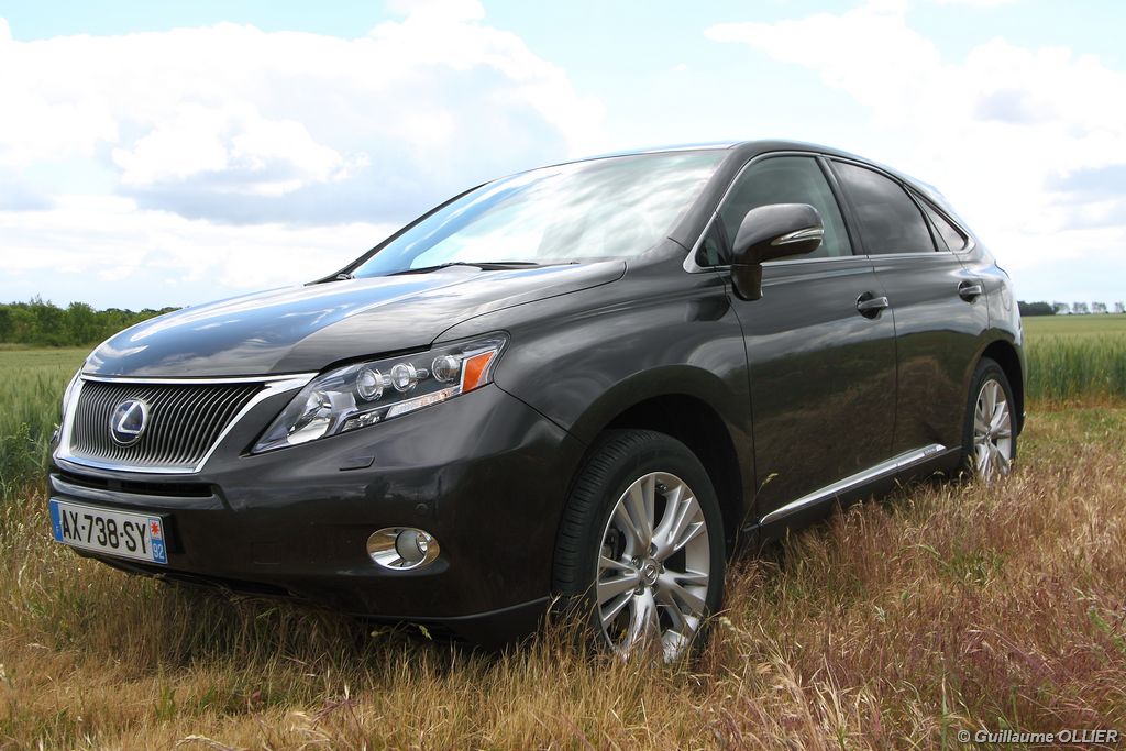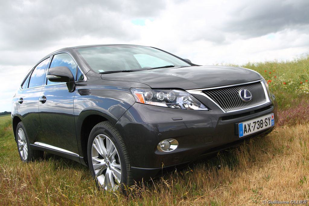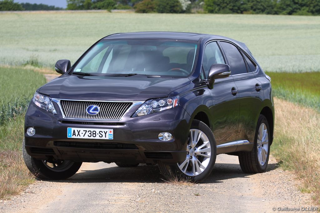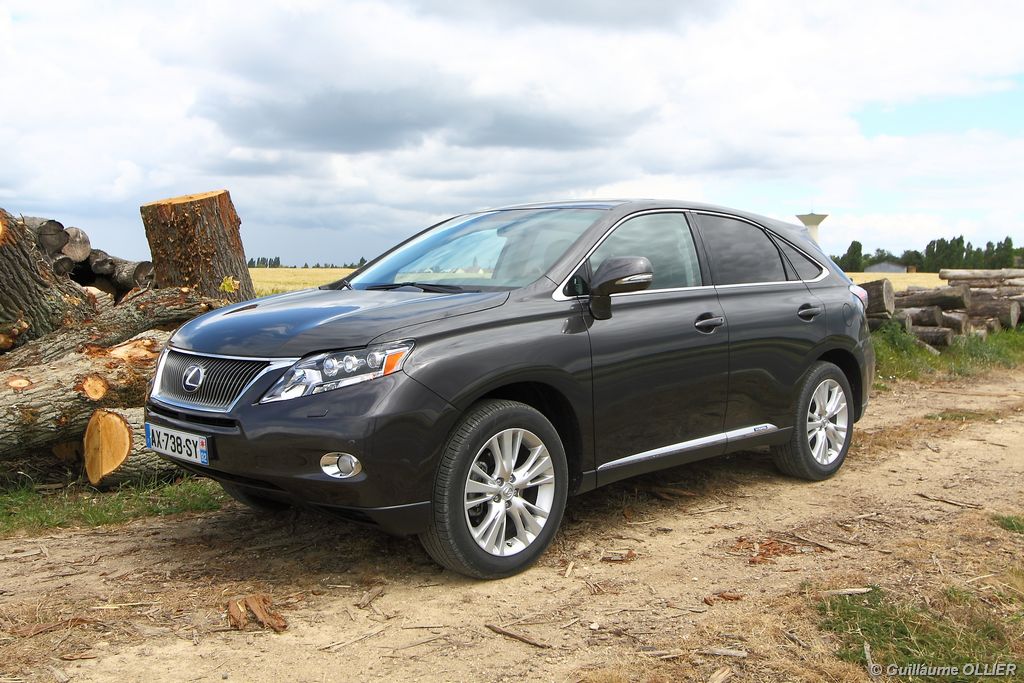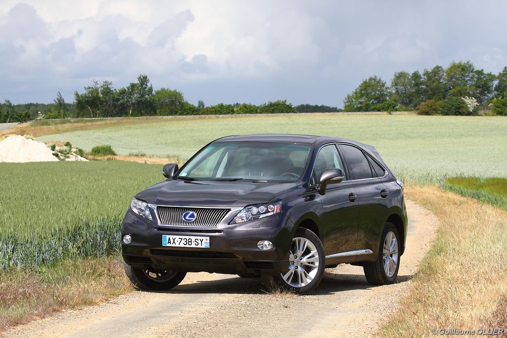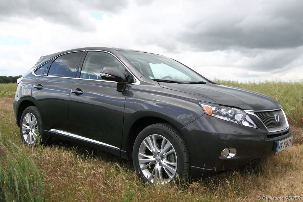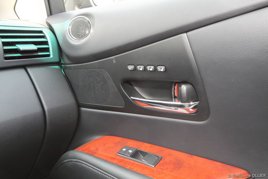 agglomération, notre moyenne établie était de 7l/100 km ! Nous avons même réussi à faire baisser cette donnée à 6,5 l/100 km. Sur route nous avons réalisé des moyennes de 7,5 l/100 km en empruntant des nationales, et des autoroutes. En somme quelque soit l’usage, le rapport consommation/poids/puissance bat des records ! Ainsi, avec un réservoir de 65 litres, vous obtenez une autonomie de prés de 900 km. L’amortissement typé ferme permet de contrôler le roulis et préserve la précision mais se montre également assez souple pour conserver un amortissement optimal. A noter qu’une suspension pneumatique à commande électronique est disponible en option. Le RX 450h peut ainsi parcourir des kilomètres sans que les passagers se plaignent du confort. Le comportement routier n’est pas si mauvais pour ce lourd SUV. L’ESP se montre efficace et va même jusqu’à arrêter le véhicule en cas de gros sous virage. Le freinage est endurant et ça freine court. En option deux équipements de sécurité sont proposées, un régulateur adaptatif (ACC), et un système d’assistance au freinage pré-collision qui utilise les freins avant un impact et rétracte les ceintures (PCS). Malgré son gabarit, le SUV nippon se manœuvre facilement. En plus de la caméra de recul, une caméra latérale avant droite préserve les jantes 19 pouces, elle est activable depuis le volant. Un accessoire fort utile encore peu rependu.