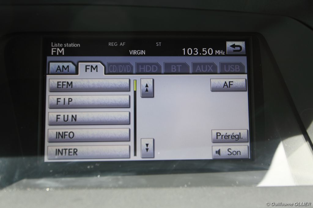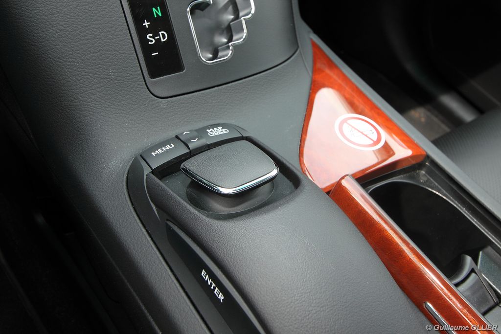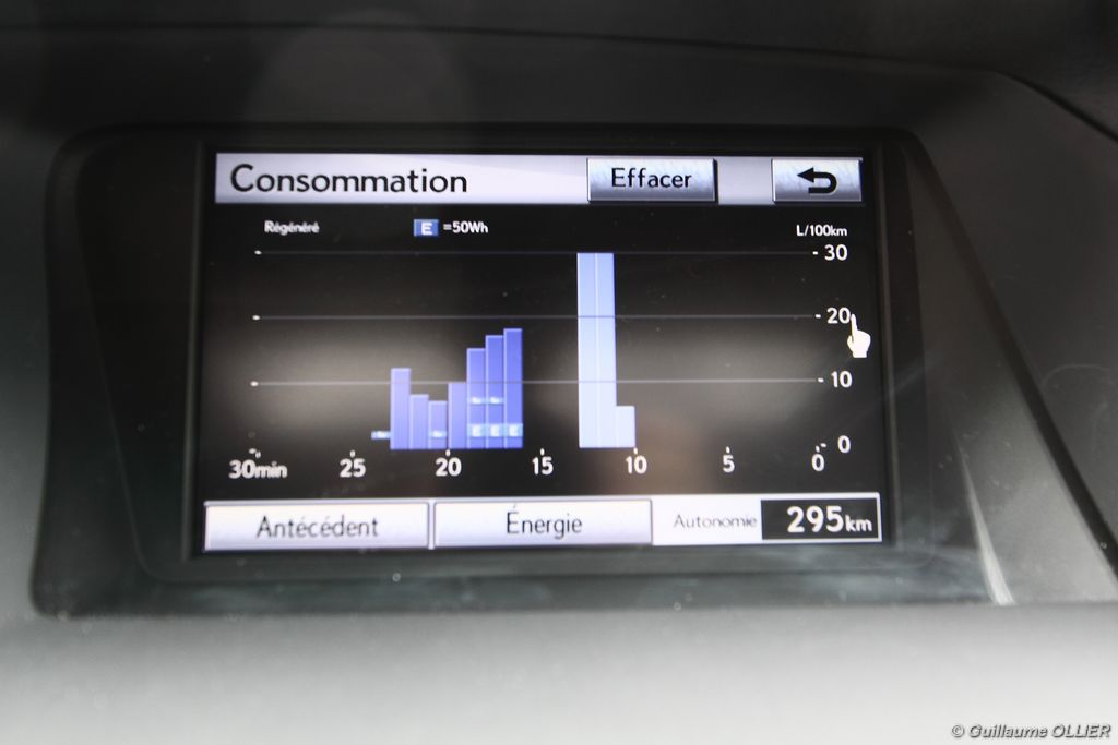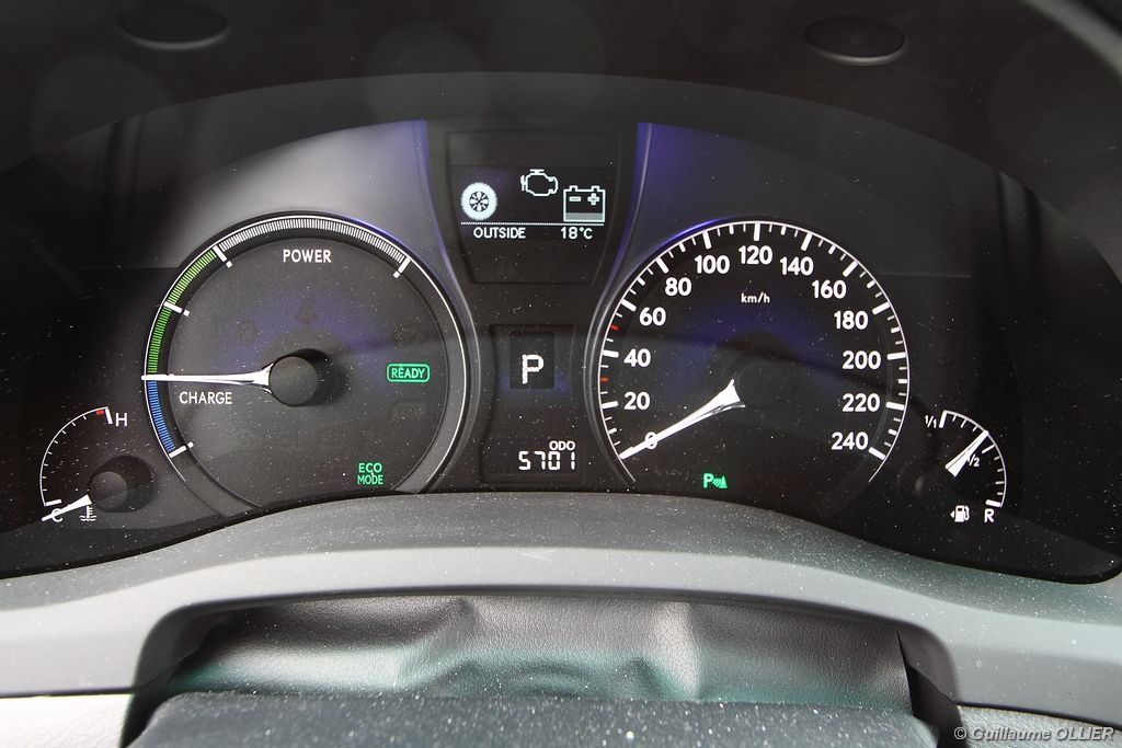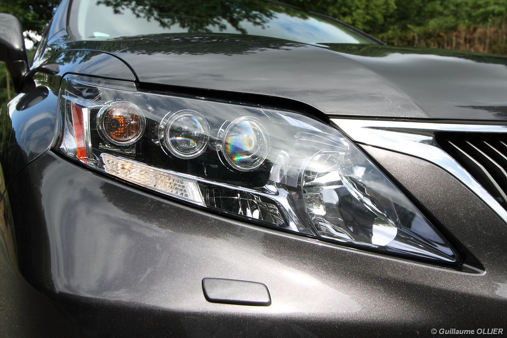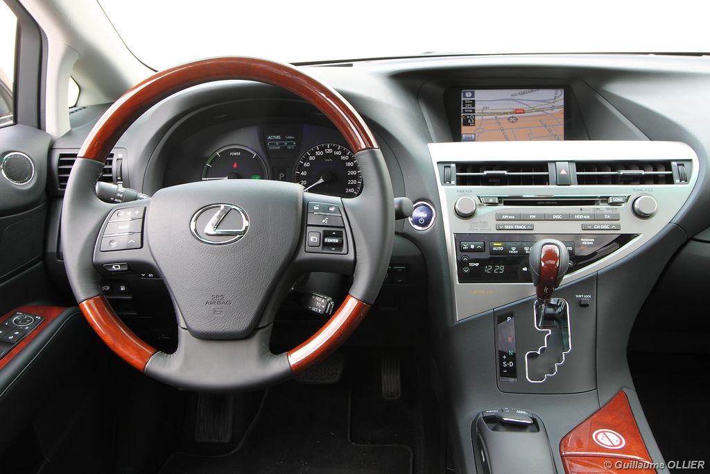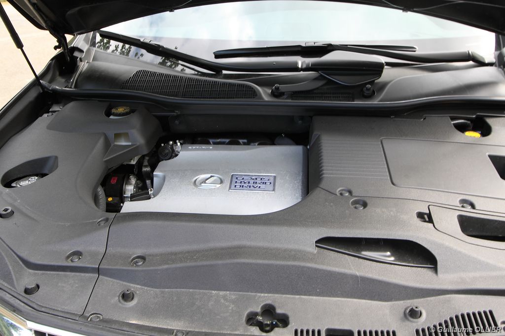 Sous le capot, on retrouve la deuxième génération du système Lexus Hybrid Drive. Deux moteurs électriques viennent compléter le V6 essence de 249 ch. Un à l’avant de 167 ch et un à l’arrière de 68 ch, ce dernier uniquement pour la version quatre roues motrices comme notre modèle. Ils fournissent de la puissance au moteur thermique lors des phases d’accélération, et ils se rechargent à l’aide du thermique et lors des décélérations. On obtient ainsi une puissance cumulée de 299 ch ! Au volant, les accélérations et reprises sont franches, et le tout agrémenté par une bonne sonorité. Les performances parlent d’elles mêmes, avec un 0 à 100 km/h abbatu en 7,8 secondes. En ville, on peut rouler jusqu’à 40 km/h en mode tout électrique sur une distance d’environ 3 km. Ceci permet de ne pas rejeter de CO2 mais aussi d’apprécier le silence de fonctionnement. Attention toutefois aux piétons. Le passage de l’électrique au thermique se fait sans s’en rendre compte. Le moteur est associé à une boîte de vitesse automatique à variation continue à six rapports. A la place d’un compte-tours classique, le RX 450h dispose d’un compteur qui vous informe sur le fonctionnement du système hybride. Il est partagé en trois zones, bleue lorsque la batterie se recharge, verte pendant une conduite « éco », et blanche lors des phases d’accélérations importantes. De plus un schéma entre les compteurs vous indique en temps réel le fonctionnement. Le conducteur peut aussi activer trois modes de conduites : « ECO », qui réajuste la commande du papillon du moteur et la climatisation, afin de réduire la consommation et les émissions. « EV », ce mode utilise uniquement les deux moteurs électriques, et « SNOW » permet au système hybride d’ajuster le couple aux quatre roues motrices sur route enneigée ou glissante par exemple. Le RX 450h, c’est seulement 148 g de rejet de CO2/ km ! Pour un SUV de 2,1 tonnes avec 299 ch sous le capot on ne peut que féliciter les ingénieurs. Nous avons ainsi parcouru plusieurs kilomètres en ville et en dehors pour vérifier les chiffres de consommations annoncées par le constructeur. Sur le papier, les moyennes sont les suivantes : 6,5l (urbaine), 6.0l (extra-urbaine), 6.3l (mixte). Après plusieurs kilomètres réalisés en