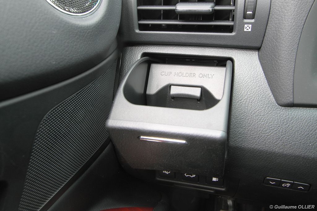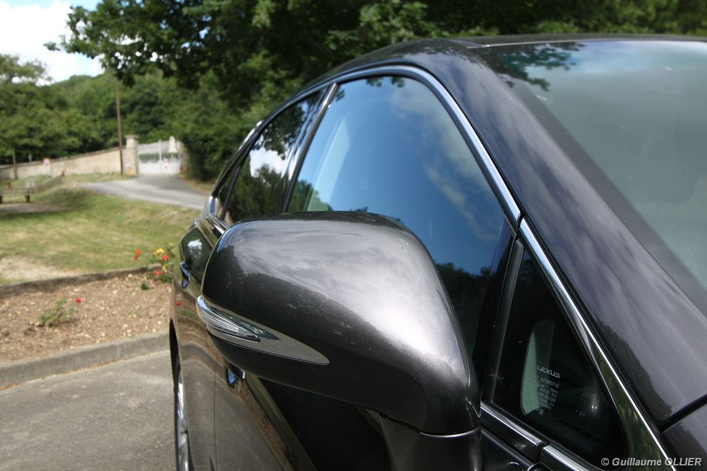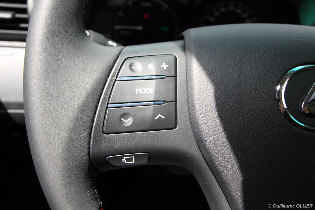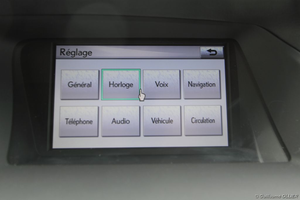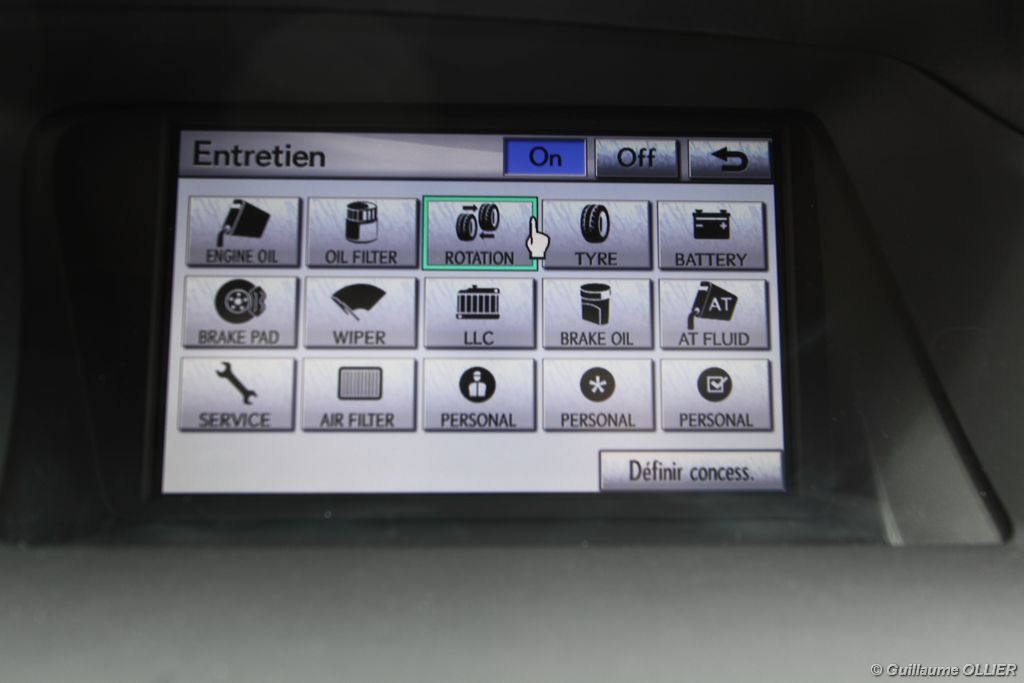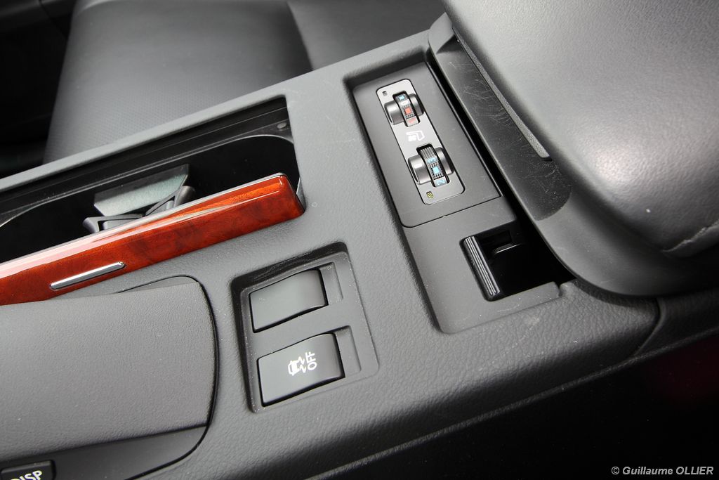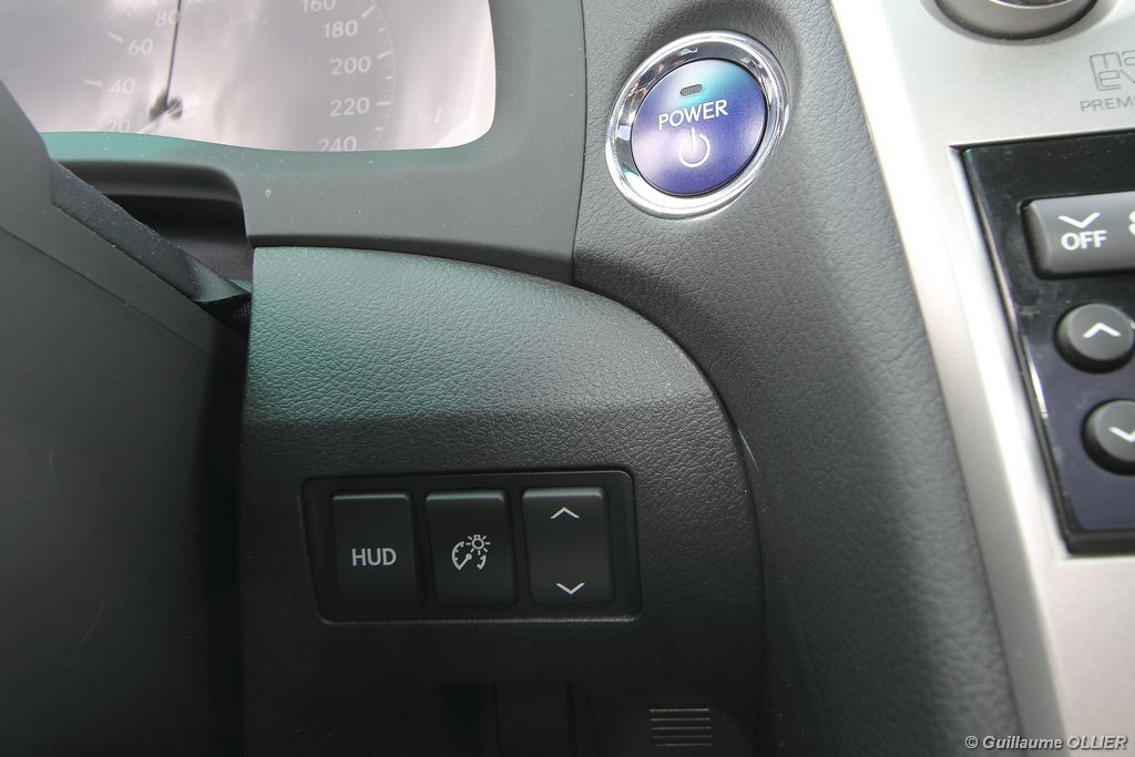 Sous le capot, on retrouve la deuxième génération du système Lexus Hybrid Drive. Deux moteurs électriques viennent compléter le V6 essence de 249 ch. Un à l’avant de 167 ch et un à l’arrière de 68 ch, ce dernier uniquement pour la version quatre roues motrices comme notre modèle. Ils fournissent de la puissance au moteur thermique lors des phases d’accélération, et ils se rechargent à l’aide du thermique et lors des décélérations. On obtient ainsi une puissance cumulée de 299 ch ! Au volant, les accélérations et reprises sont franches, et le tout agrémenté par une bonne sonorité. Les performances parlent d’elles mêmes, avec un 0 à 100 km/h abbatu en 7,8 secondes. En ville, on peut rouler jusqu’à 40 km/h en mode tout électrique sur une distance d’environ 3 km. Ceci permet de ne pas rejeter de CO2 mais aussi d’apprécier le silence de fonctionnement. Attention toutefois aux piétons. Le passage de l’électrique au thermique se fait sans s’en rendre compte. Le moteur est associé à une boîte de vitesse automatique à variation continue à six rapports. A la place d’un compte-tours classique, le RX 450h dispose d’un compteur qui vous informe sur le fonctionnement du système hybride. Il est partagé en trois zones, bleue lorsque la batterie se recharge, verte pendant une conduite « éco », et blanche lors des phases d’accélérations importantes. De plus un schéma entre les compteurs vous indique en temps réel le fonctionnement. Le conducteur peut aussi activer trois modes de conduites : « ECO », qui réajuste la commande du papillon du moteur et la climatisation, afin de réduire la consommation et les émissions. « EV », ce mode utilise uniquement les deux moteurs électriques, et « SNOW » permet au système hybride d’ajuster le couple aux quatre roues motrices sur route enneigée ou glissante par exemple. Le RX 450h, c’est seulement 148 g de rejet de CO2/ km ! Pour un SUV de 2,1 tonnes avec 299 ch sous le capot on ne peut que féliciter les ingénieurs. Nous avons ainsi parcouru plusieurs kilomètres en ville et en dehors pour vérifier les chiffres de consommations annoncées par le constructeur. Sur le papier, les moyennes sont les suivantes : 6,5l (urbaine), 6.0l (extra-urbaine), 6.3l (mixte). Après plusieurs kilomètres réalisés en
