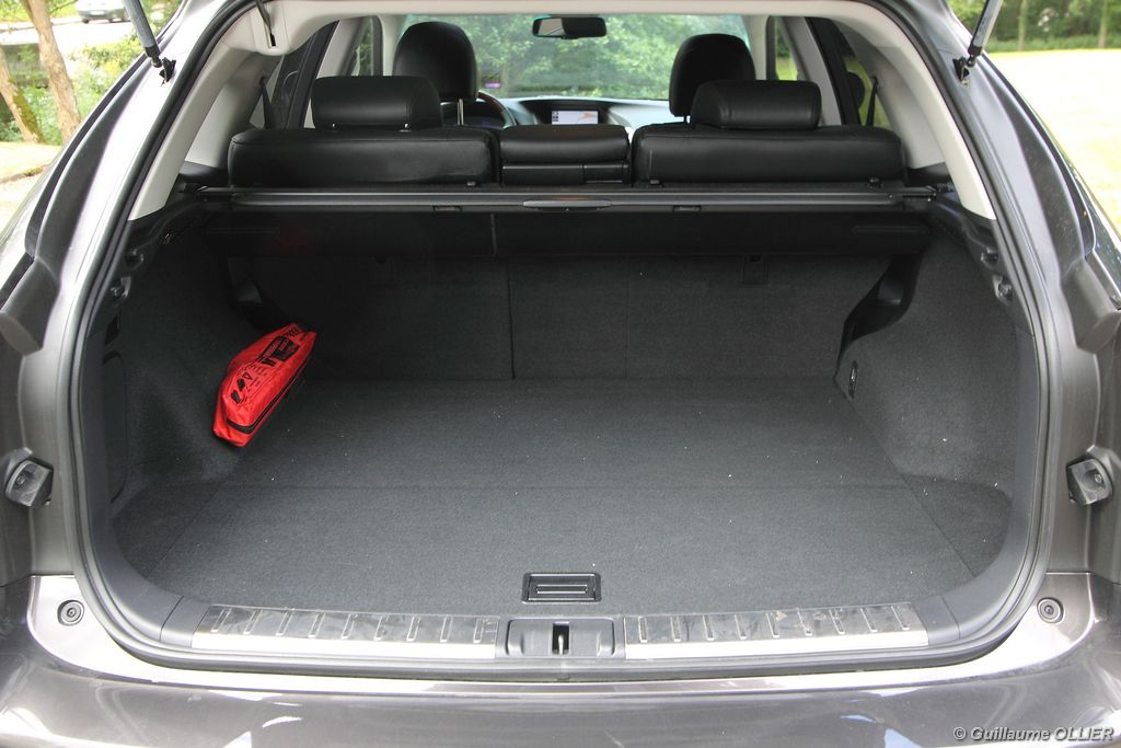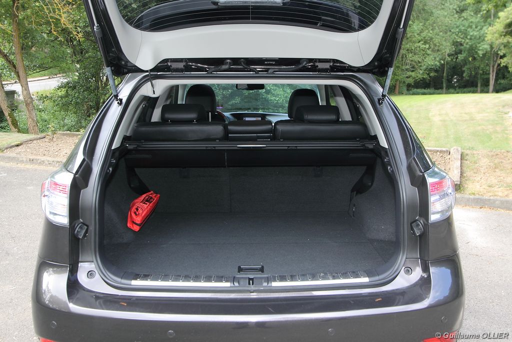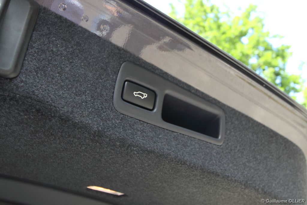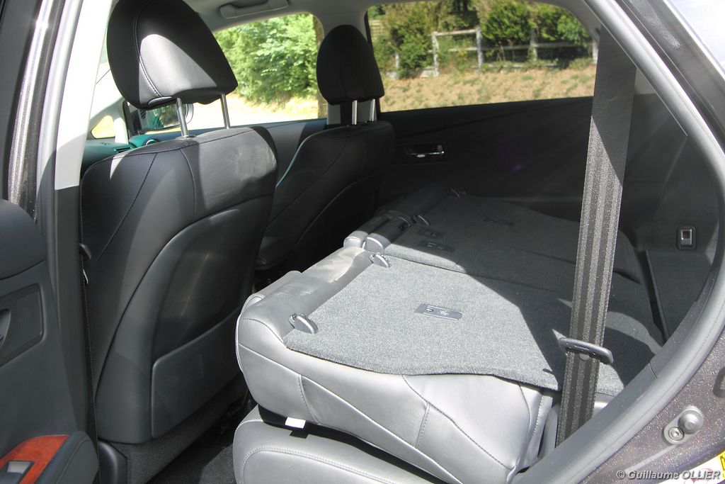 concentré sur la route puisqu’il indique la vitesse et les informations relatives au système audio. L’écran couleur LDC 8 pouces est complété par une commande multifonction « Remote Touch », autrement dit une sorte de joystick très ergonomique. Celle-ci vous permet de naviguer dans les différents menus et ainsi gérer la climatisation, la navigation, la téléphonie, la radio, un calendrier et même votre moyenne de consommation sous forme de graphique. Sans oublier les différents éléments d’entretien du véhicule, bref un ordinateur de bord plus que complet ! Le système Hi-fi Mark Levinson avec ses 15 hauts parleurs et son ampli de 100 watts nous a satisfaits, il dispose d’une prise USB compatible Ipod et il est doté d’un disque dur de 10 Go. Le GPS est assez intuitif, donc facile d’utilisation. Son graphisme est en revanche un peu dépassé. Globalement l’ergonomie est bonne et on apprécie la centralisation et le démarrage sans clé. Les passagers profitent d’un très bon niveau de confort à l’avant comme à l’arrière. Les multiples réglages de siège et de volant permettent de trouver une position de conduite idéale. Certains trouveront toutefois l’assise un peu trop haute. Les grands gabarits bénéficieront de l’aide à l’installation au poste de conduite, lorsque la porte est ouverte le volant et le siège conducteur électrique libèrent de la place. Les réglages peuvent être mémorisés jusqu’à trois combinaisons, même pour le passager ! Autre détail les sièges sont climatisés et chauffants. A l’arrière l’espace est de mise, les sièges coulissent longitudinalement et disposent de dossiers inclinables. La place du milieu est cependant étroite pour un adulte et le coffre n’accueille pas de siège supplémentaire comme le propose la concurrence. En dehors de ça, ce SUV est très confortable et soulignons que le cuir est d’excellente facture. Le coffre n’est pas pénalisé par l’emplacement des batteries puisqu’il offre un volume de chargement de 496 litres s’étendant jusqu’à 1 570 litres. La banquette se replie en trois parties, contrairement à la majorité des véhicules où seul deux éléments se replient. On gagne donc en modularité. Enfin, le hayon est électrique et peut s’actionner depuis le poste de conduite. Côté rangement, on retrouve de nombreux espaces accessibles au niveau des accoudoirs et sous la console centrale.