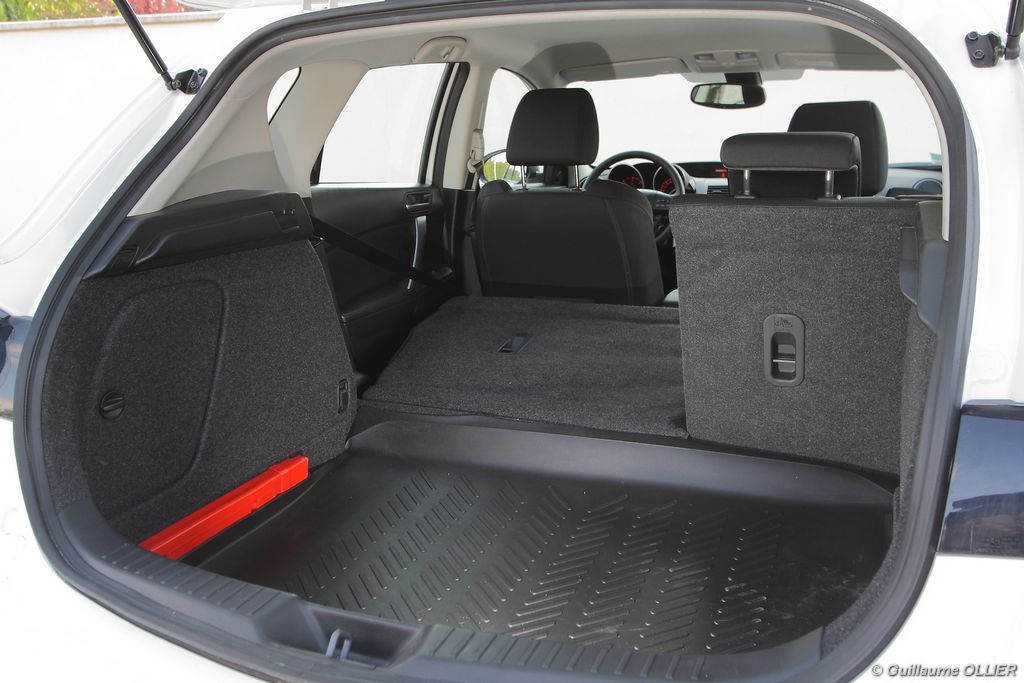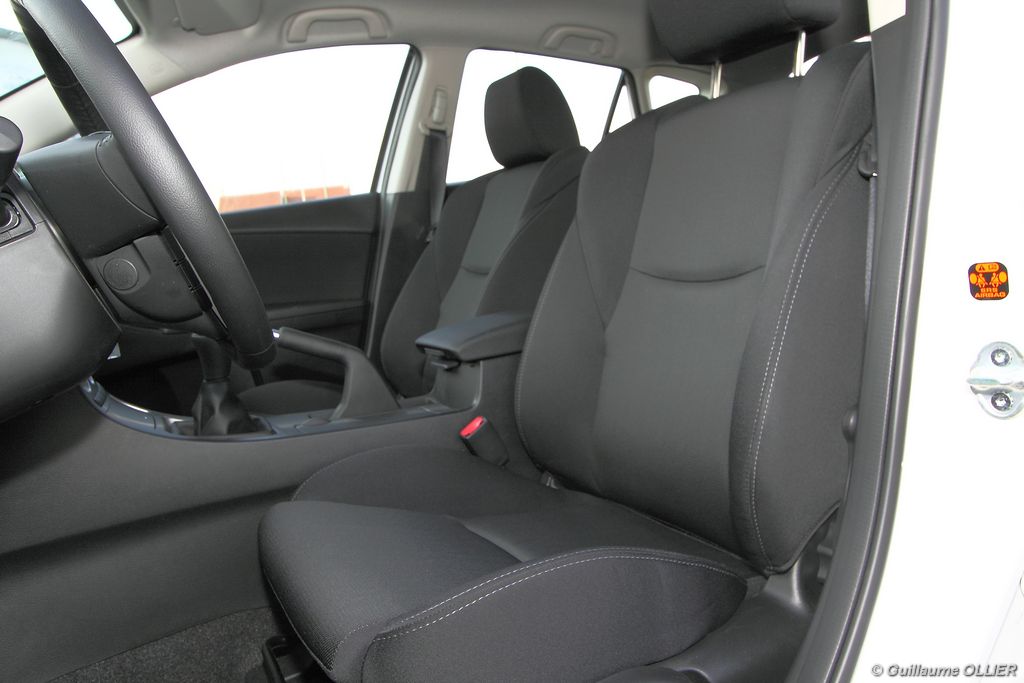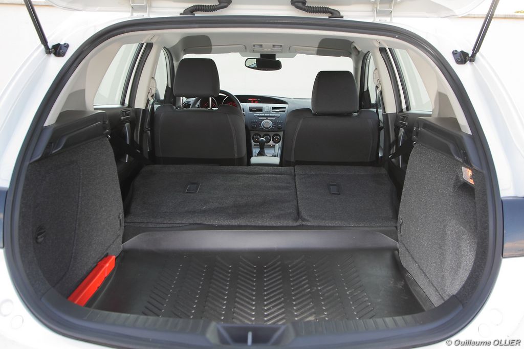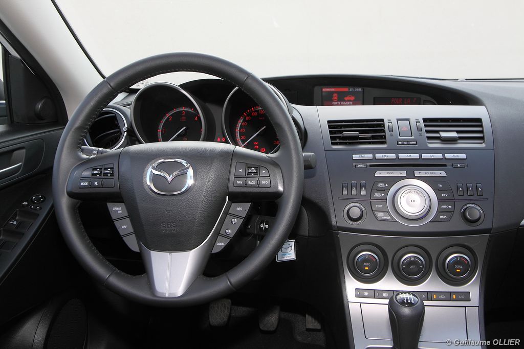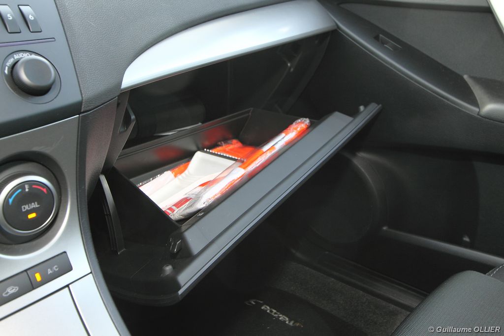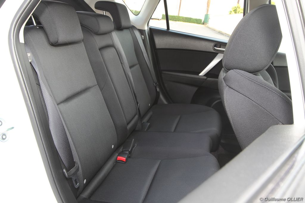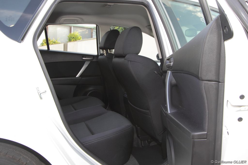 vivre-auto-mazda-3-mz-cd-115-essai-28L’habitacle de cette compacte est très soignée, mais les plastiques durs sont présents partout, à l’exception de la partie supérieure de la planche de bord. La qualité des matériaux n’est pas encore à la hauteur de certaines concurrentes. Hormis ce détail, l’intérieur reste convivial, et les inserts imitation chromé peaufinent l’ensemble avec élégance. L’assemblage ne souffre d’aucun reproche. A noter la présence d’un éclairage interactif, des lampes au niveau du plancher et d’autres intégrées dans les poignées, complètent l’éclairage habituel. Au niveau fonctionnalité, la 3 concentre tout sur son volant. En effet, pour commander l’autoradio, le GPS, l’ordinateur de bord, et le régulateur de vitesse, il faut jouer des molettes et autres boutons, ce qui s’avère plutôt pratique. Pour le reste, la planche de bord orientée vers le conducteur vient compléter l’ergonomie qui se montre bon dans l’ensemble. Le GPS couleur est très bien placé au sein de la planche de bord, il tombe sous les yeux et permet une concentration plus accrue. La voix est agréable, en revanche les 4,1 pouces de superficie sont discutables. Son fonctionnement reste simple, mais l’absence de plusieurs noms de rues nous a laissés perplexes quant à ses connaissances. Au chapitre vie à bord, les sièges avant, malgré qu’ils soient un peu durs, sont corrects et offrent un très bon maintien. L’accès aux places arrière nécessite une certaine souplesse. Autant l’ouverture des portières avant est très importante, autant à l’arrière il est difficile de rentrer. De plus, l’espace aux jambes des passagers n’est pas très spacieux, et nous avons l’impression d’être dans une citadine. La japonaise se rattrape avec son coffre, qui reste très généreux avec ses 340 litres. Très carré, il possède une hauteur de 0,808 mètre, ce qui permet le chargement de plusieurs bagages. La banquette arrière est rabattable en 1/3 2/3.