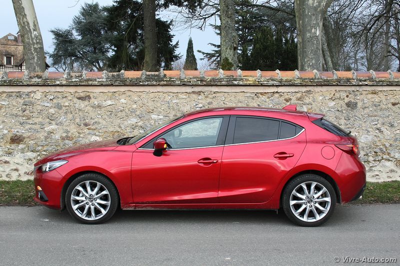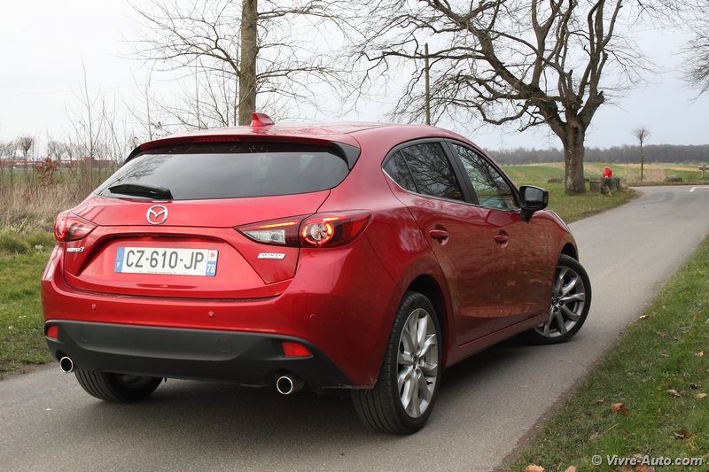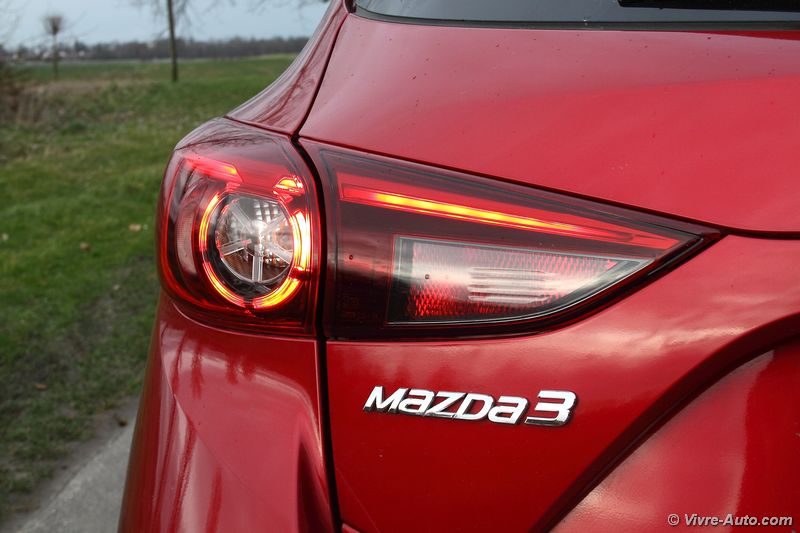 La nouvelle Mazda 3 succède à la deuxième génération après seulement quatre ans. S’inspirant des dernières créations de la marque et empruntant la ligne de style « Kodo », elle apparaît encore plus dynamique qu’avant. Au programme, un long capot, un bouclier avant plus musclé, des feux effilés et une ceinture de caisse plongeante. Plus large et plus basse, elle mesure 4,46 mètres de long, c’est 21 cm de plus qu’une Peugeot 308 ! Son empattement gagne 6 cm. Déclinée en version trois ou cinq portes, en France seule la Mazda 3 cinq portes est proposée. Cette nouvelle génération est 100% inédite, il n’est plus question d’employer la plateforme de la Ford Focus mais celle issue du Cx-5 et de la 6. Globalement, nous la trouvons très séduisante sous tous les angles et elle répond bien aux attentes des consommateur Européens.