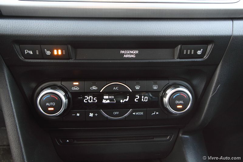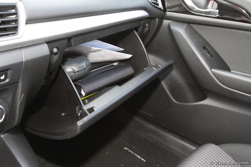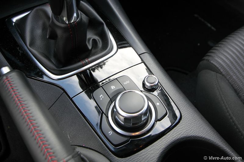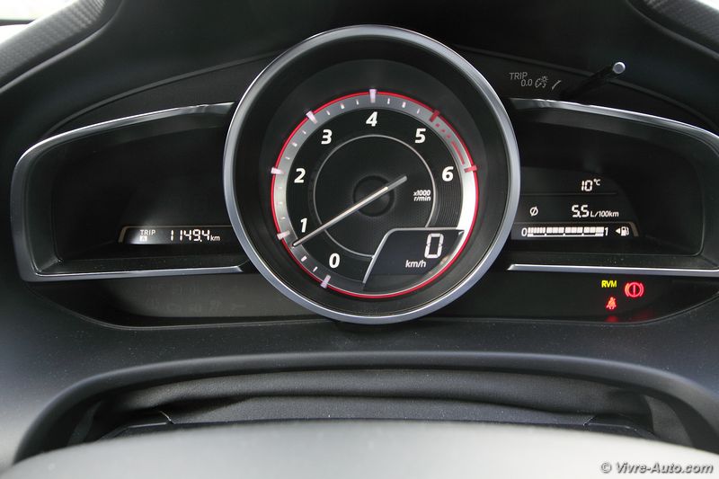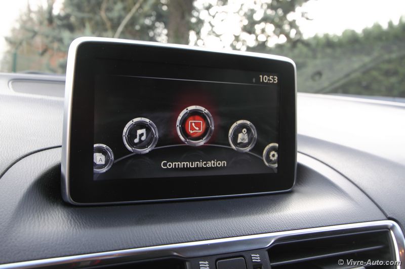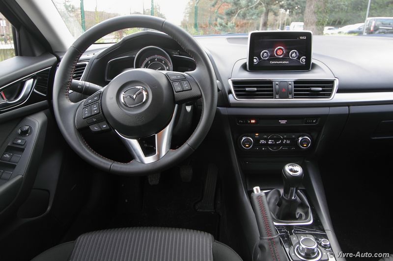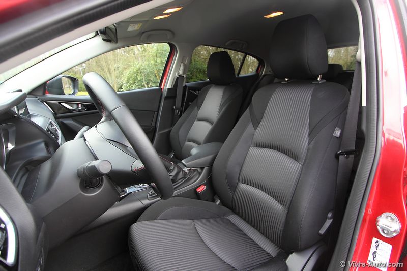 en Diesel le 2.2L Skyactiv-D de 150 ch. C’est avec ce dernier que nous avons pris le volant. Déjà essayé sur les Mazda 6 et CX-5, ce moteur Euro VI est une réussite pour le constructeur. Il développe 150 ch à 4 500 tr/mn et 380 Nm de couple dès 1 800 tr/mn. Souple à bas régime il se réveille rapidement et offre de bonnes reprises. Avec 1 320 kg sur la balance les performances de ce moteur sont très proches du 2.2L de 185 ch qui équipait l’ancienne génération. La commande de boîte de vitesse est précise et parfaitement guidée. La consommation mixte annoncée est de 4,1 l/100 km, après plusieurs kilomètres mêlant autoroute et agglomération nous avons obtenu une moyenne de 5,5 ce qui est une très bonne note au vue de la puissance. Le comportement routier est irréprochable, rien à redire, le train avant s’inscrit en courbe sans broncher et la direction est précise. Petite précision notre modèle d’essai était doté de jantes 18 pouces avec des pneumatiques Dunlop Sport Maxx. La monte 16 pouces est chaussée de Toyo à faible résistance de roulement qui se montrent bien moins convaincants… mais plus confortable.