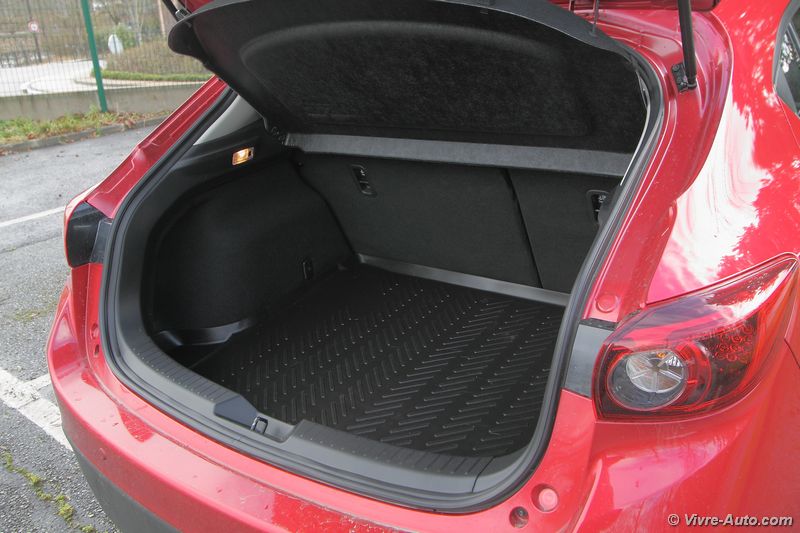 visibilité arrière n’étant pas le point fort de cette compacte on aurait apprécié voir derrière. Il est possible que le constructeur ajoute un jour au catalogue cet équipement puisqu’il est disponible au Japon… La position de conduite est bonne avec des sièges qui offrent un excellent maintien. Pour l’arrière, les passagers disposent d’un espace correct mais dans la moyenne de la catégorie, pour une voiture de ce gabarit on s’attendait à mieux. Les rangements à bord sont peu nombreux, les bacs de portes n’offrent qu’un petit espace à bouteille et la boîte à gants n’est pas réfrigérée. Le coffre offre 364 litres de chargement, tout comme l’espace arrière, on aurait pu imaginer plus de volume, une Golf, moins longue de 20 cm offre 380 litres.