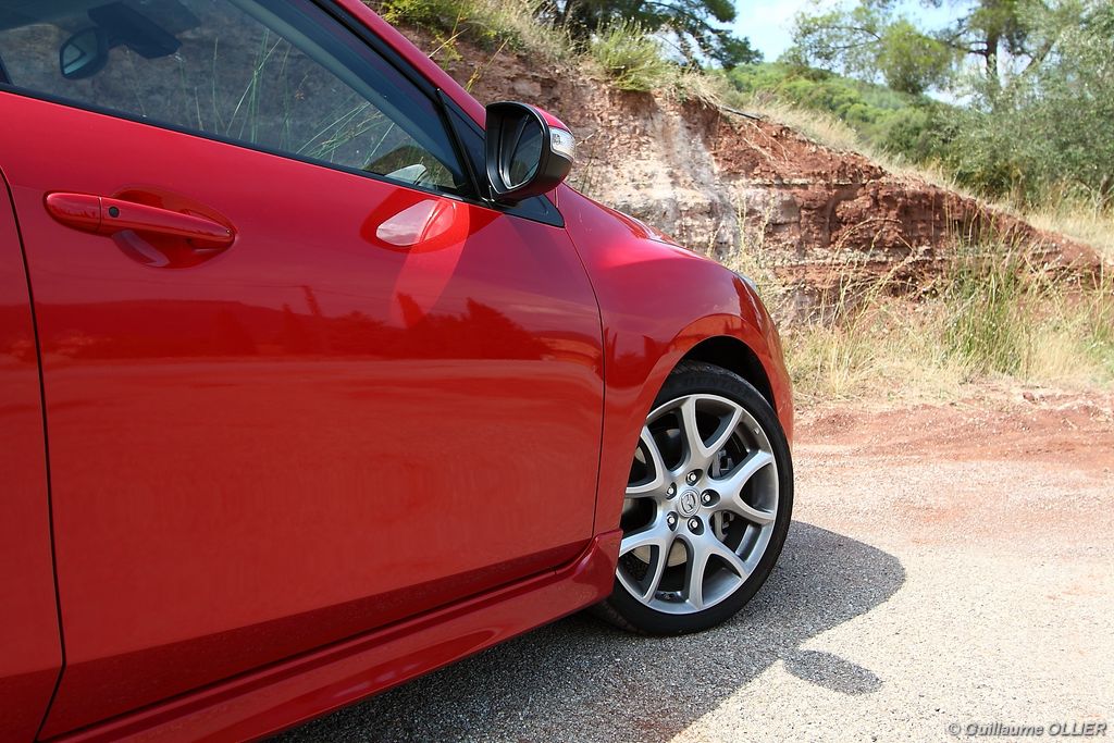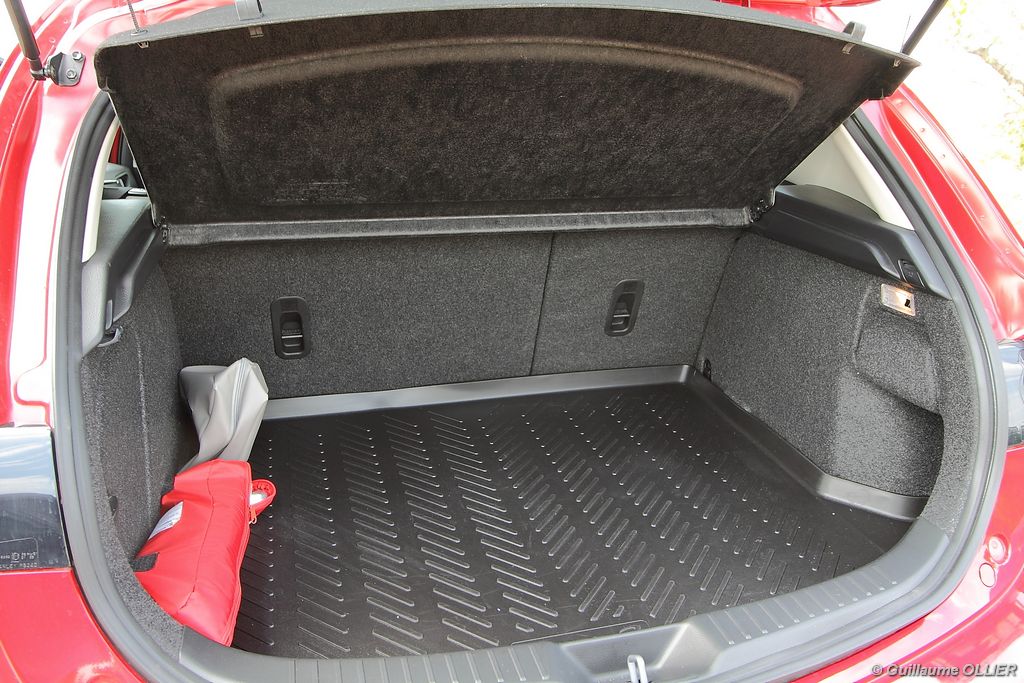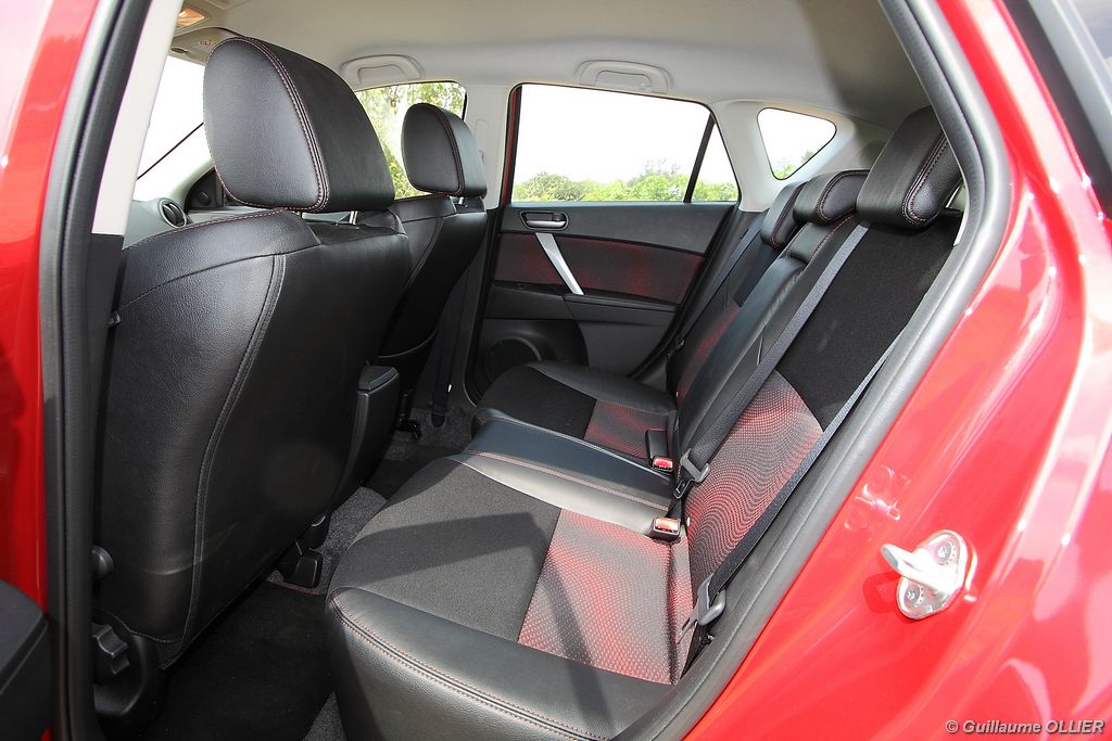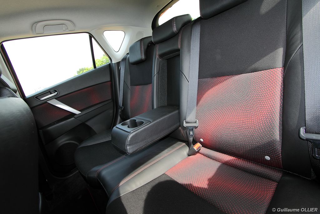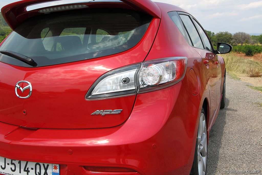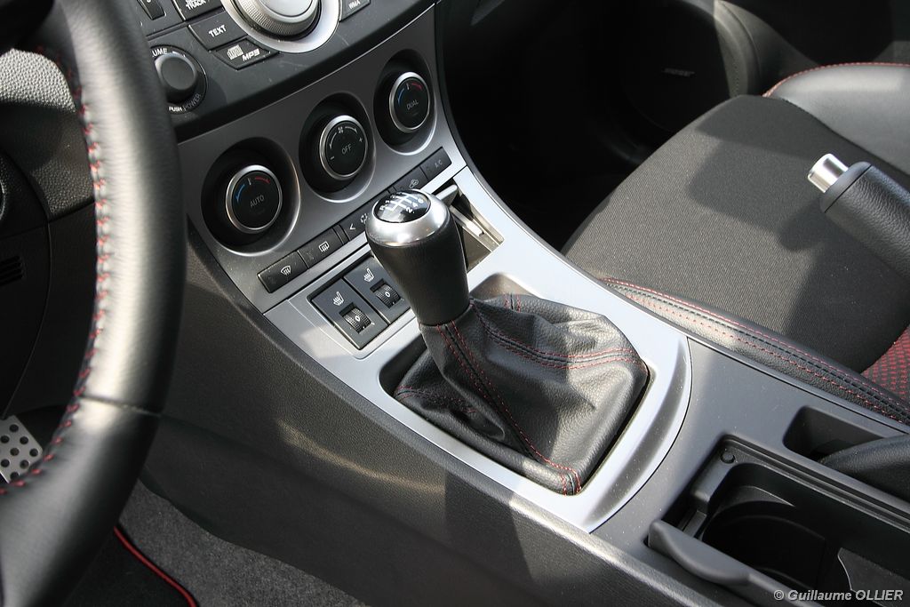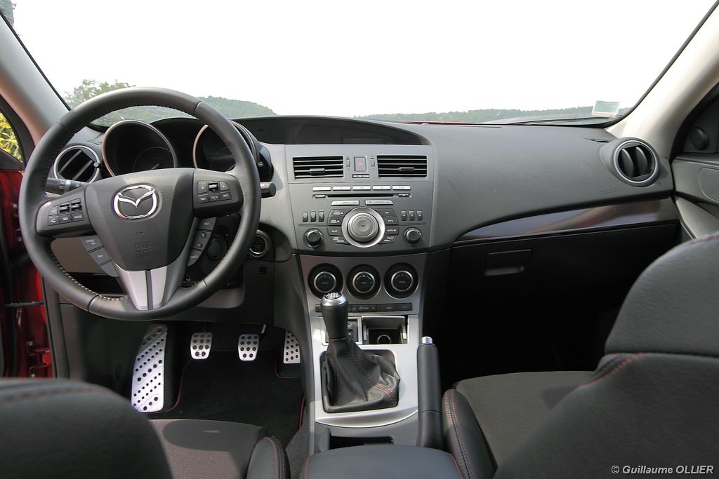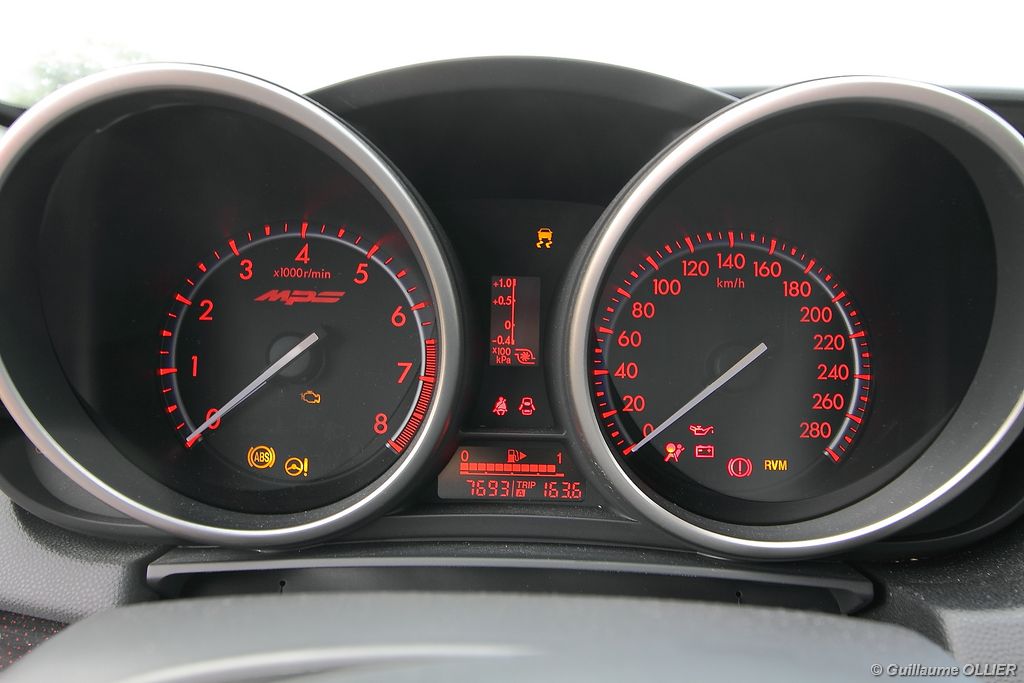 L’habitacle est plutôt soignée et la qualité des assemblages est sérieuse. Les sièges mi-cuir intègrent des éléments graphiques de couleur rouge, et des surpiqûres rouges se trouvent également sur les contre-portes, le soufflet du levier de vitesse, le volant et l’accoudoir central. Le compte-tours se pare du logo MPS, et un manomètre LCD de pression de suralimentation est situé entre les deux compteurs. Le poste de conduite est bien étudié avec une ergonomie simple. A noter la présence d’un éclairage interactif, des lampes au niveau du plancher et d’autres intégrées dans les poignées, complètent l’éclairage habituel. Le verrouillage sans clé est très appréciable, et on s’habitue vite à ce confort. Au chapitre vie à bord, le conducteur et le passager sont confortablement installés, et les sièges ont un bon maintien. En revanche à l’arrière l’espace aux jambes des passagers n’est pas très spacieux mais l’accès est facile puisque contrairement à la majorité des compactes sportives la MPS dispose de cinq portes. Le coffre est généreux avec ses 300 litres. Très carré, il possède une faible hauteur, ce qui permet le chargement de plusieurs bagages. La banquette arrière est rabattable en 1/3 2/3. L’intérieur nous a séduits, il a tout d‘une grande routière, d’autant plus que la MPS est plutôt riche en équipements