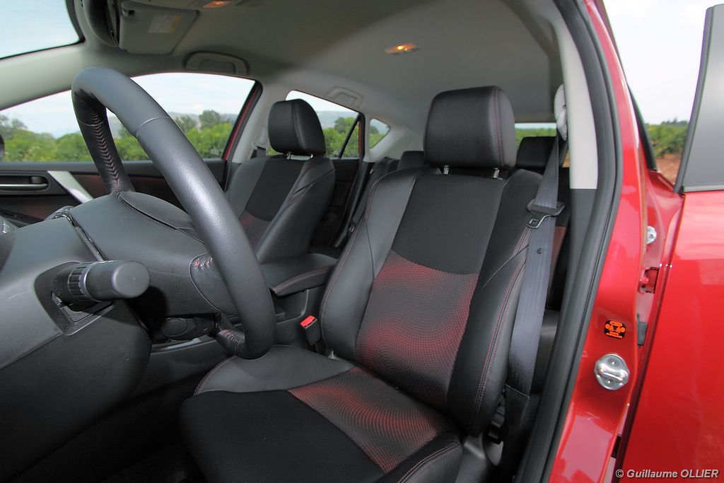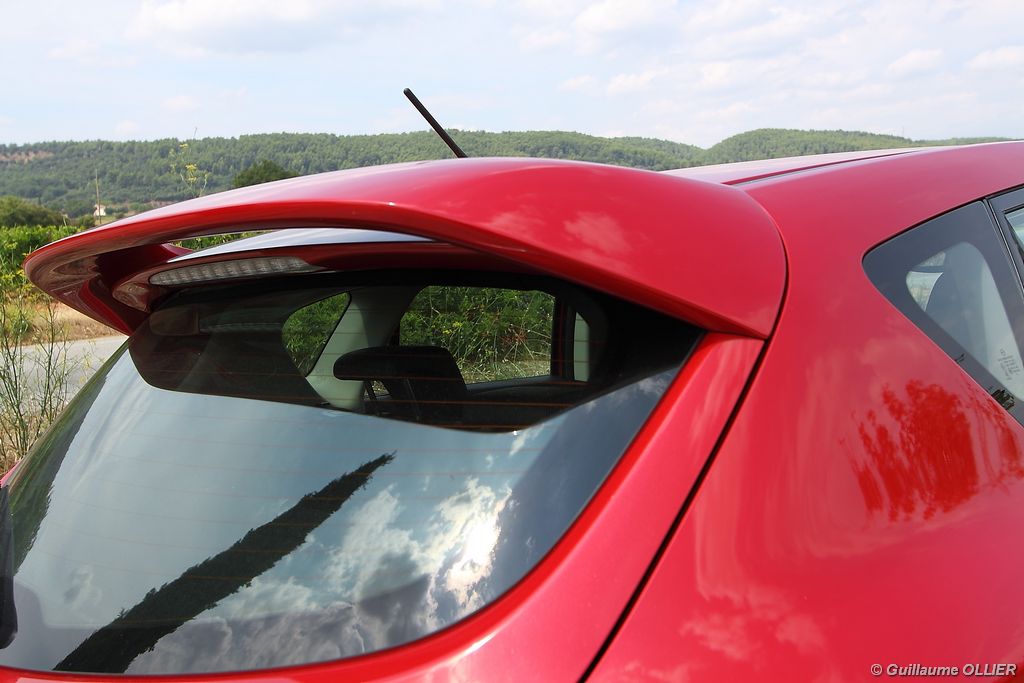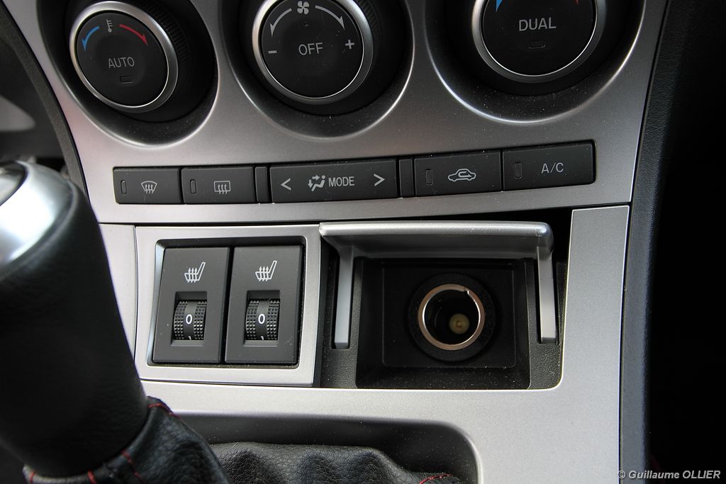 Mazda souligne ici encore son point fort, la richesse des équipements de série. Il n’existe bien sûr qu’une finition, et qu’une seule option au catalogue français : l’extension de garantie de deux ans facturée 690 €. Les équipements de série sont les suivants : climatisation bizone automatique, sièges chauffants, GPS, kit main libre Bluetooth, système audio BOSE MP3 avec 10 hauts parleurs et chargeur 6 CD, phares avant bi-xénons directionnels, alarme, régulateur de vitesse, allumage automatique des feux & détecteur de pluie, radar de stationnement arrière, système d’alerte de véhicule en approche. Le GPS couleur est très bien placé au sein de la planche de bord, il tombe sous les yeux et permet une concentration plus accrue. La voix est agréable, et malgré les 4,1 pouces de superficie, l’écran reste visible. Son fonctionnement reste simple, mais l’absence de plusieurs noms de rues nous a laissés perplexes quant à ses connaissances… Nous avons apprécié le détecteur d’angle mort, il s’avère très utile sur route. Enfin le lecteur multimédia permet la connexion d’une prise Jack, ou encore le streaming Bluetooth. Il manque toutefois la possibilité de connecter un lecteur audio sur une prise USB. La qualité de son est au rendez-vous avec le kit BOSE et une bande bleutée sur l’autoradio s’éclaire au rythme de la musique pour donner une ambiance sympathique sans pour autant faire tuning.